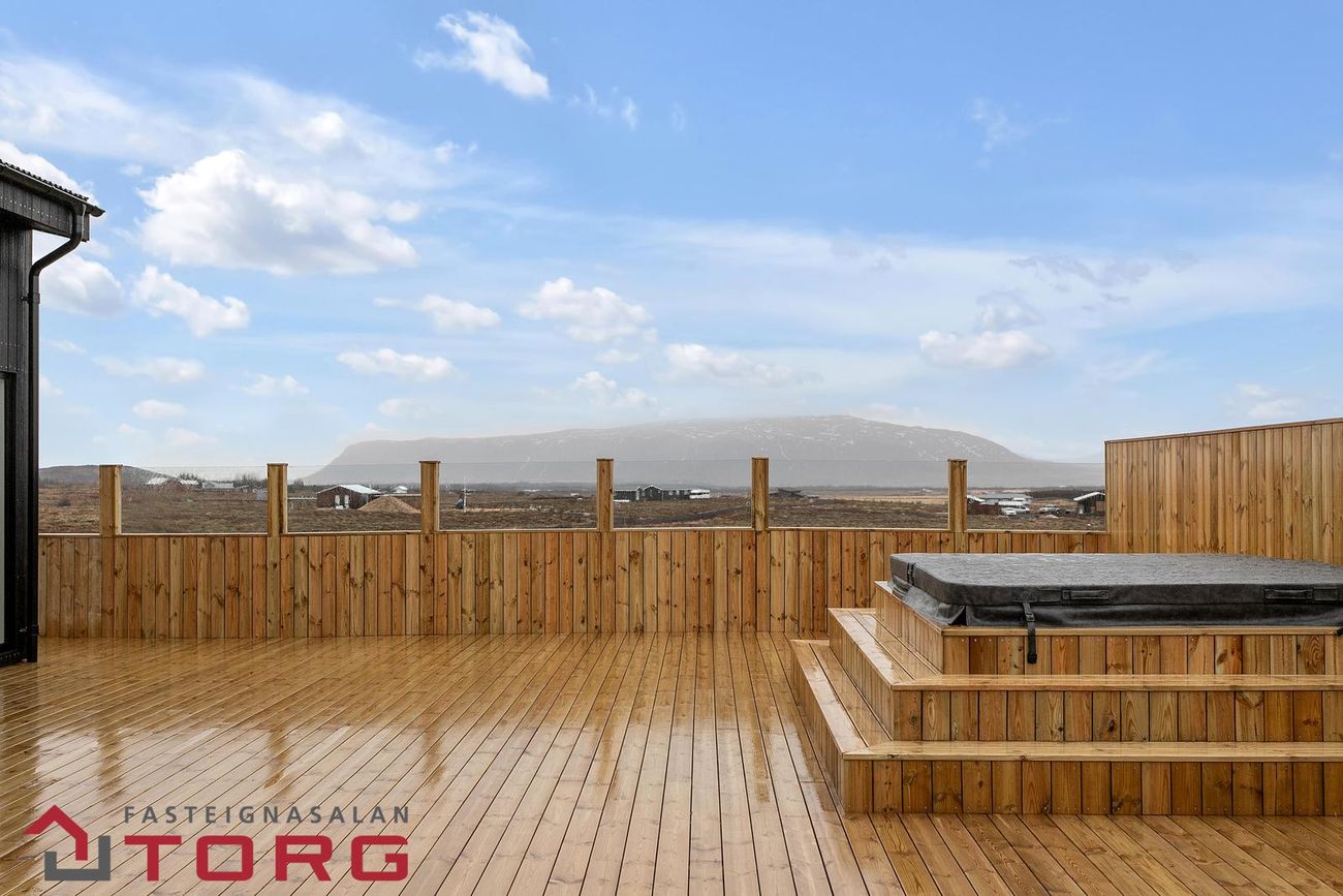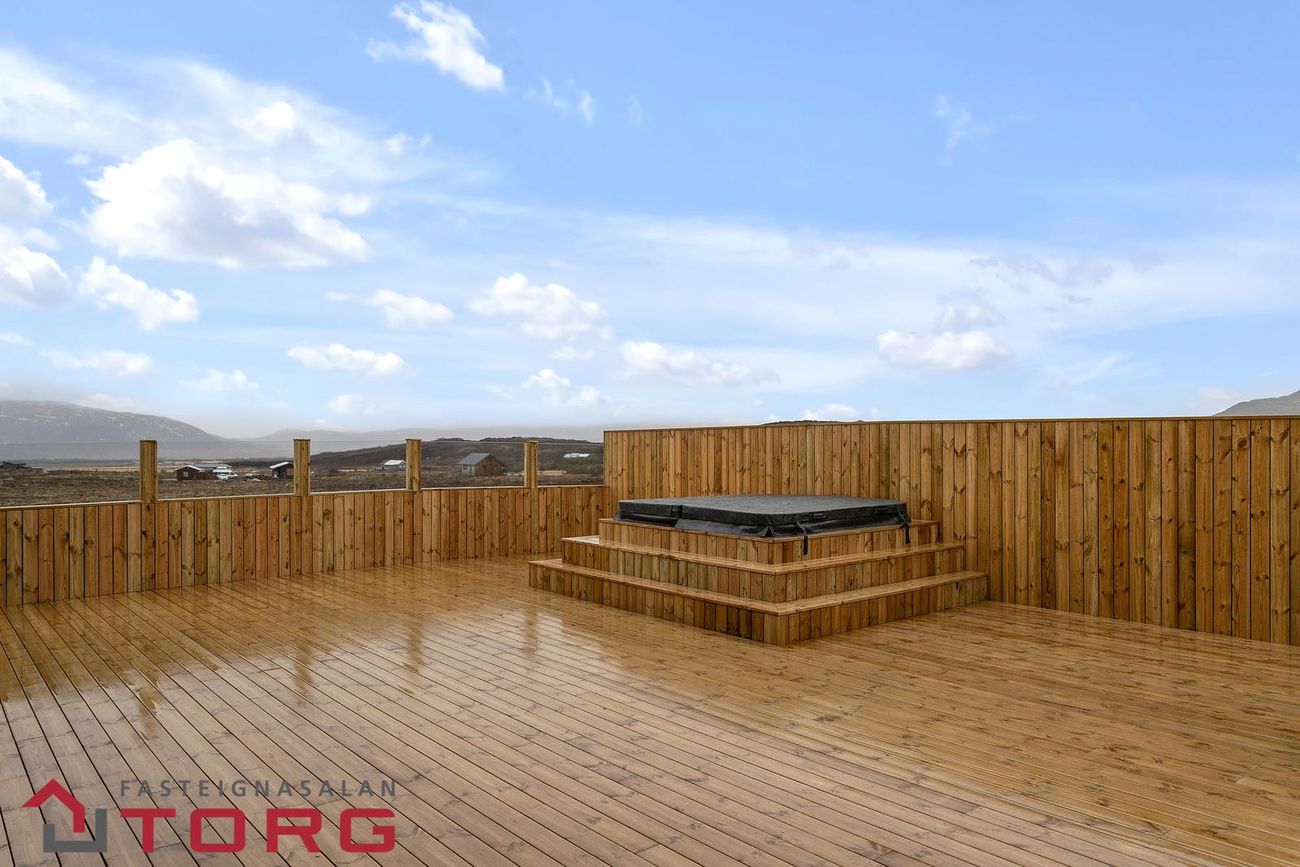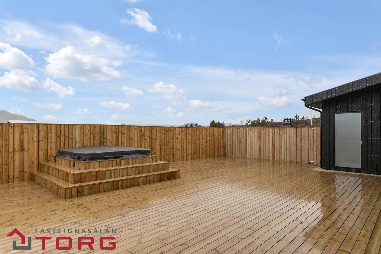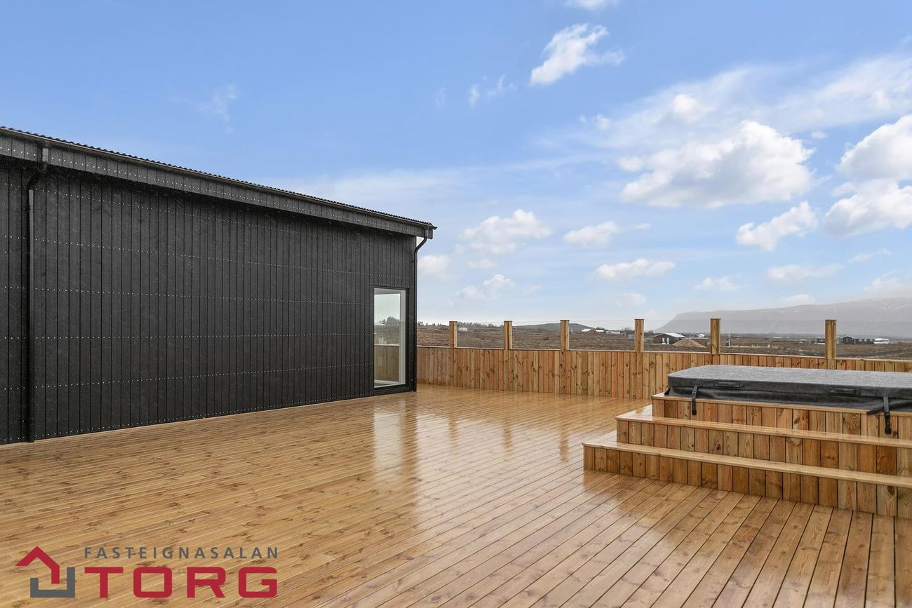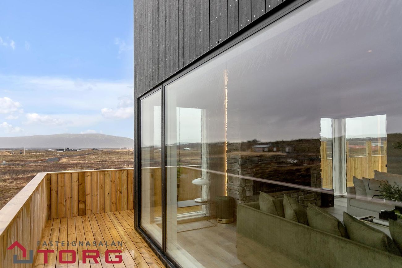 Stór timburverönd er við hús, með heitum potti. Hitaveita er í húsinu, gólfsíðir gluggar, mikil lofthæð og gólfhiti ásamt Free@Home hússtjórnarkerfi. Innbyggð lýsing frá Lúmex. Húsið er teiknað af Gláma Kím arkitektastofu.