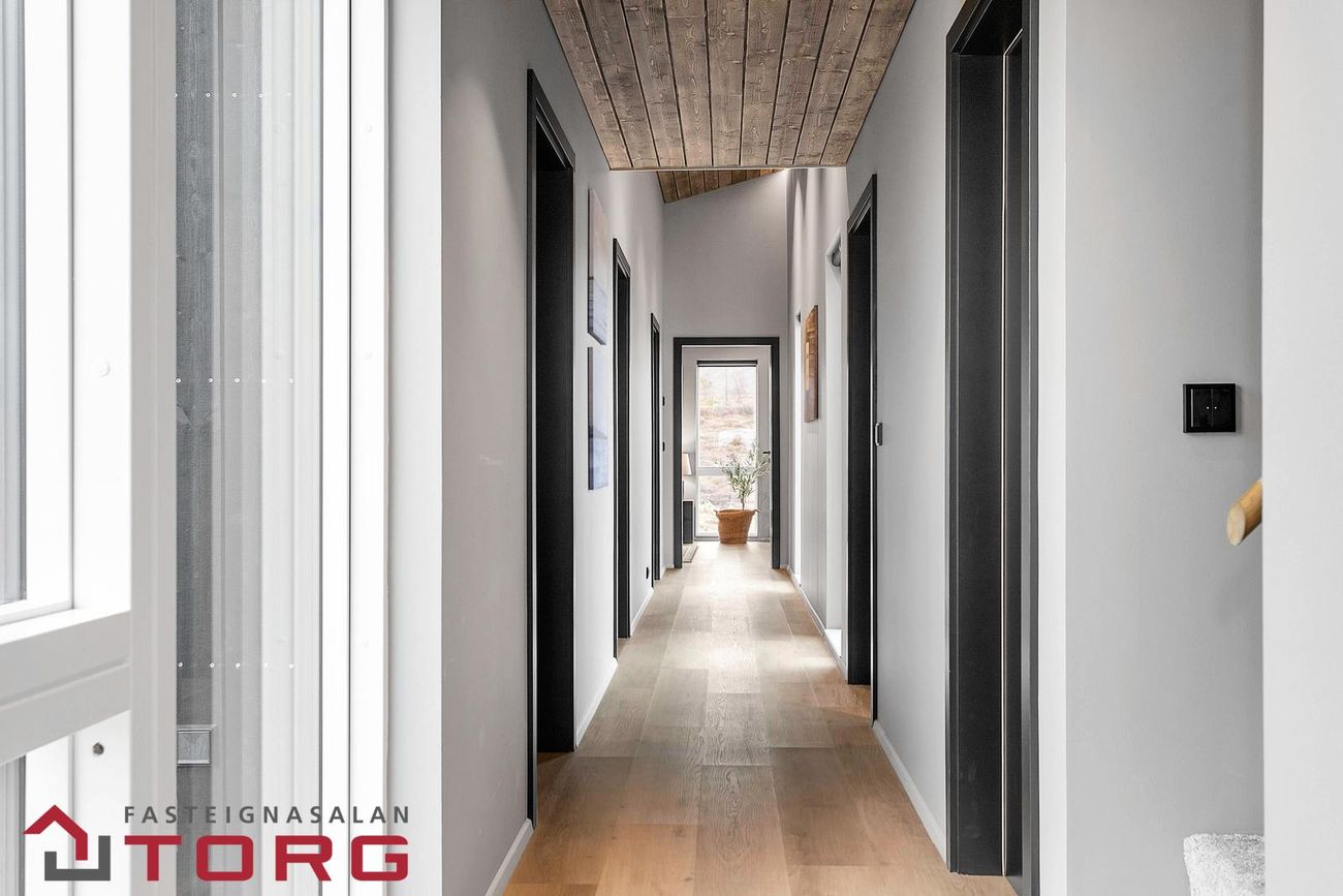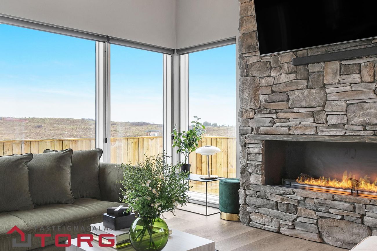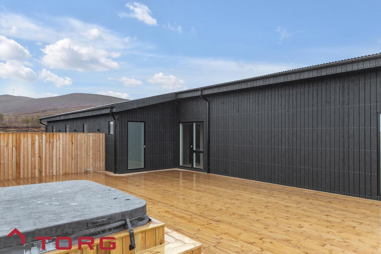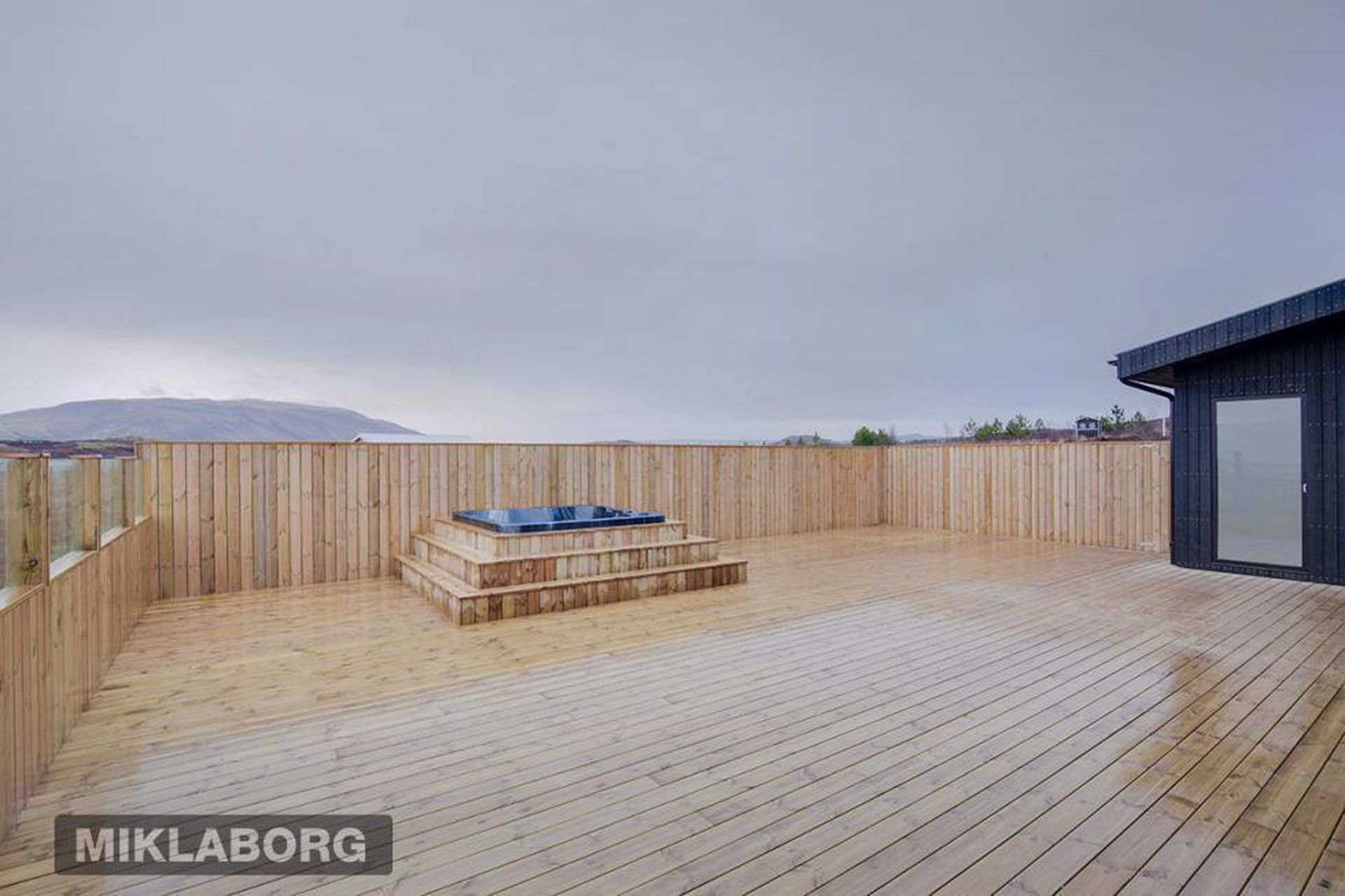 Stór timburverönd er við hús, með heitum potti. Hitaveita er í húsinu, gólfsíðir gluggar, mikil lofthæð og gólfhiti ásamt Free@Home hússtjórnarkerfi. Innbyggð lýsing frá Lúmex. Húsið er teiknað af Gláma Kím arkitektastofu.