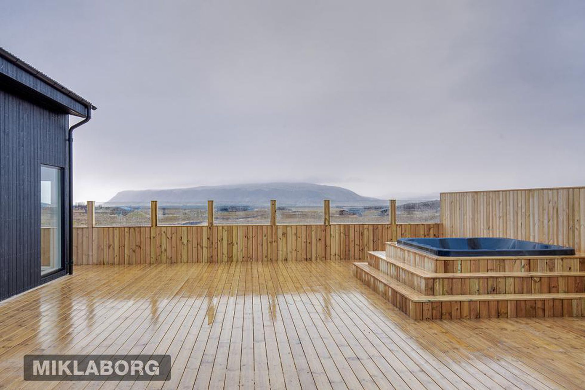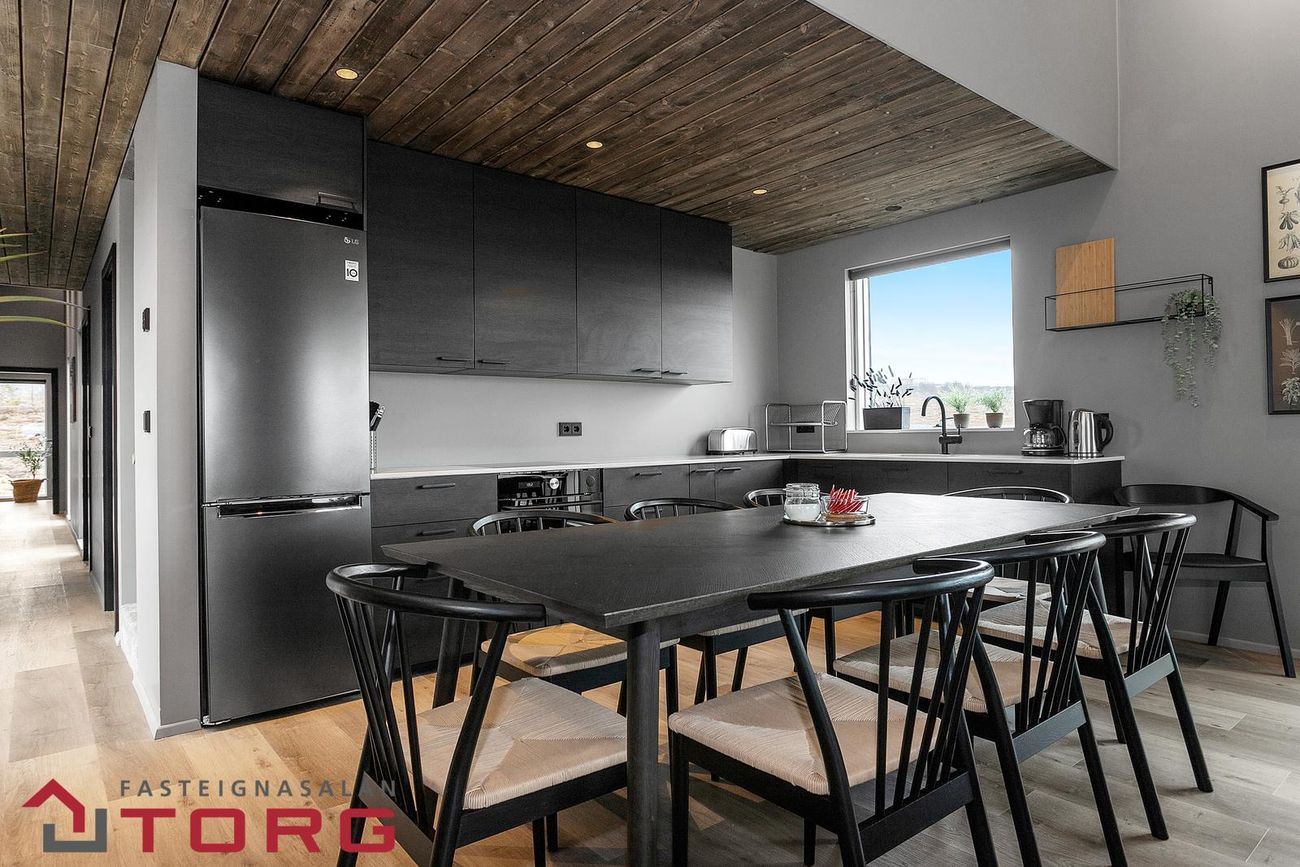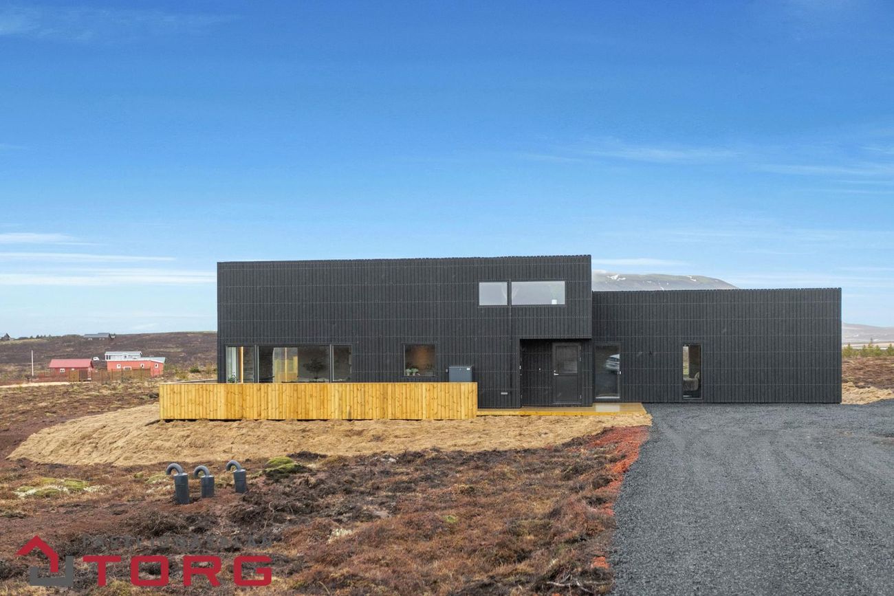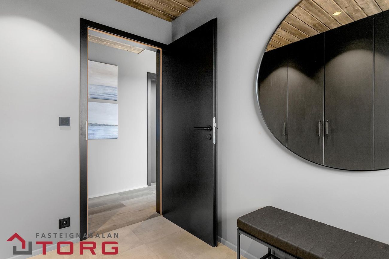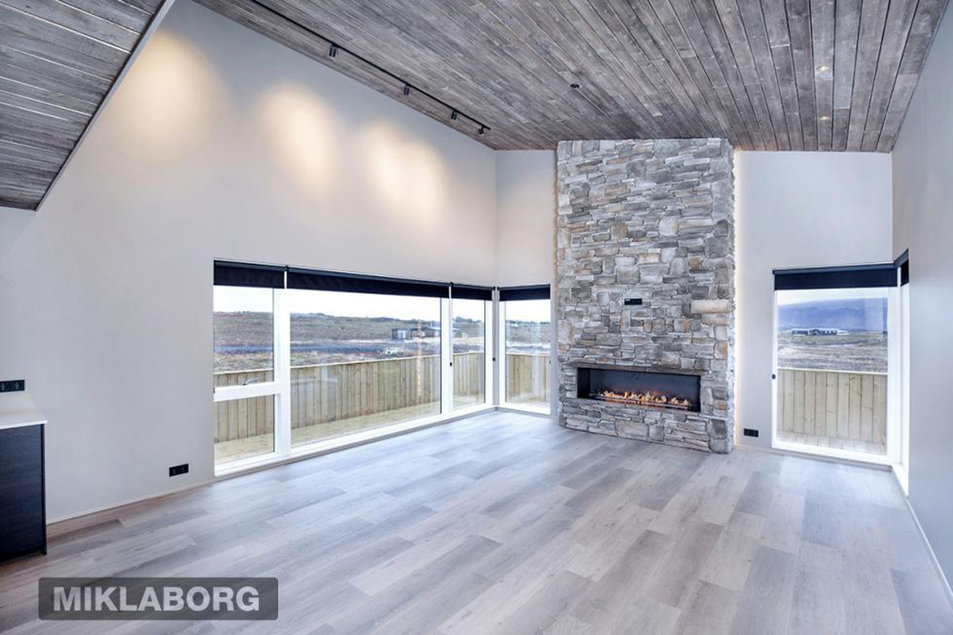 Stór timburverönd er við hús, með heitum potti. Hitaveita er í húsinu, gólfsíðir gluggar, mikil lofthæð og gólfhiti ásamt Free@Home hússtjórnarkerfi. Innbyggð lýsing frá Lúmex. Húsið er teiknað af Gláma Kím arkitektastofu.