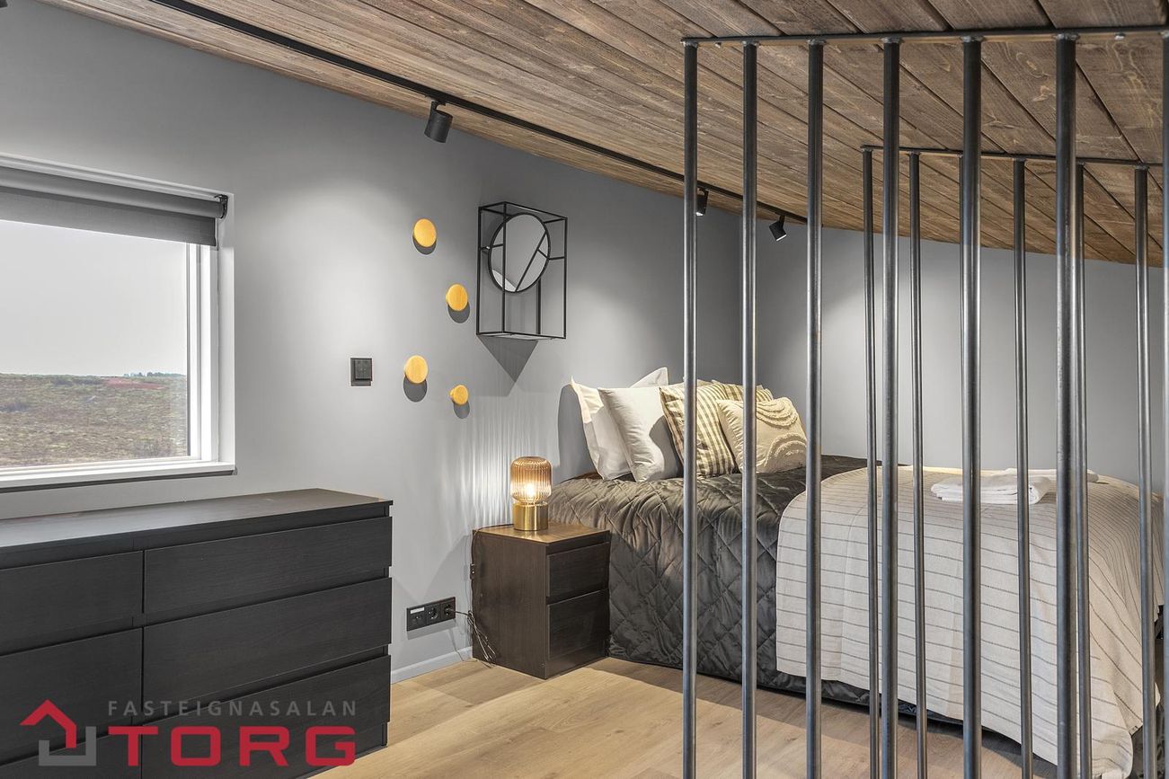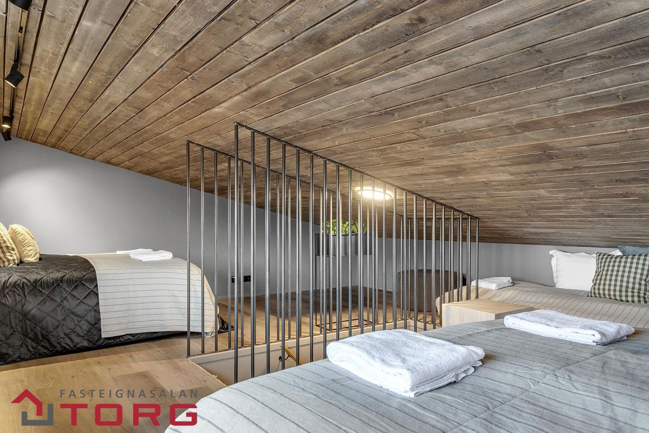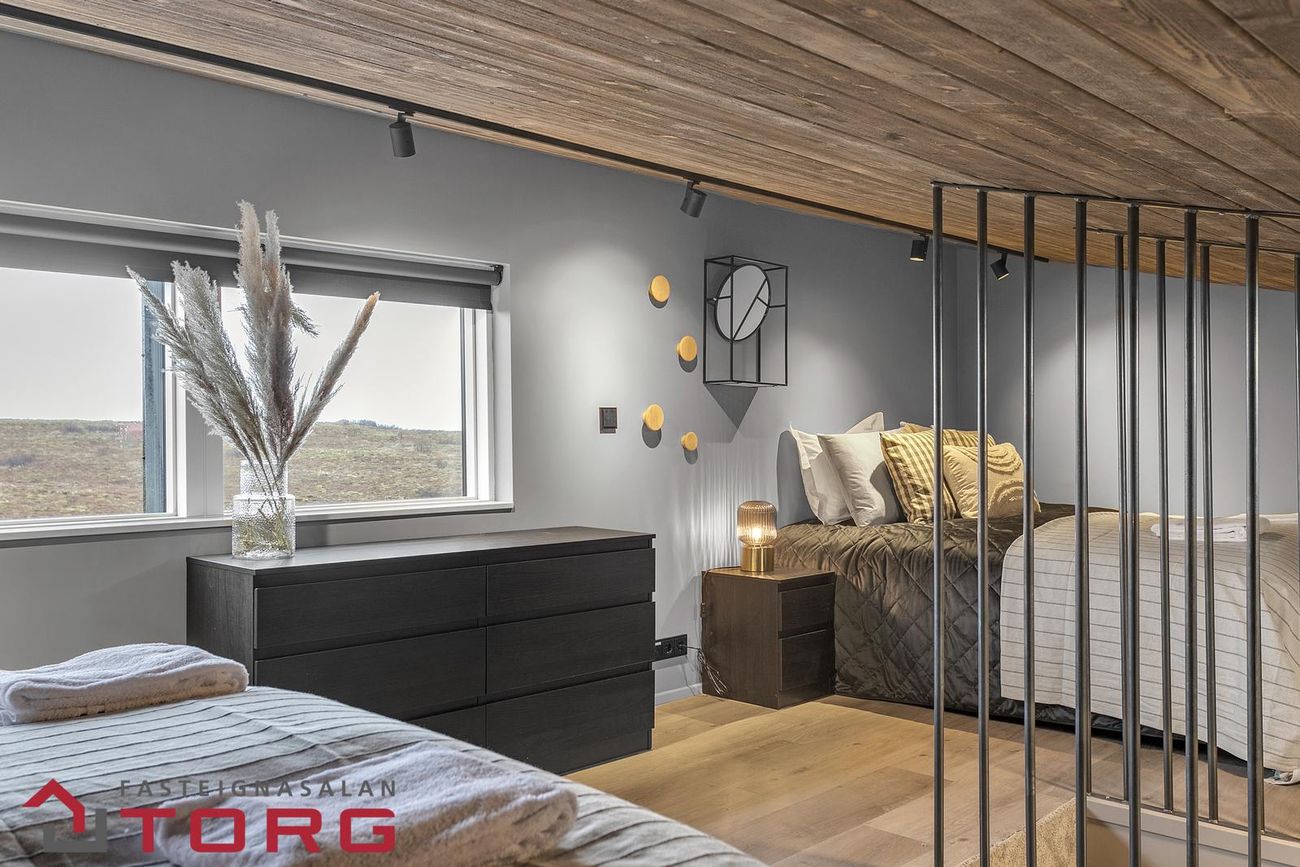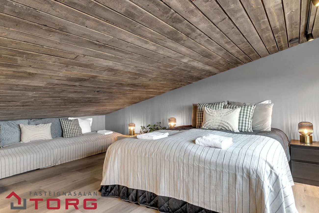 Þrjú svefnherbergi eru í húsi, öll rúmgóð ásamt svefnlofti. Gólfflötur á svefnlofti eru 31,9 fm, en skráð 12,9 vegna lofthæðar.