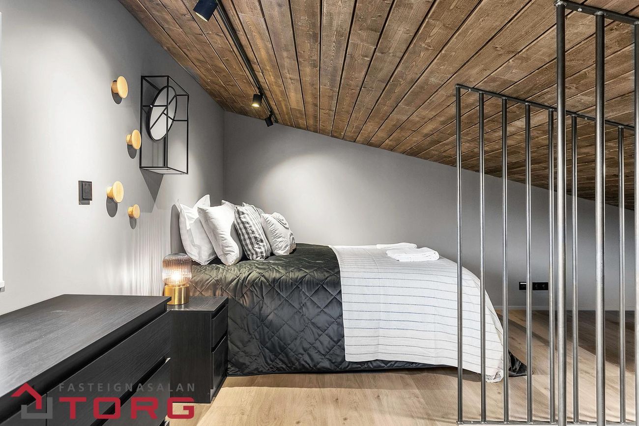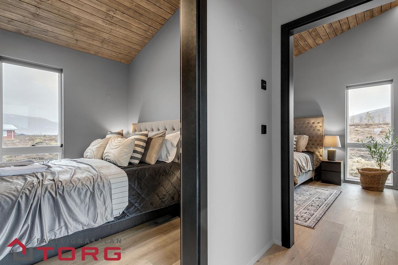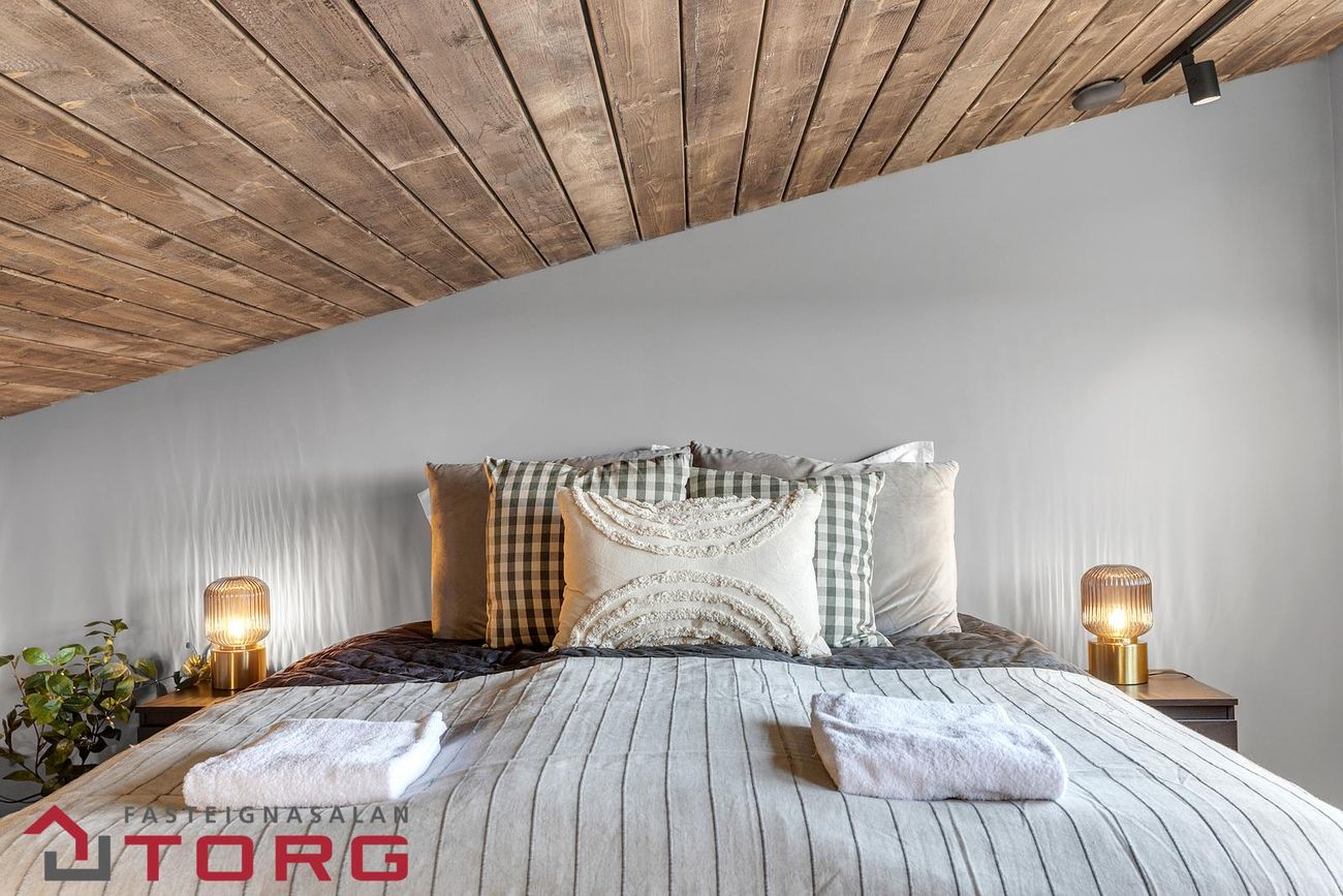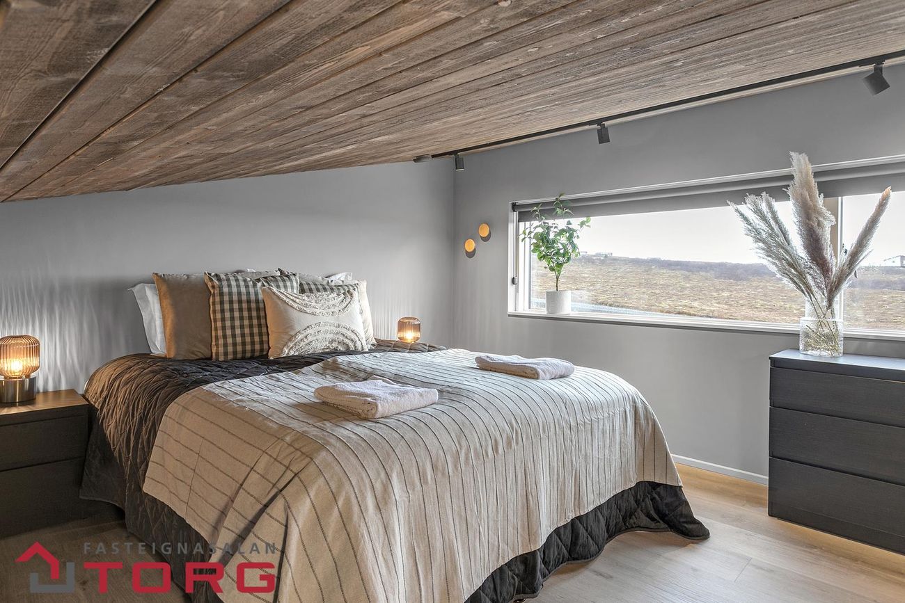 Þrjú svefnherbergi eru í húsi, öll rúmgóð ásamt svefnlofti. Gólfflötur á svefnlofti eru 31,9 fm, en skráð 12,9 vegna lofthæðar.