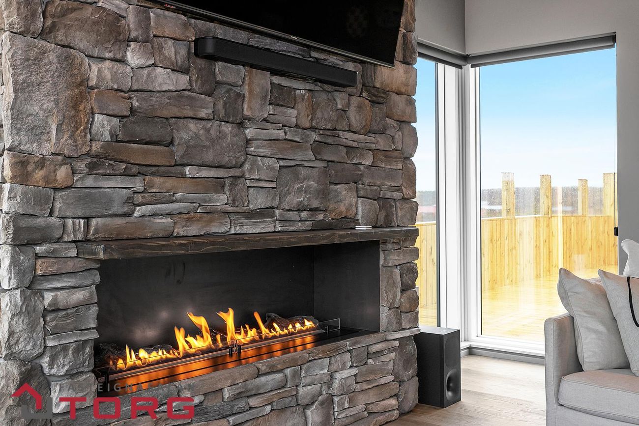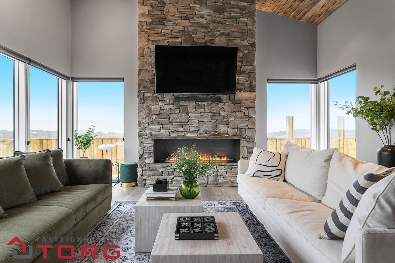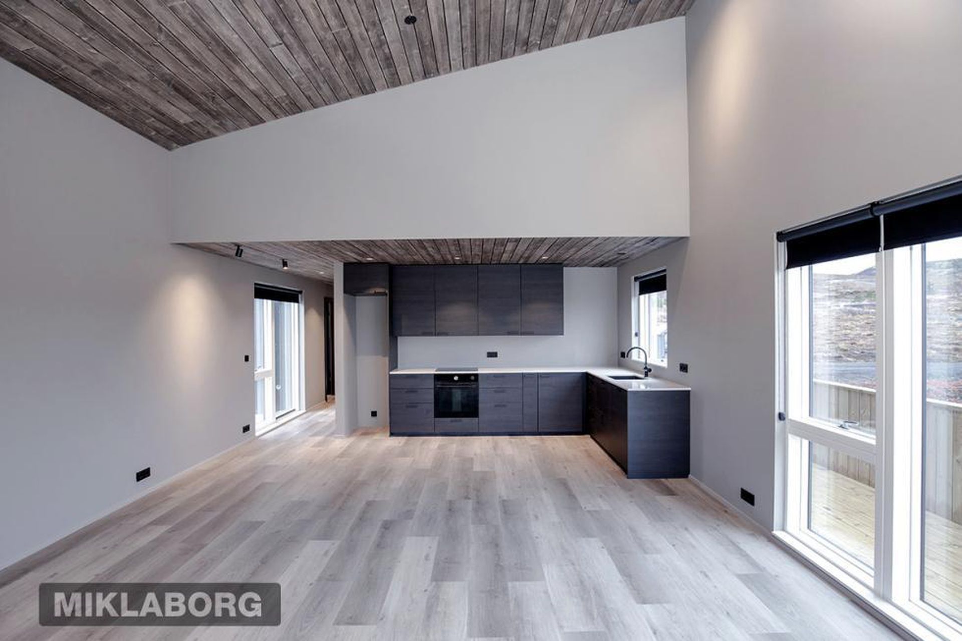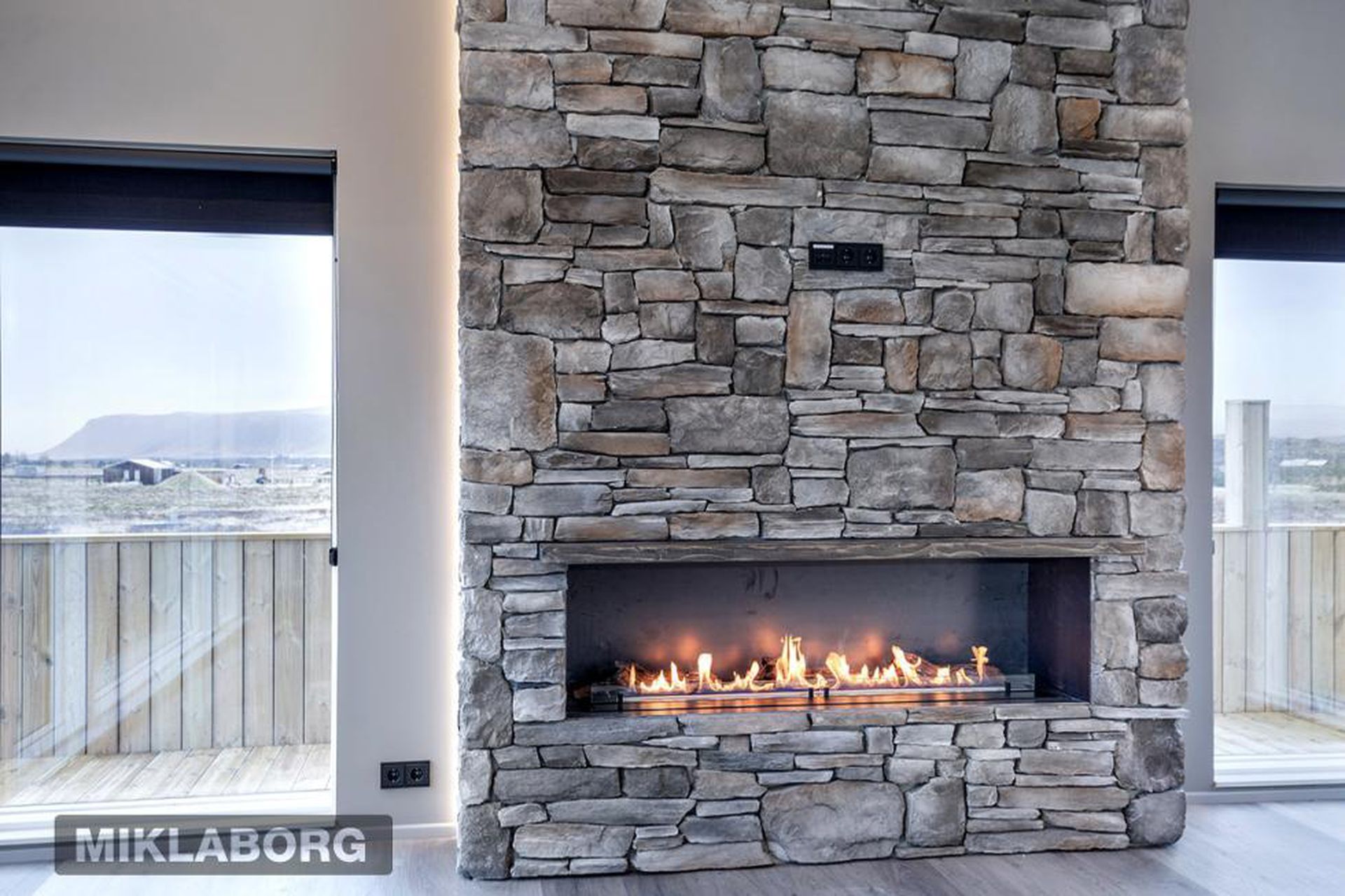 Stofa og borðstofa er í opnu rými með aukinni lofthæð og ethanol arni frá Funa. Gengið er úr stofu út á verönd.