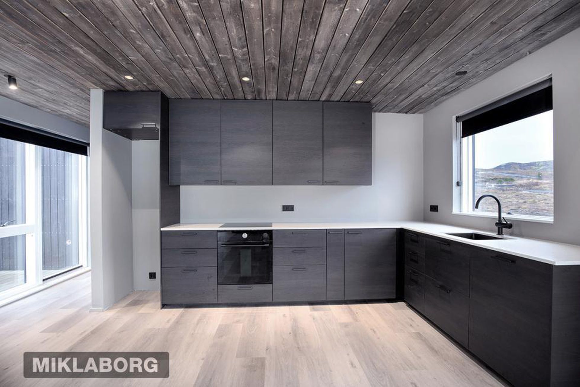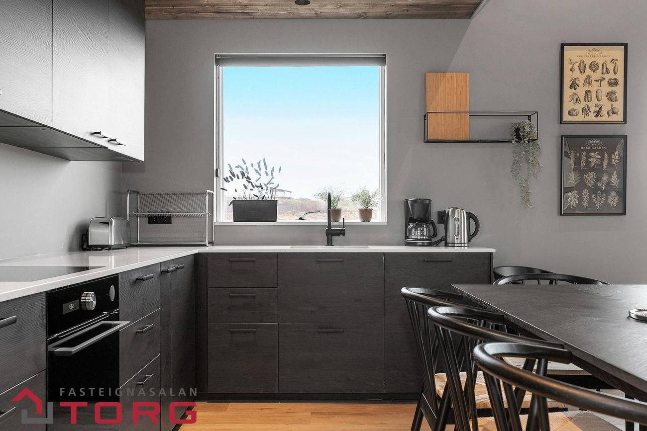 Eldhús er með fallegri, dökkri innréttingu og stein á borði. Innfelldur vaskur og innbyggð uppþvottavél.