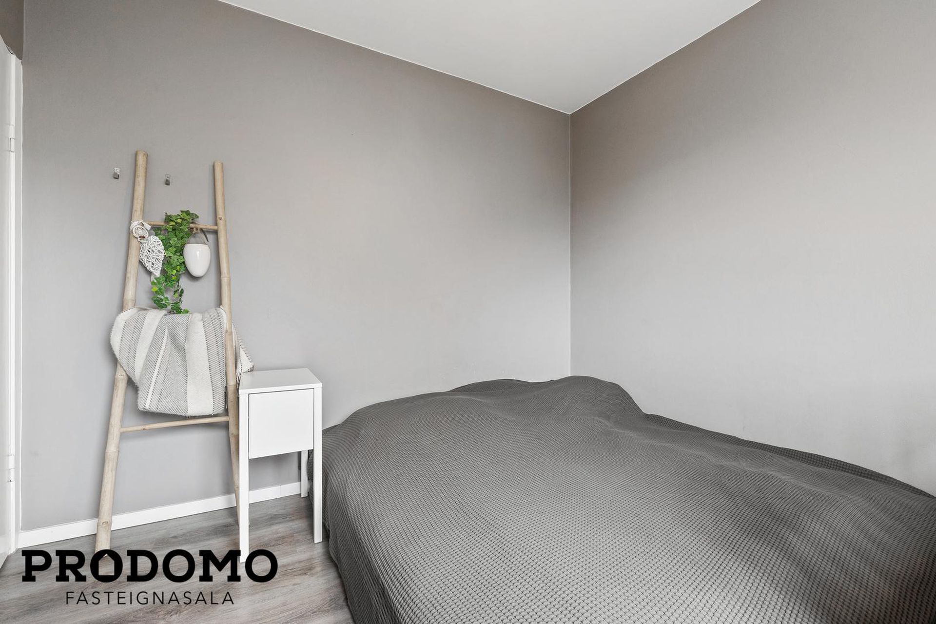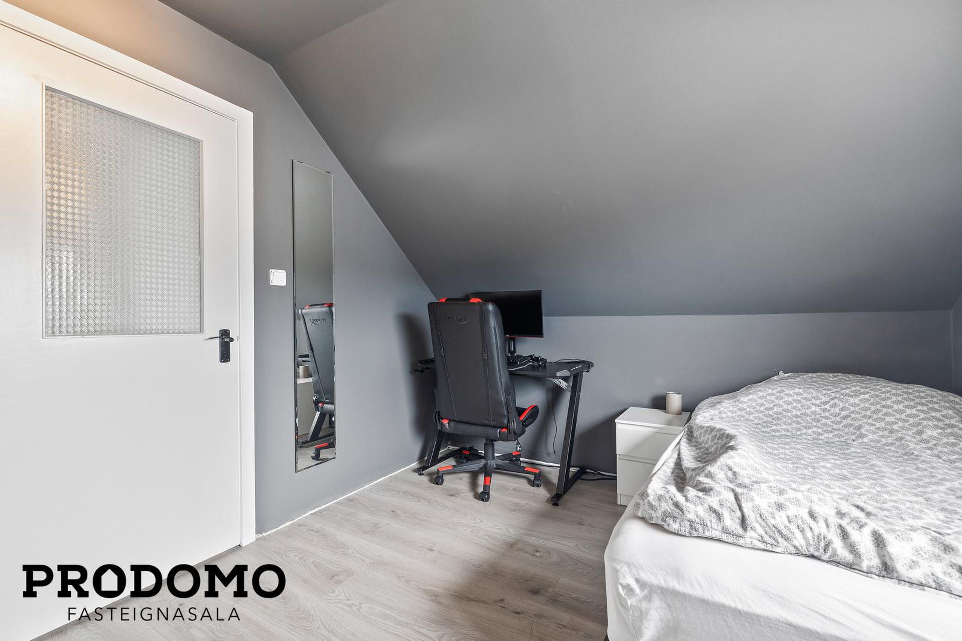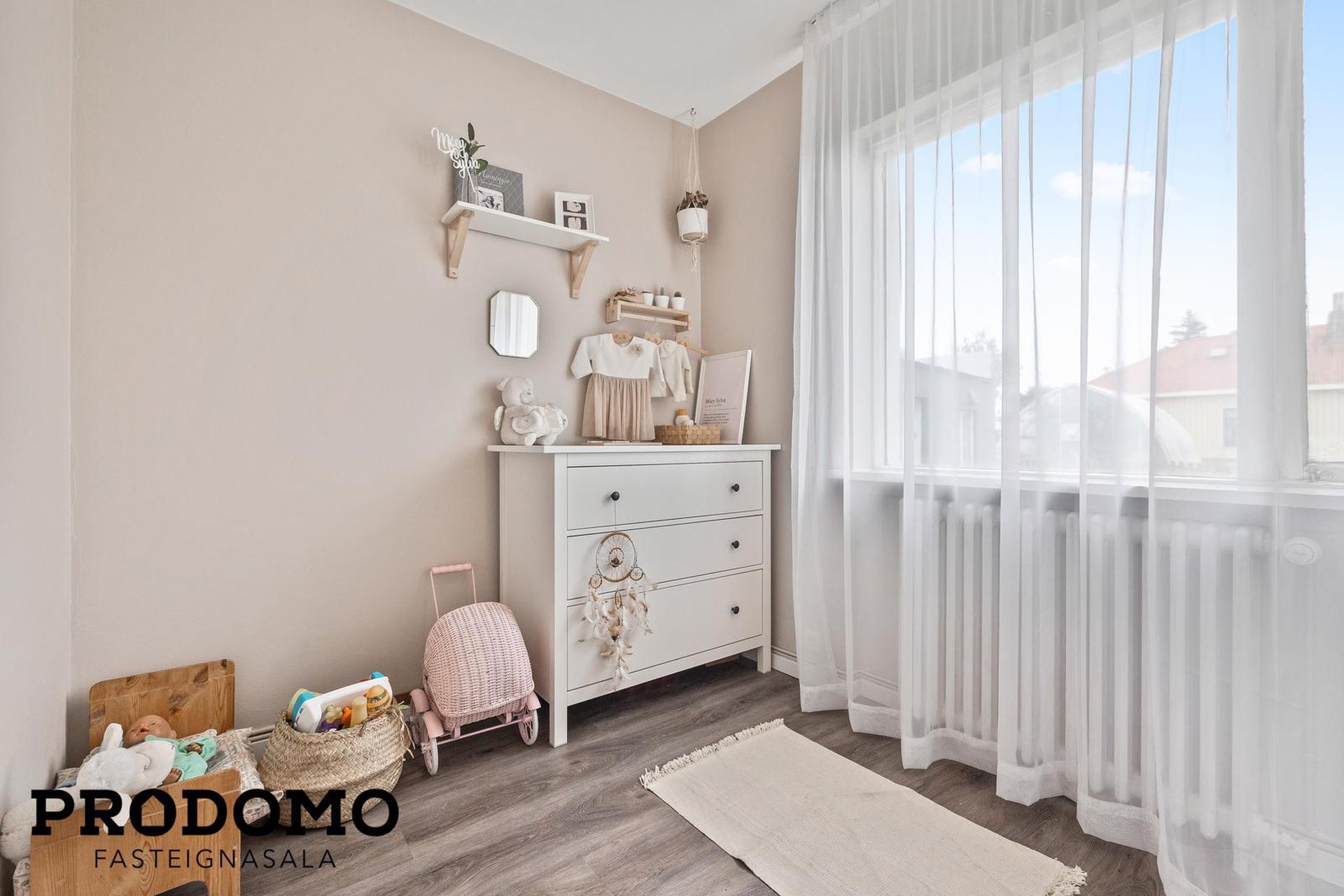 Svefnherbergi eru tvö á neðri hæð. Skápur í þeim báðum og parket á gólfi.