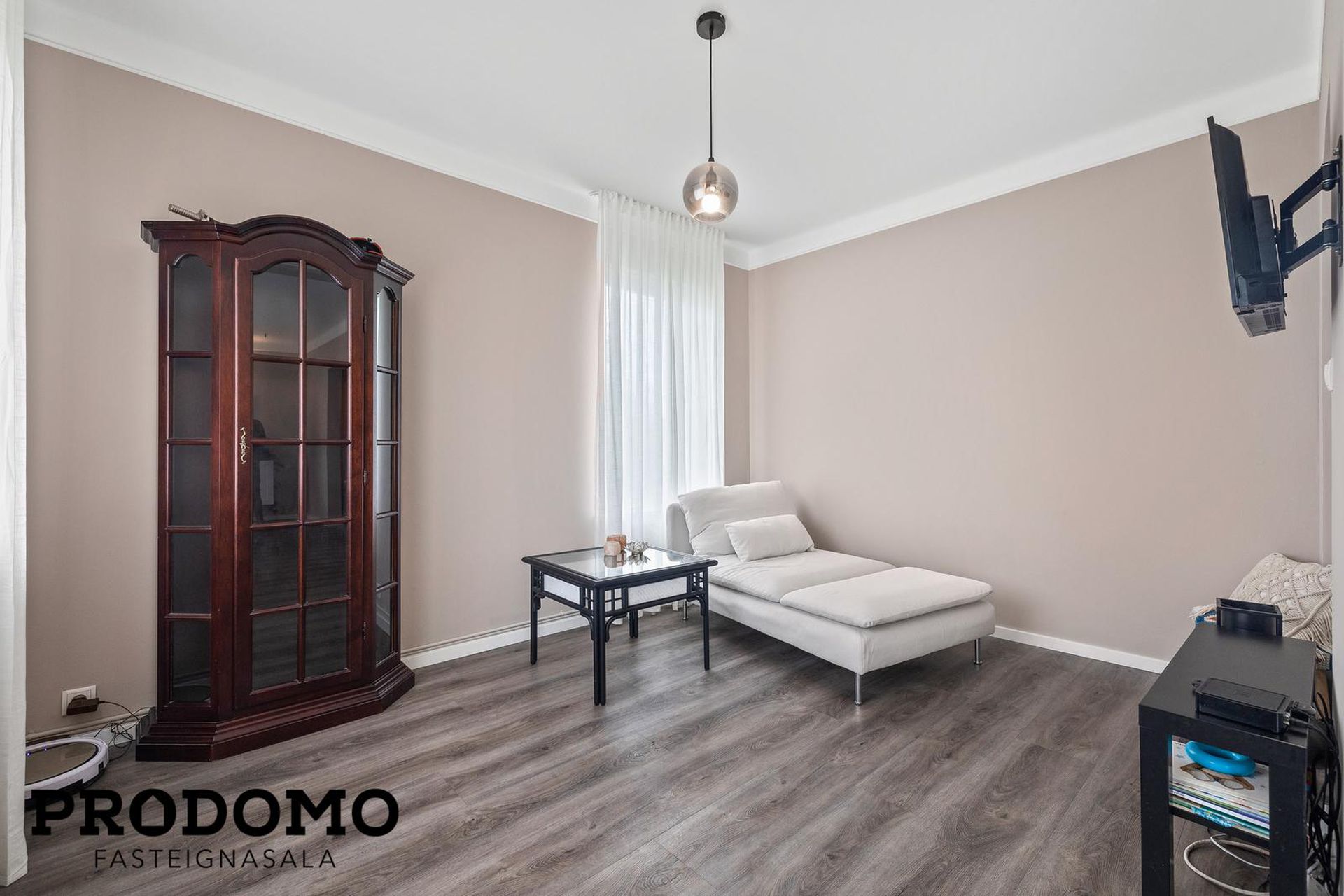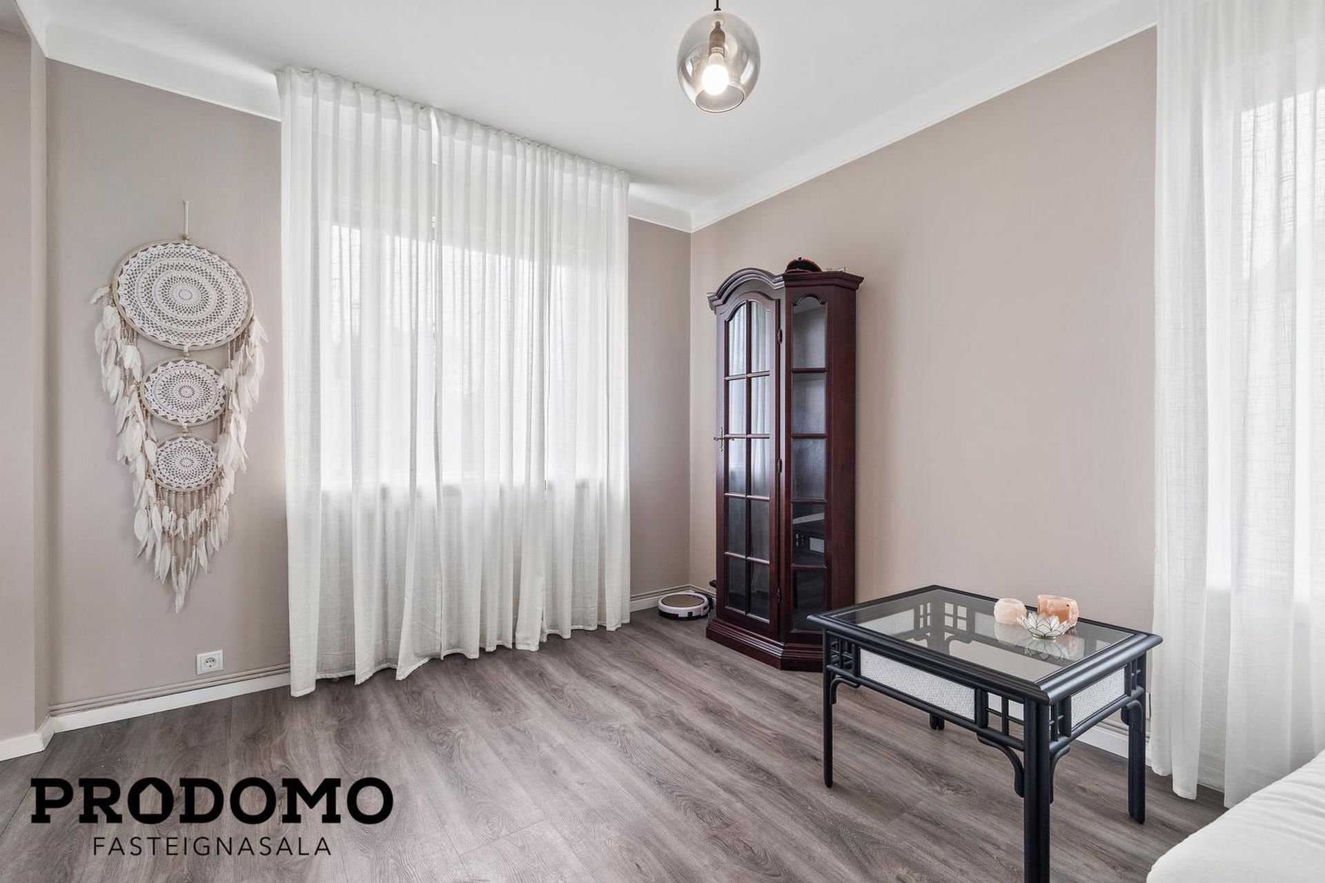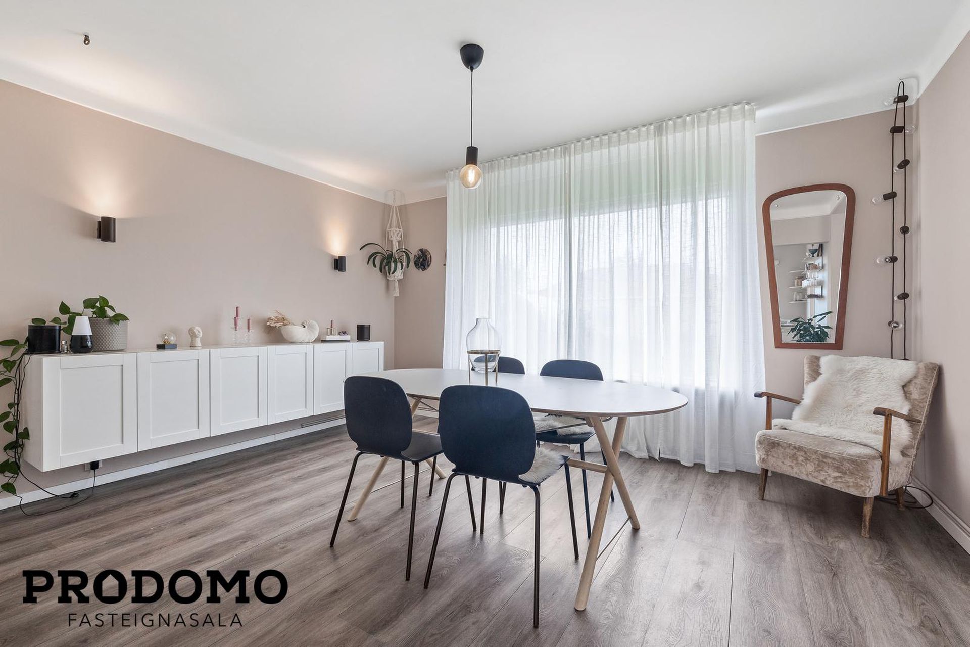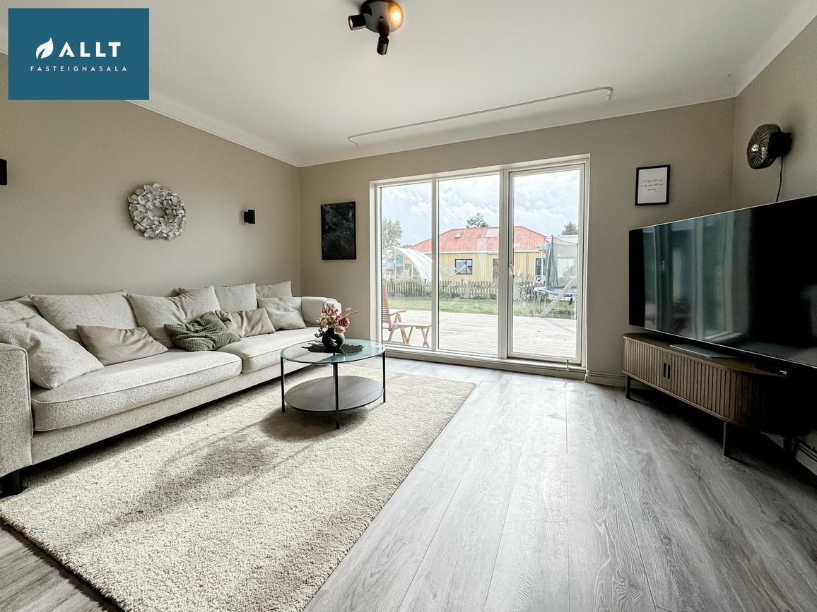 Stofa með parketi og stórum gólfsíðum glugga og útgengi útá pall.