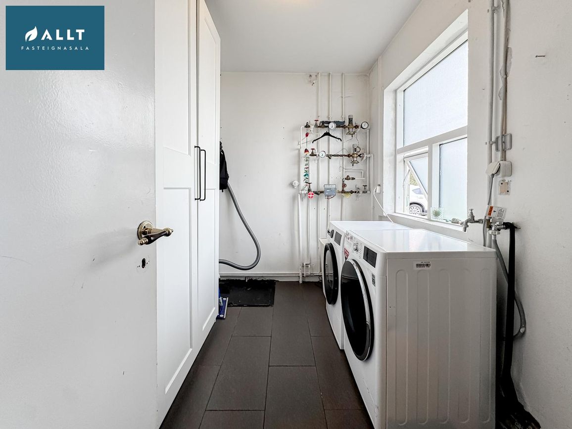 Þvottahús er afar rúmgott og hefur stóran skáp og flísar á gólfi.