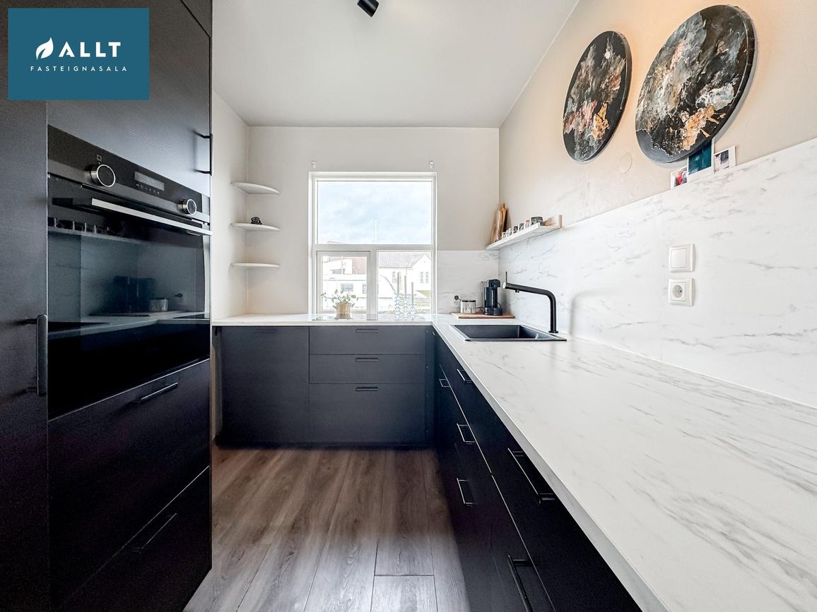 Eldhús hefur nýlega dökka innréttingu og hvíta borðplötu. Nýr ofn í vinnuhæð og span helluborð, innbyggður ísskápur og uppþvottavél.