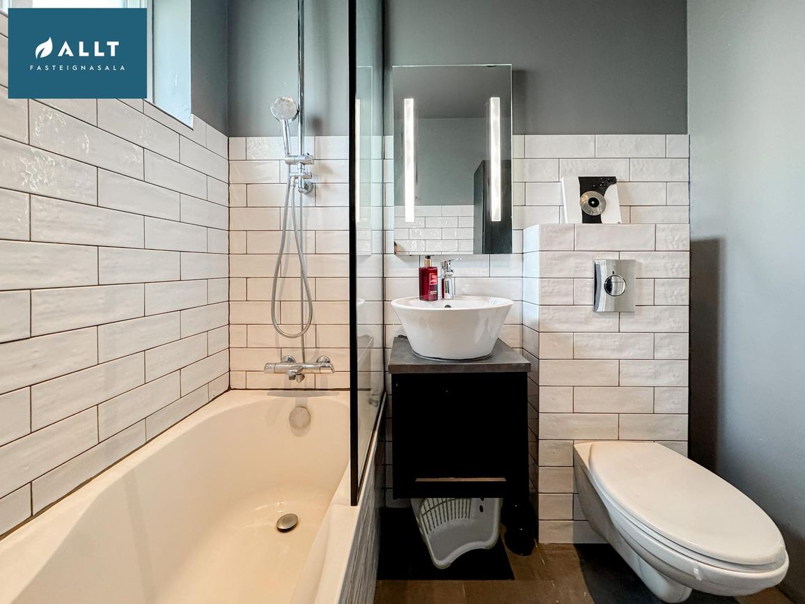 Baðherbergi hefur upphengt salerni, baðkar með sturtu, lítin skáp undir vask og stærri skáp á vegg.
