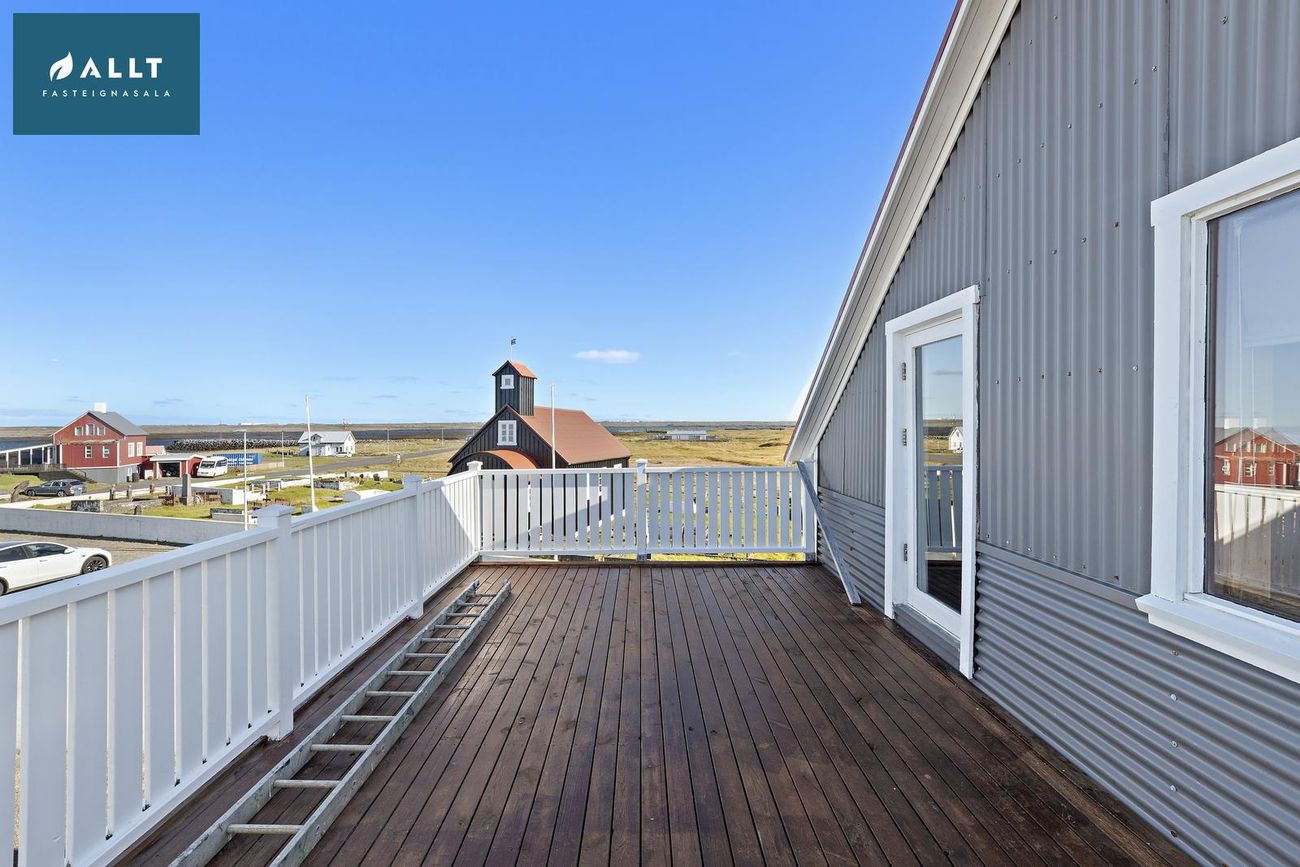 Suðurpallur útgenginn beint úr gangi og svalir á efri hæð með einstöku útsýni.