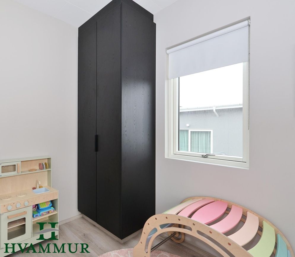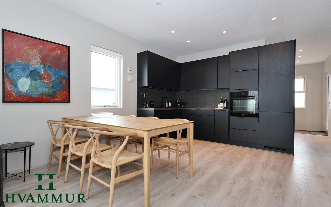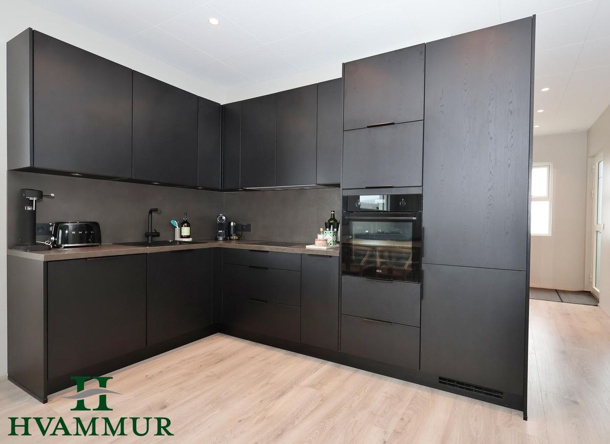 Eldhús, vönduð L-laga svört plastlögð innrétting (Nero oak) með grárri borðplötu og svörtum vask. Mjúklokun er á skúffum og skápum. Uppþvottavél og ísskápur með frysti eru innbyggð í innréttingu og fylgja með við sölu eignar.