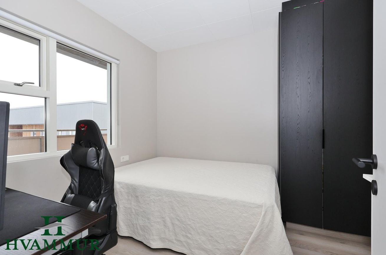 Svefnherbergin eru tvö, bæði með ljósu harðparketi á gólfi og svörtum plastlögðum fataskápum. Stærð svefnherbergja er skv. teikningum 9,1 og 11,8 m².