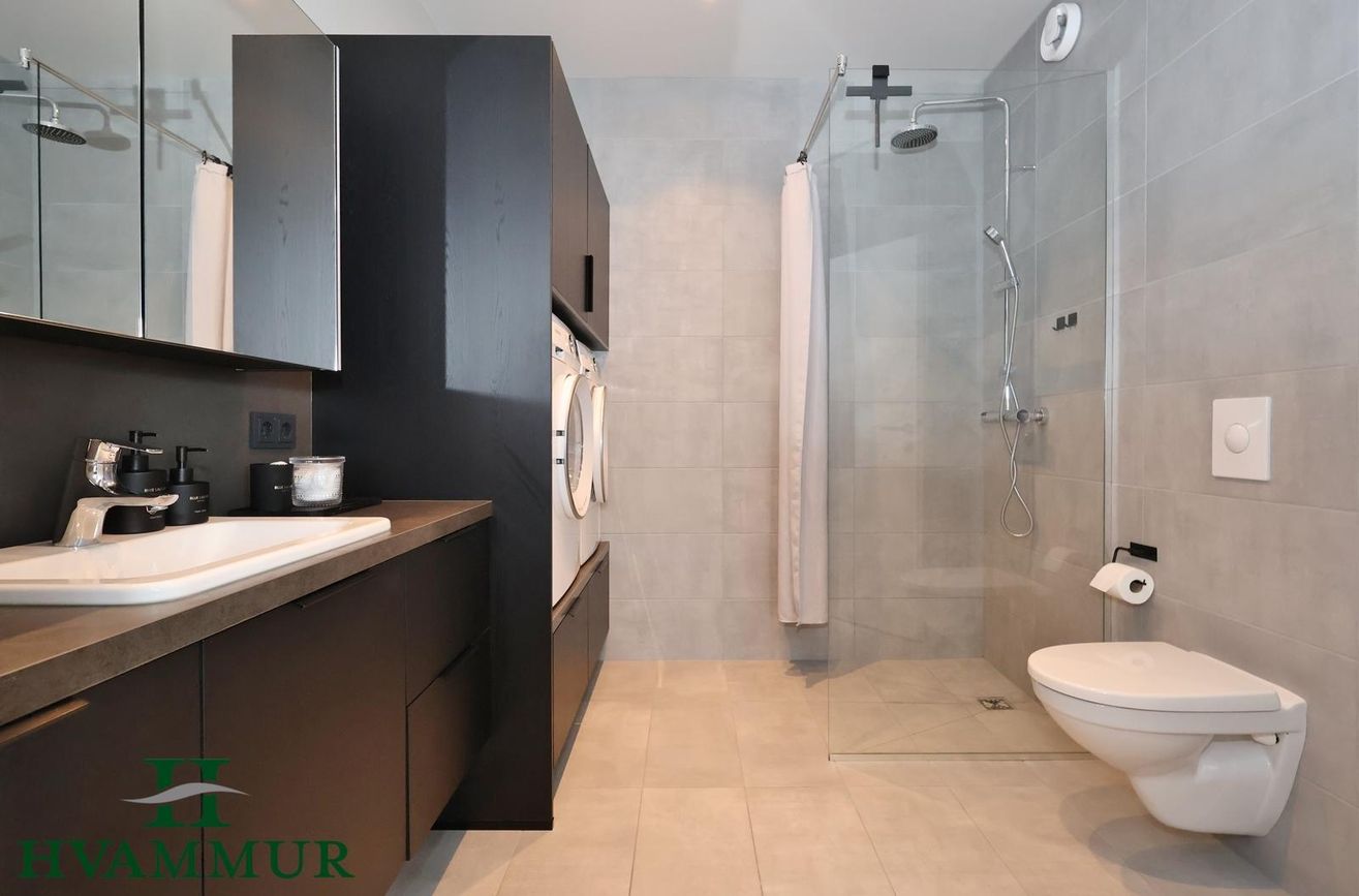 Baðherbergi er með gráum flísum á gólfi og hluta veggja, svartri plastlagðri innréttingu og speglaskáp, upphengdu wc og walk-in sturtu. Stæði er í innréttingu fyrir þvottavél og þurrkara.