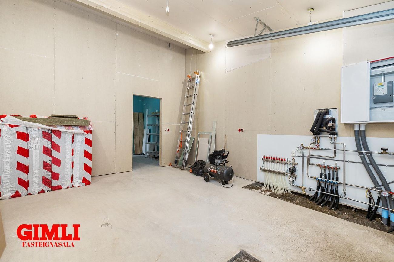 Frágangur innanhúss:Gólf er rykbundið nema á baðherbergi sem er flísalagt. Útveggir og innveggir klæddir með OSB sem innra lag og gipsplötum sem ytra lag. Í baðherbergi eru veggir við sturtu flísalagðir. Aðrir veggir er málaðir með votrýmismálningu. Allir veggir eru fullmálaðir. Loft, önnur en í baðherbergi, eru klædd með loftaþiljum. Í baðherbergi er loft klætt með rakaþolnu gipsi, full málað. Fráveitulagnir eru full frágengnar og þrifatæki uppsett og tengd. Neysluvatnslagnir er tengdar við stofninntak, fullgerðar og frágengnar að tækjum. Gólfhitakerfi er fullgert og frágengið með hitastýringum. Eldhúsinnrétting er uppsett og fullfrágengin með helluborði, ofni og hólfi fyrir ísskáp og uppþvottavél. Fataskápar eru uppsettir og frágengnir í öllum svefnherbergjum. Þvottahúsinnrétting er uppsett og fullfrágengin með blöndunartækjum. Fataskápur í forstofu er uppsettur og frágengin. Innrétting í baðherbergi er uppsett og fullfrágengin með blöndunartækjum. Innréttingar er frá Voke3, innhurðir hvítar frá Byko og tæki frá AEG/Siemens.