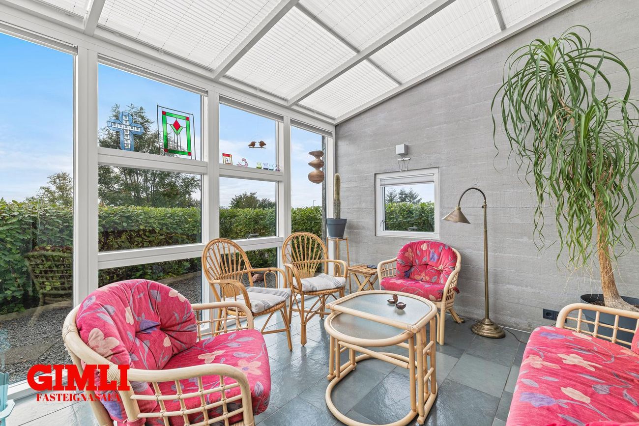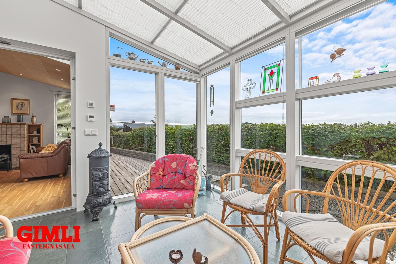 Úr stofu er gengið út í bjarta sólstofu og þaðan útgengi út í garð. Náttúruflísar á gólfi og hitalögn þar undir.