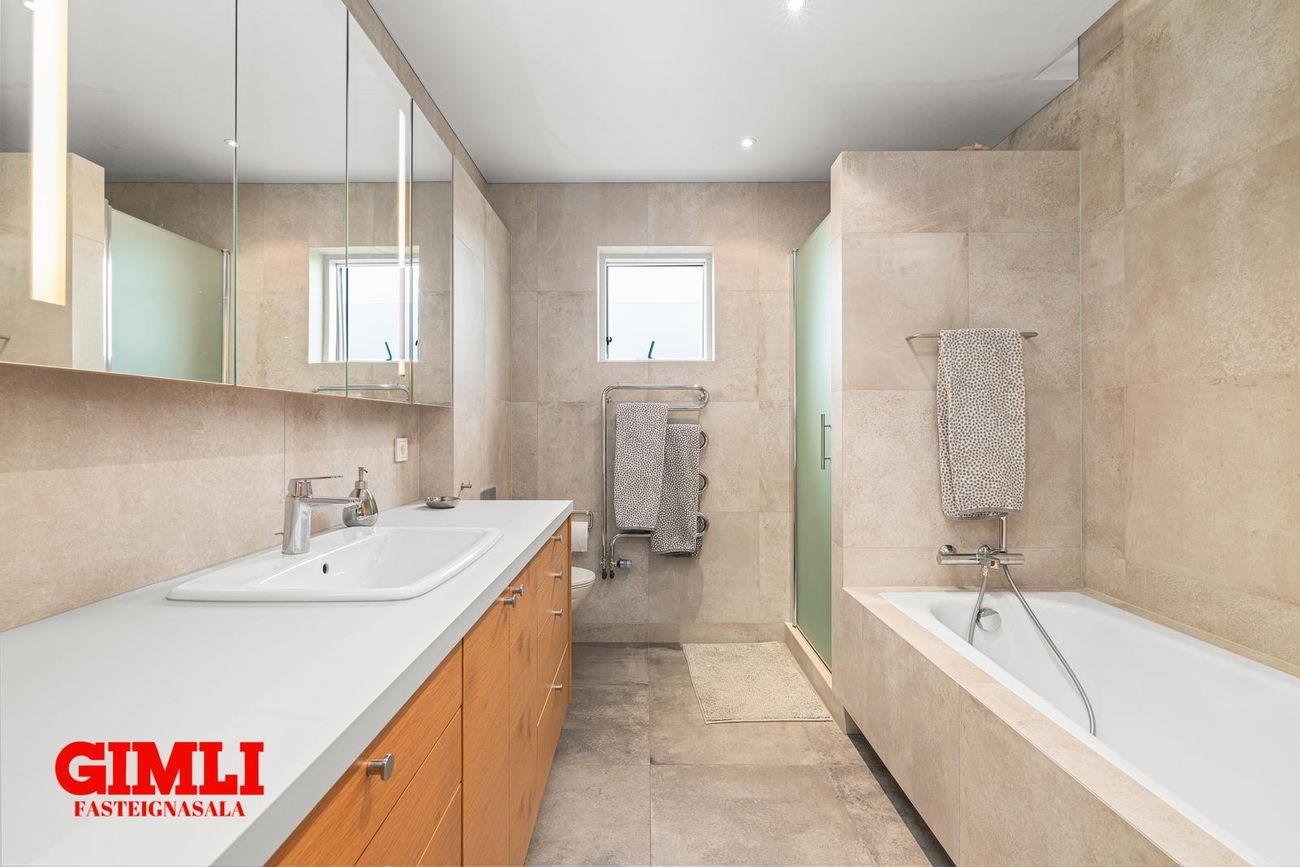 Baðherbergi 2, er mjög rúmgott með sturtuklefa og baðkari, innréttingu, handklæðaofni og glugga.
