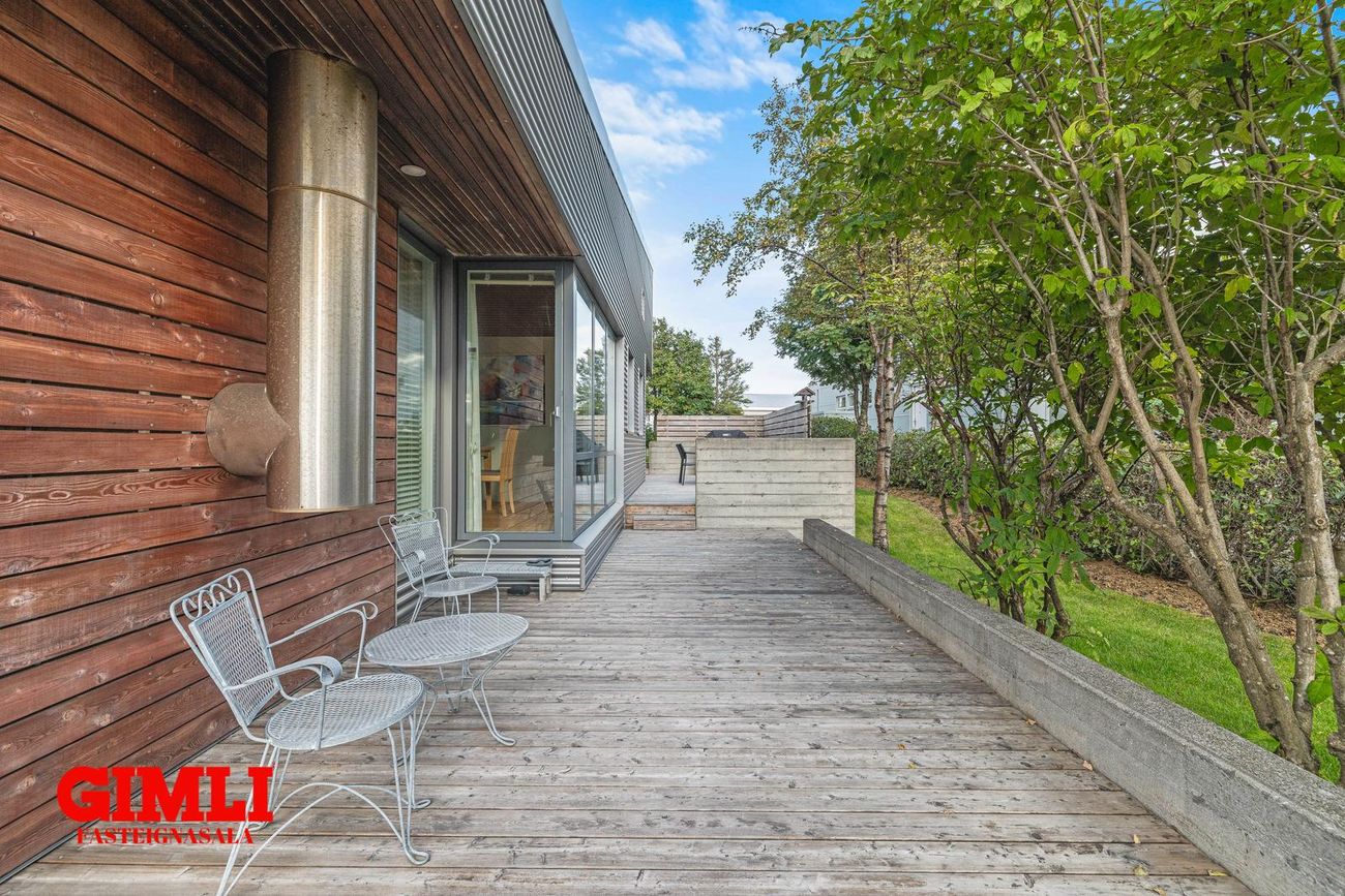 Garðurinn er sérlega fallegur og auðveldur í umhirðu. Verandir og skjólveggir úr Lerki (harðviður sem ekki þarf að bera á)