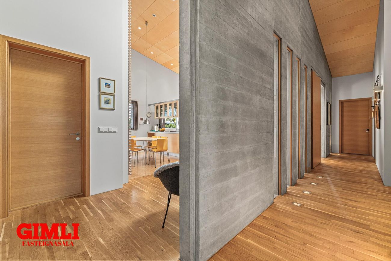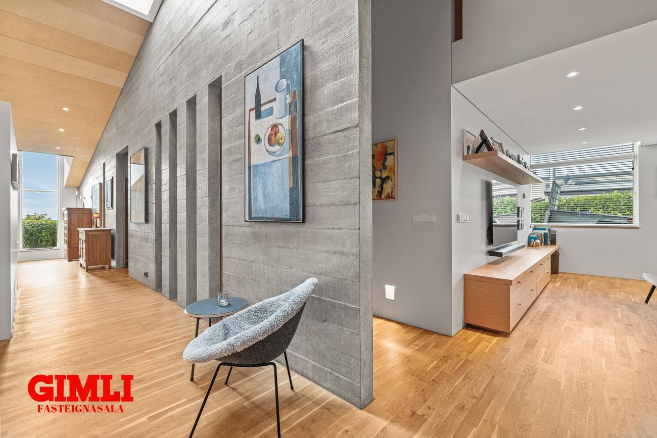 Fallegur sjónsteypypuveggur gengur í gegnum stóran hlutan hússins og setur skemmtilegan svip á hönnun þess.
