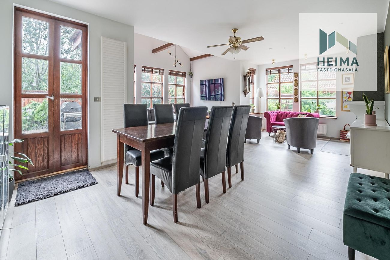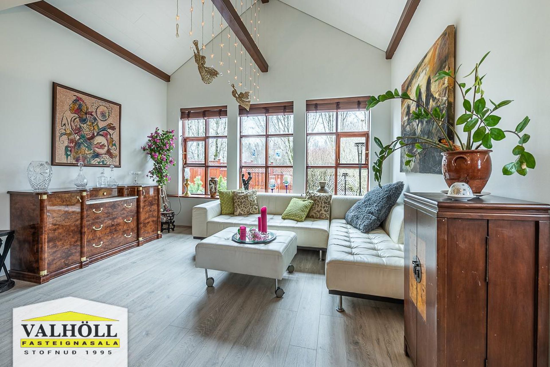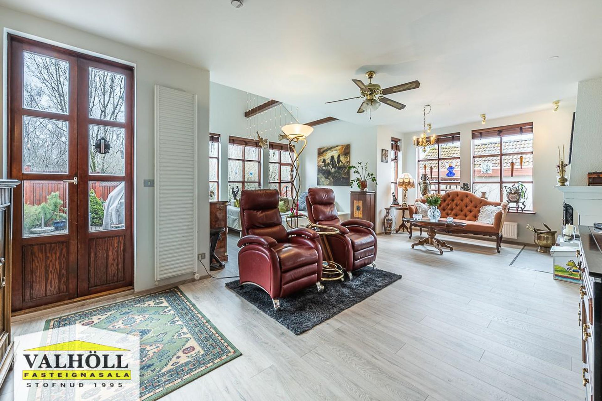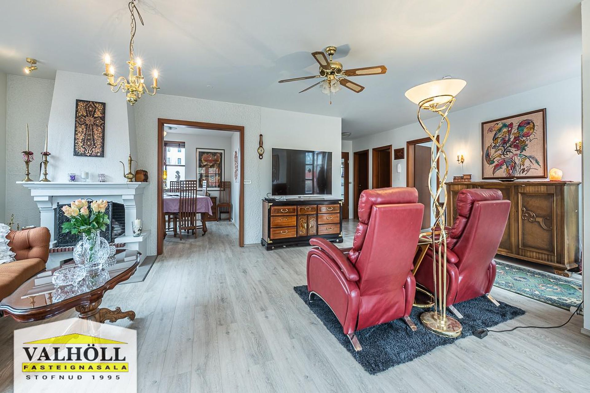 Rúmgóð stofa með sjónvarpsholi, borðstofu og stórum arni. Gengið úr stofu út á rúmgóða verönd.