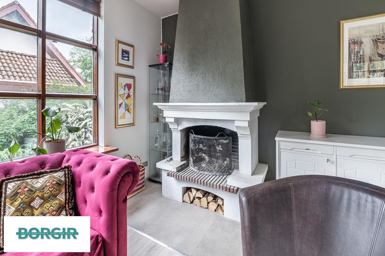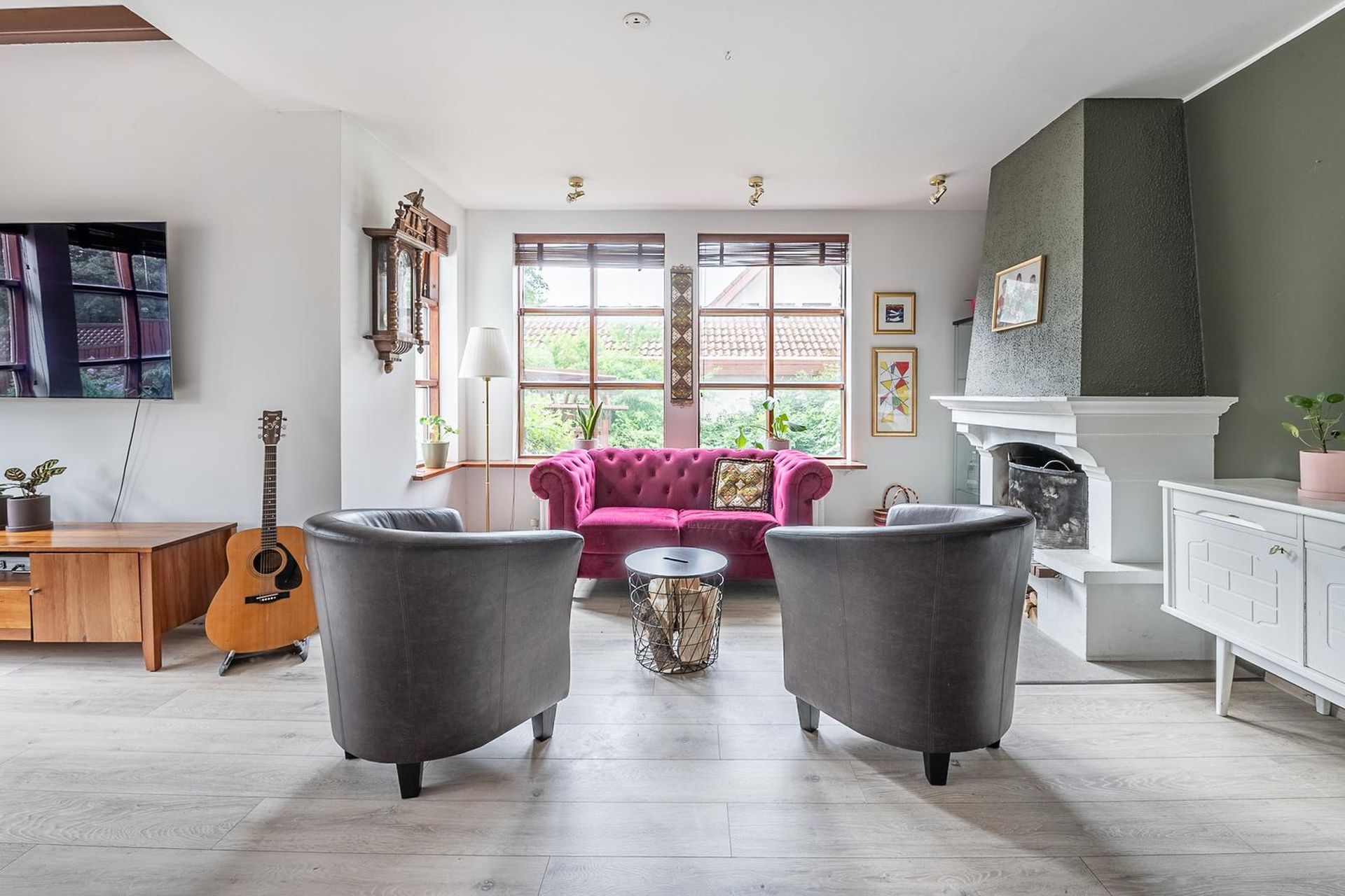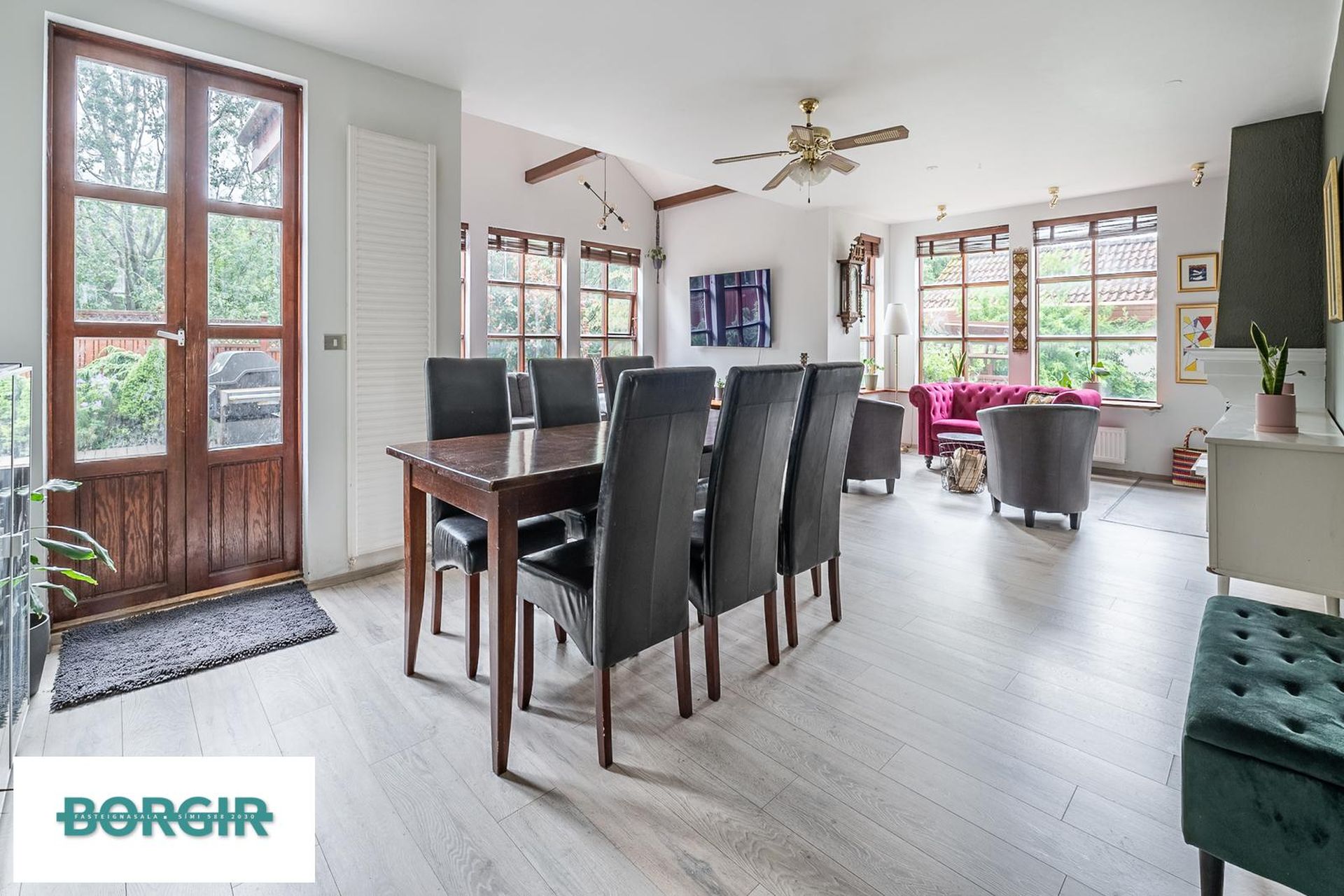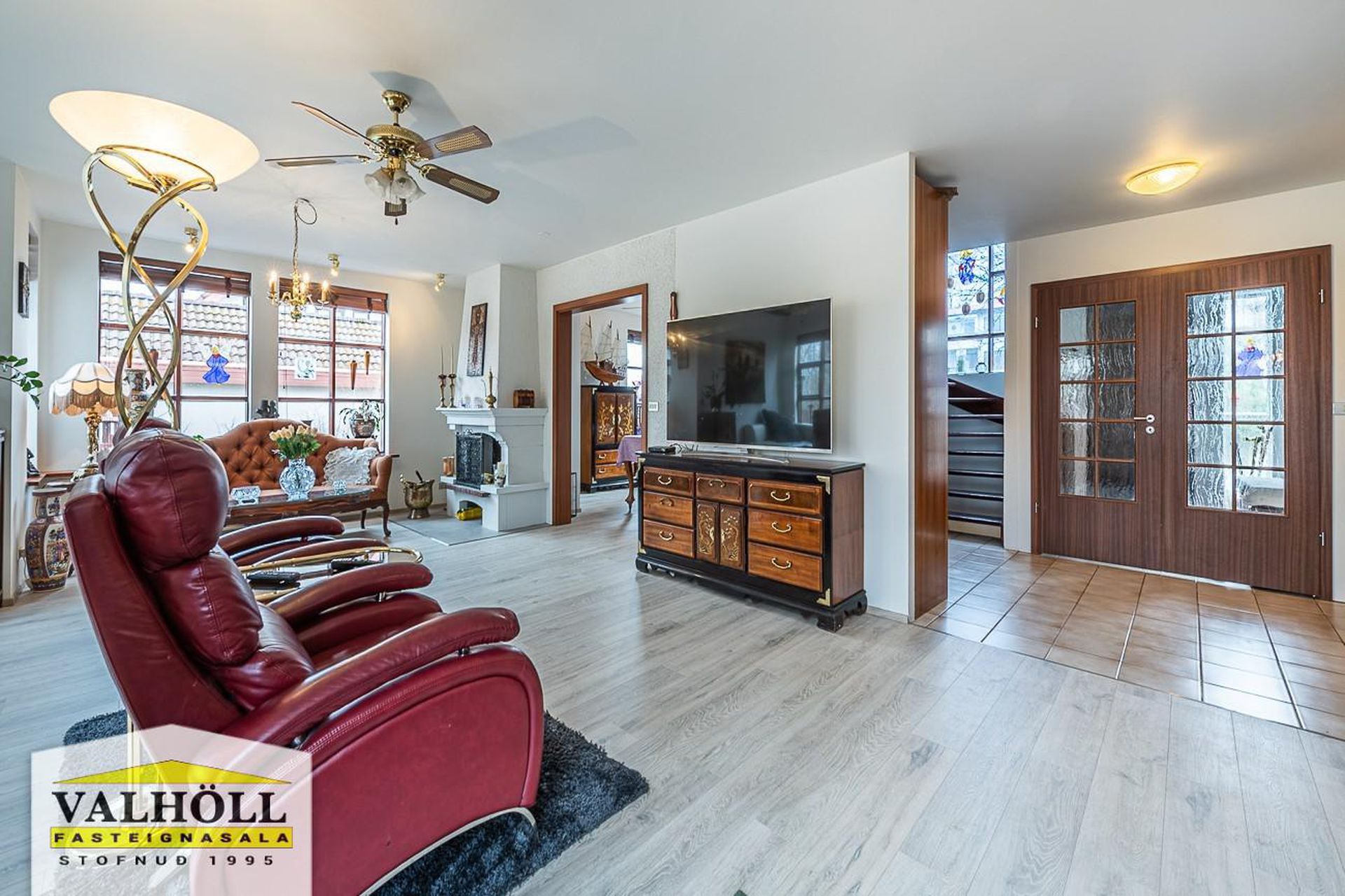 Rúmgóð stofa með sjónvarpsholi, borðstofu og stórum arni. Gengið úr stofu út á rúmgóða verönd.