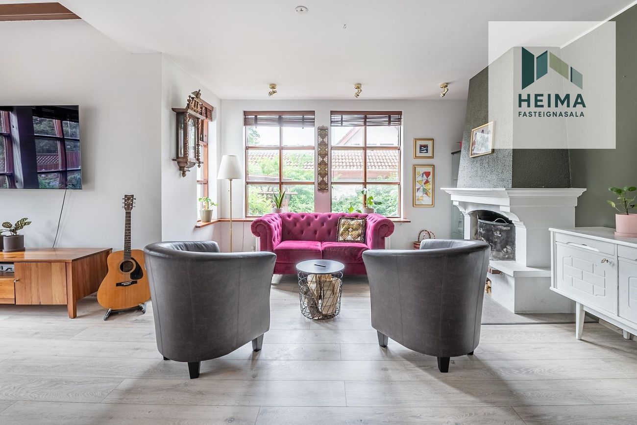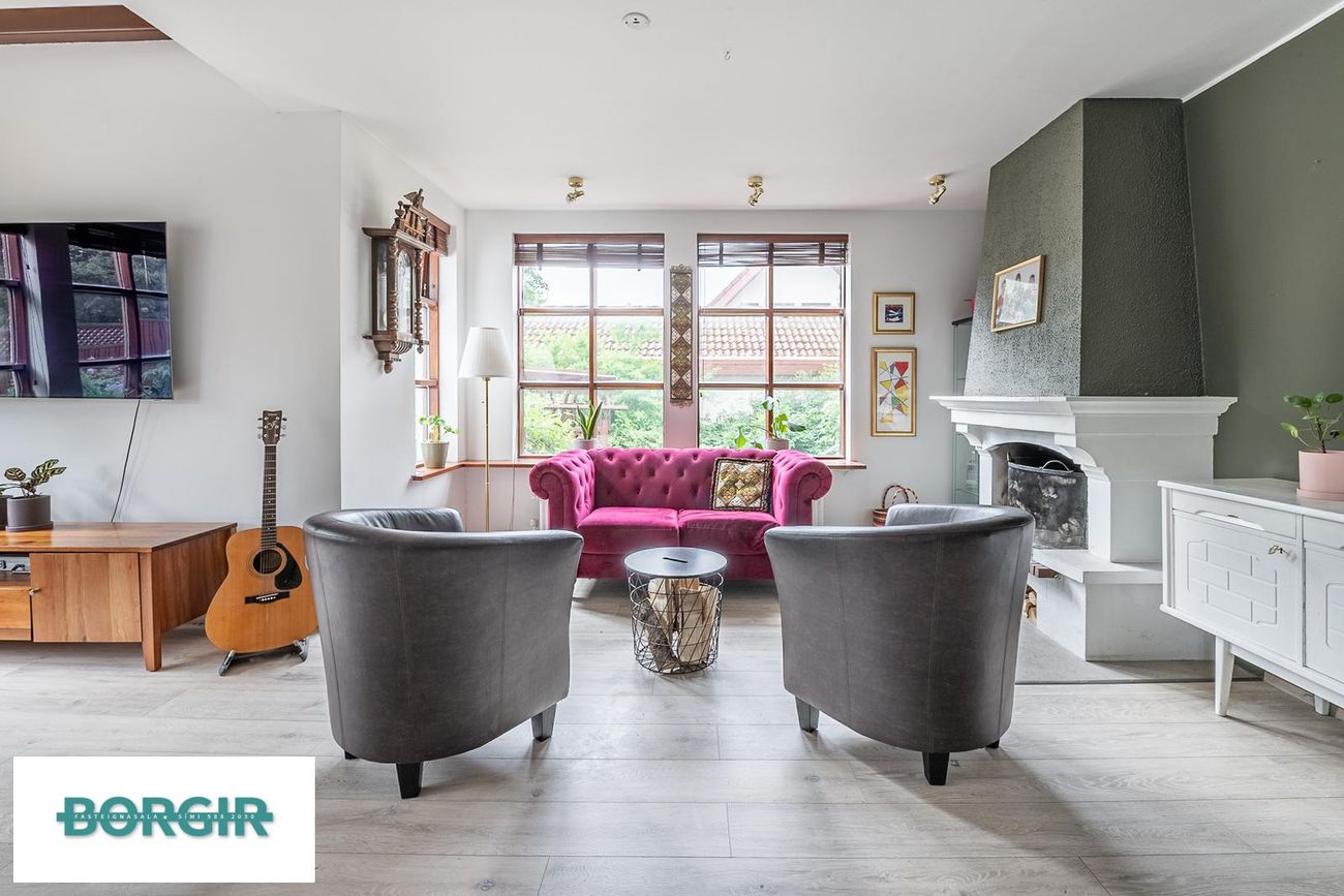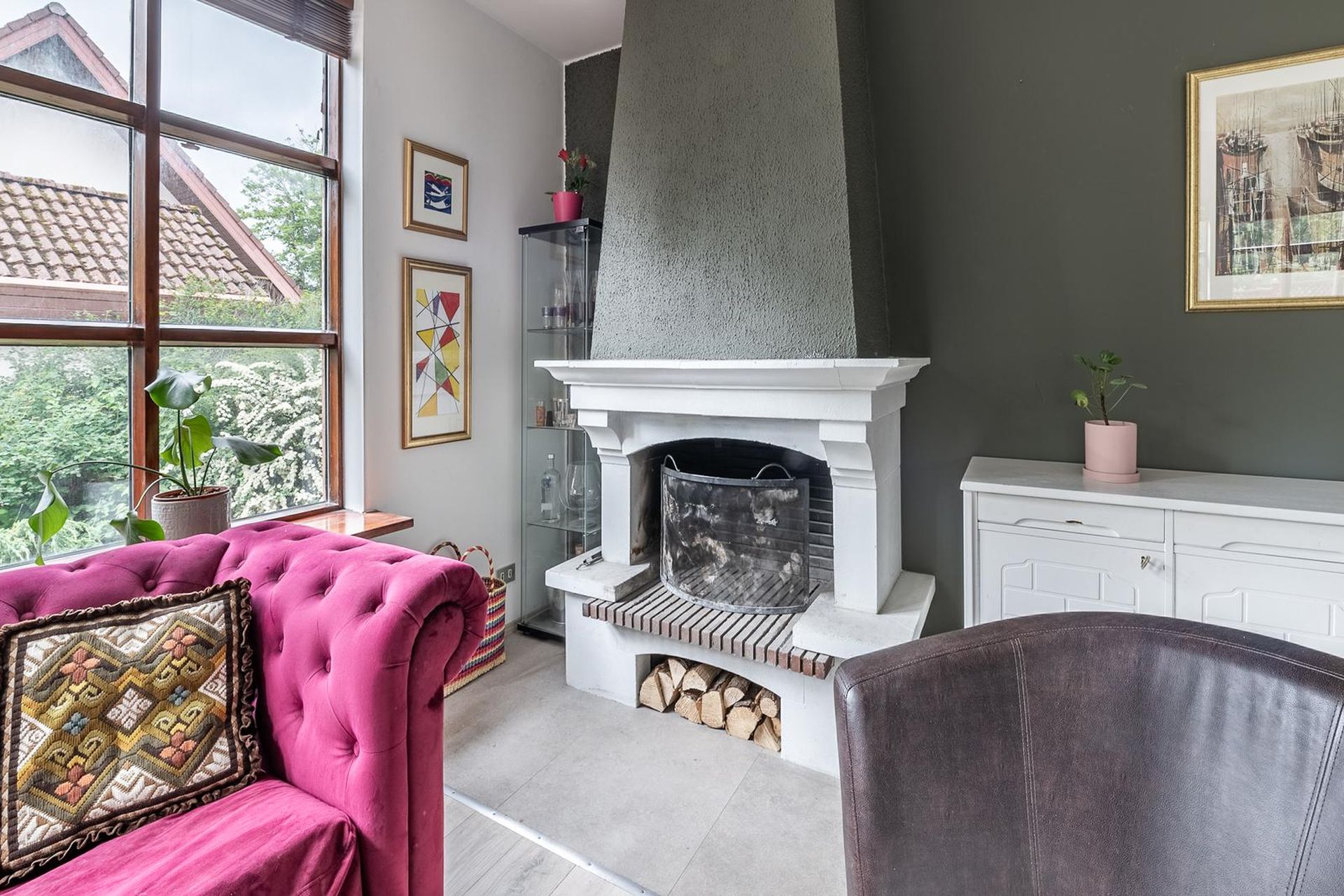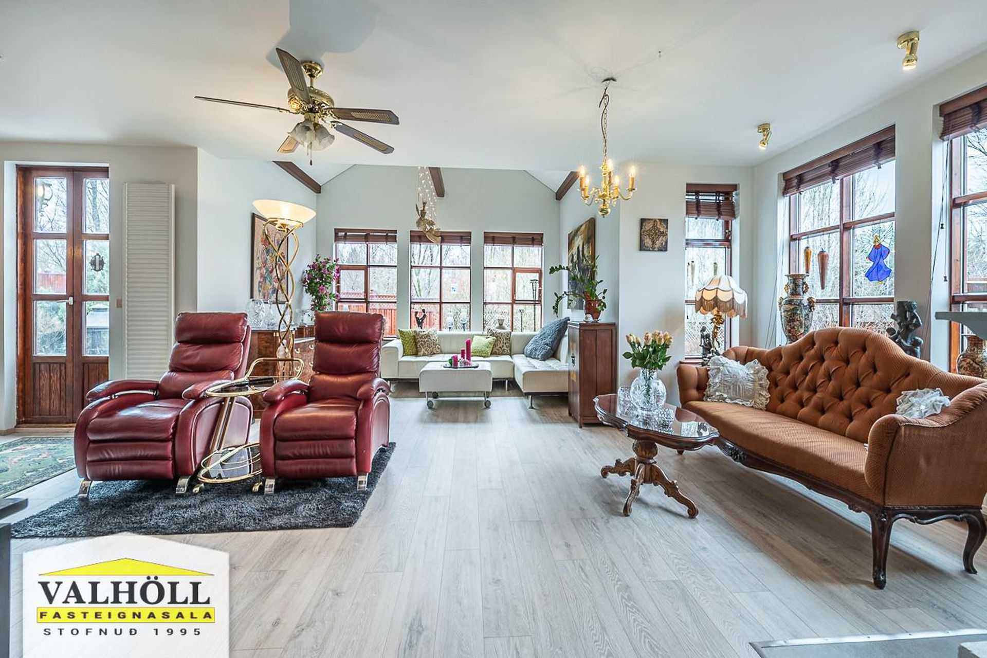 Rúmgóð stofa með sjónvarpsholi, borðstofu og stórum arni. Gengið úr stofu út á rúmgóða verönd.