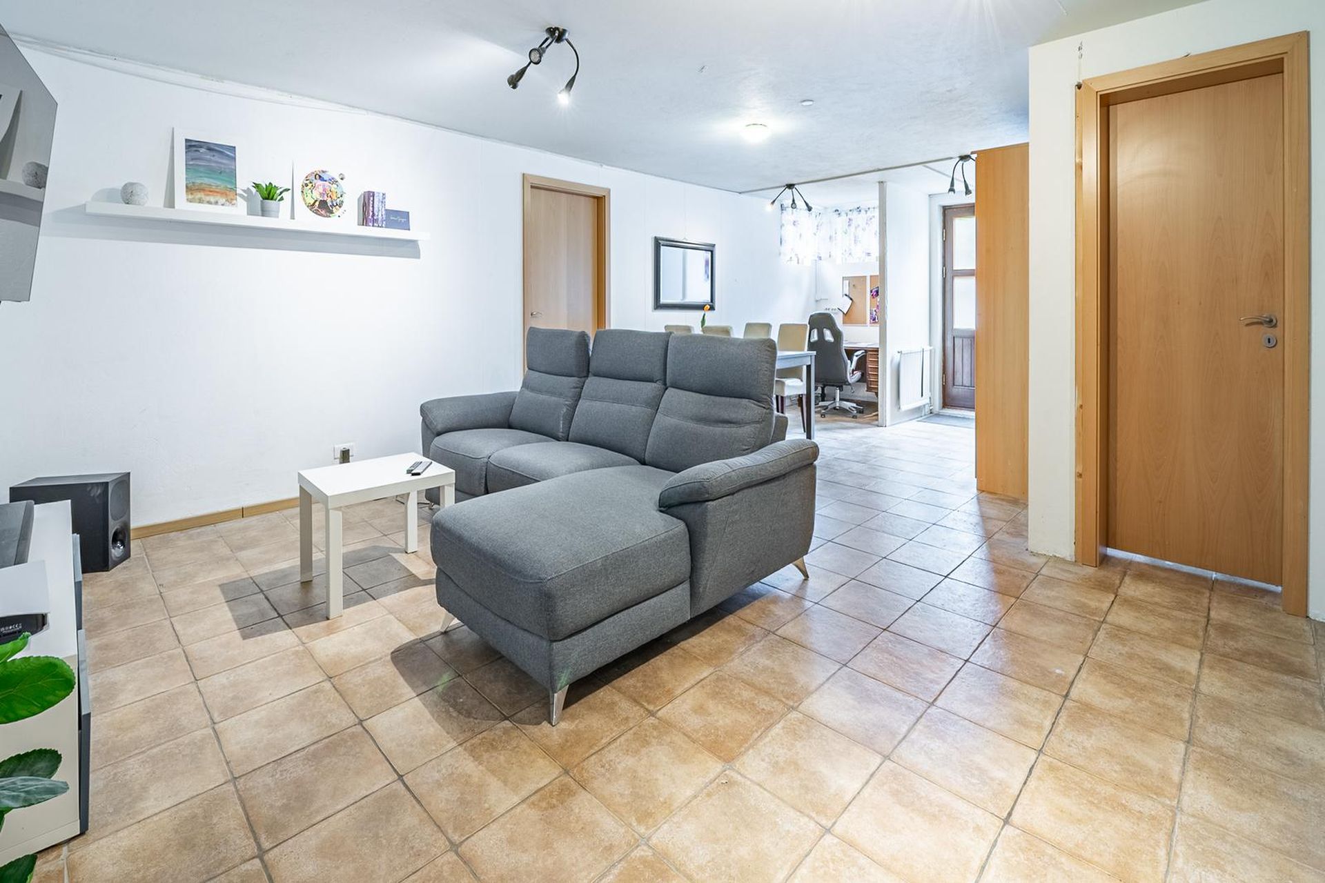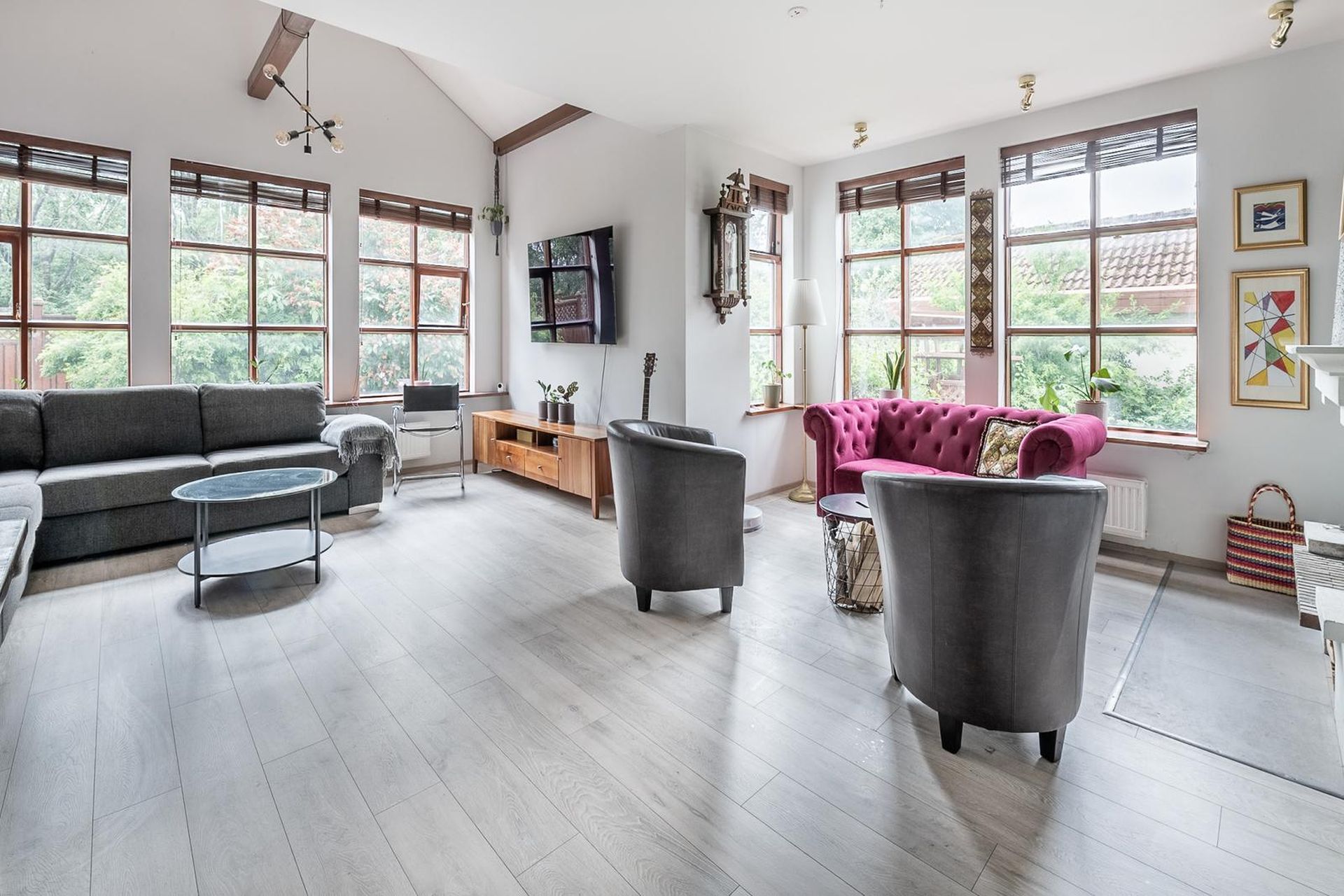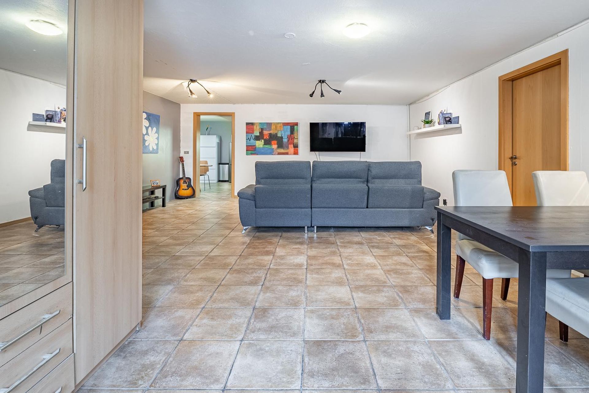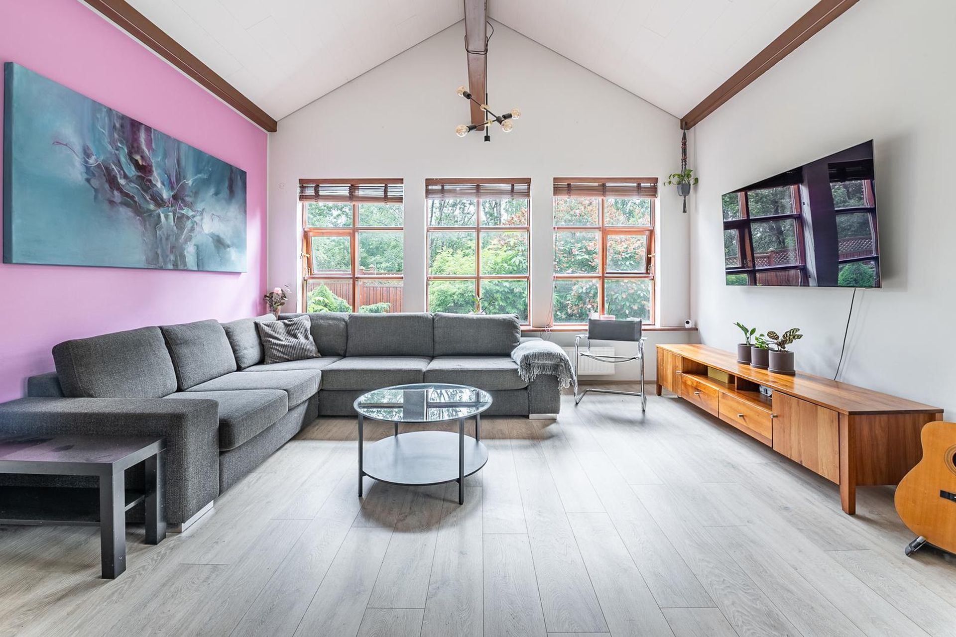 Rúmgóð stofa með sjónvarpsholi, borðstofu og stórum arni. Gengið úr stofu út á rúmgóða verönd.