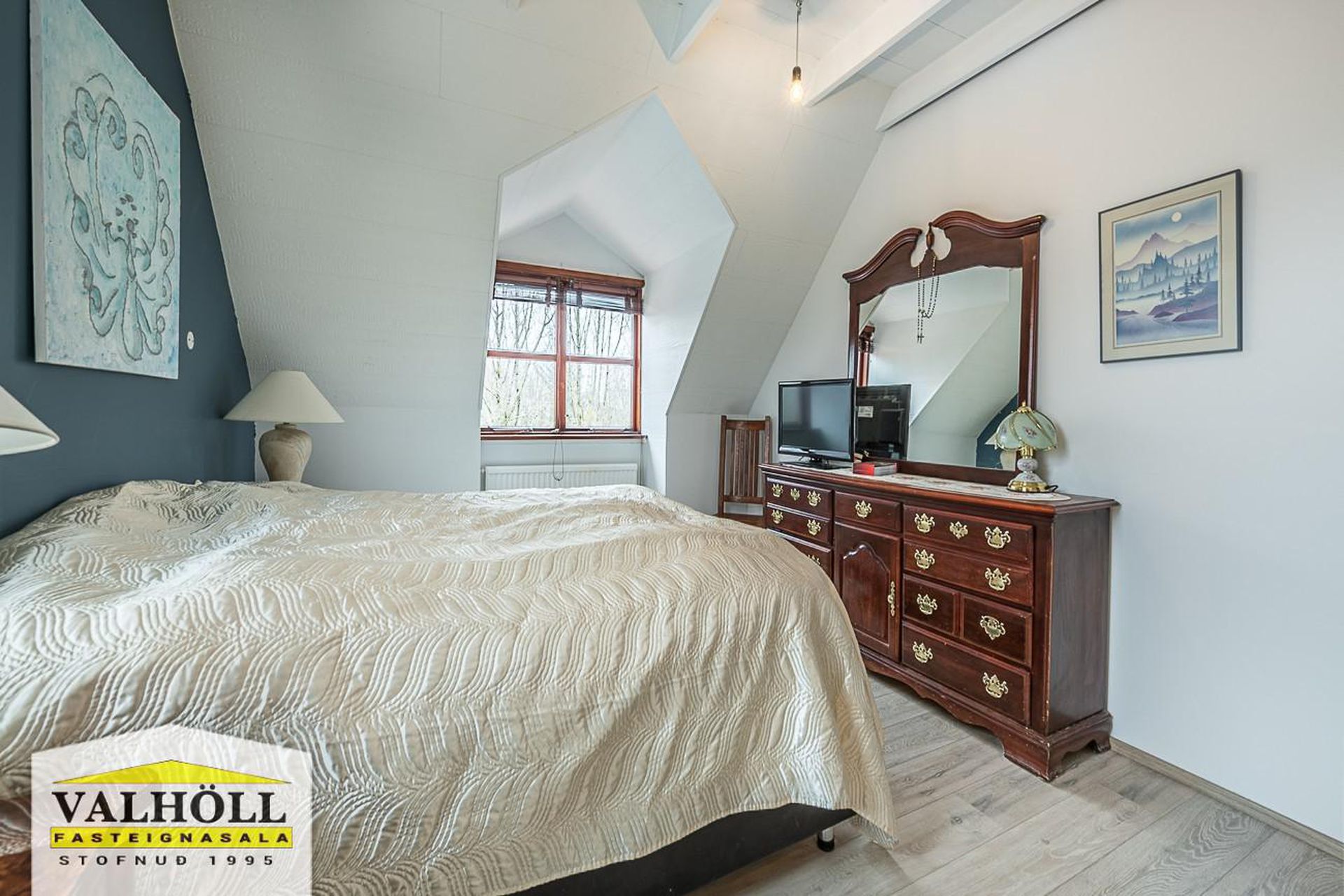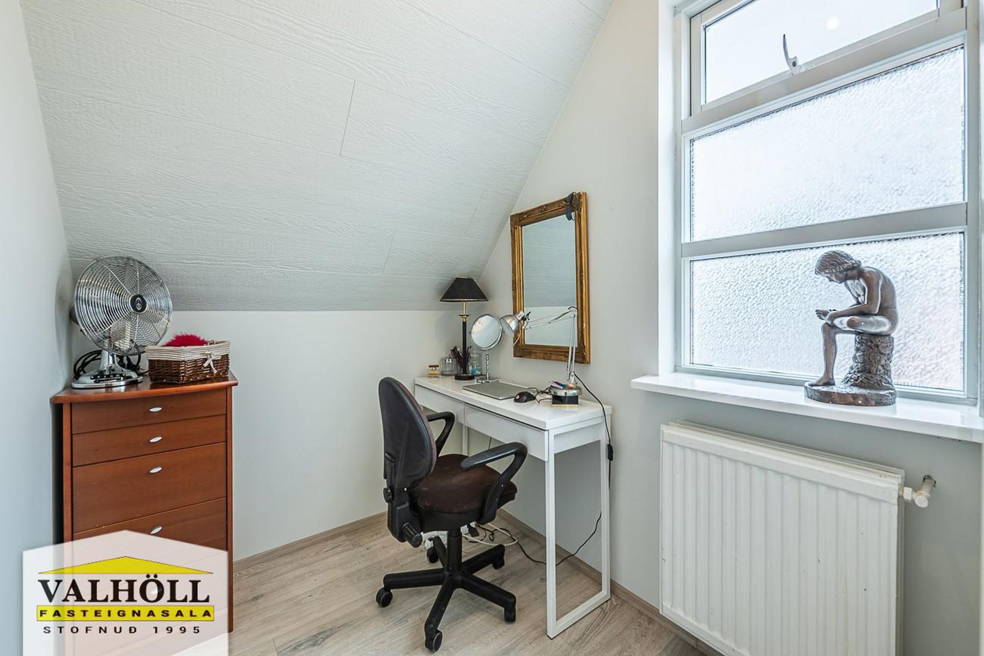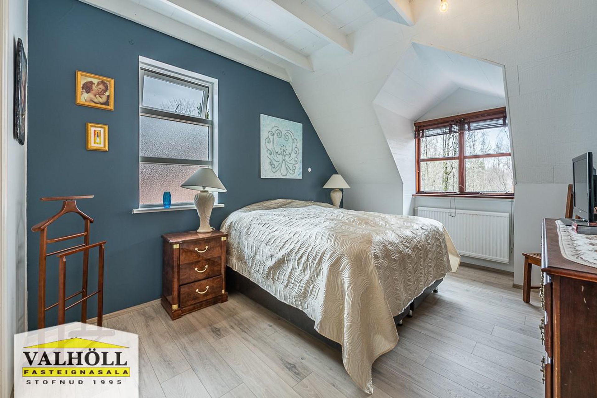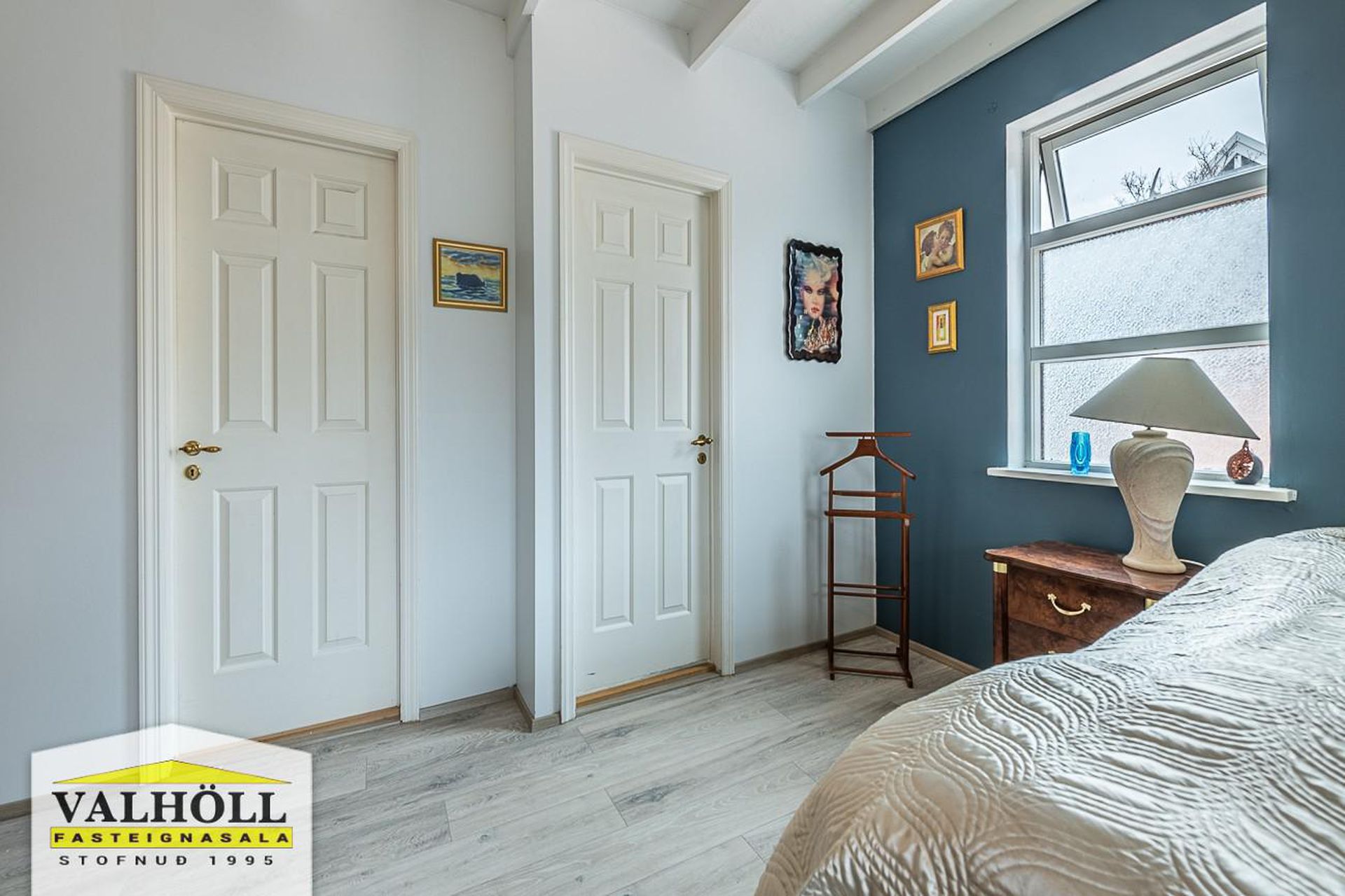 I hæð: Tveggja herbergi, eitt rúmgott (nú ræktarherbergi) með góðu fataskápaplássi, annað herbergi (nú skrifstofa). II hæð: Hjónaherbergi með fataherbergi og litlu barna/skrifstofuherbergi. Tvö önnur rúmgóð herbergi (eitt með útgöngu á vestursvalir, annað notað sem sjónvarpsherbergi). Kjallari/aukaíbúð: Tvö rúmgóð herbergi.