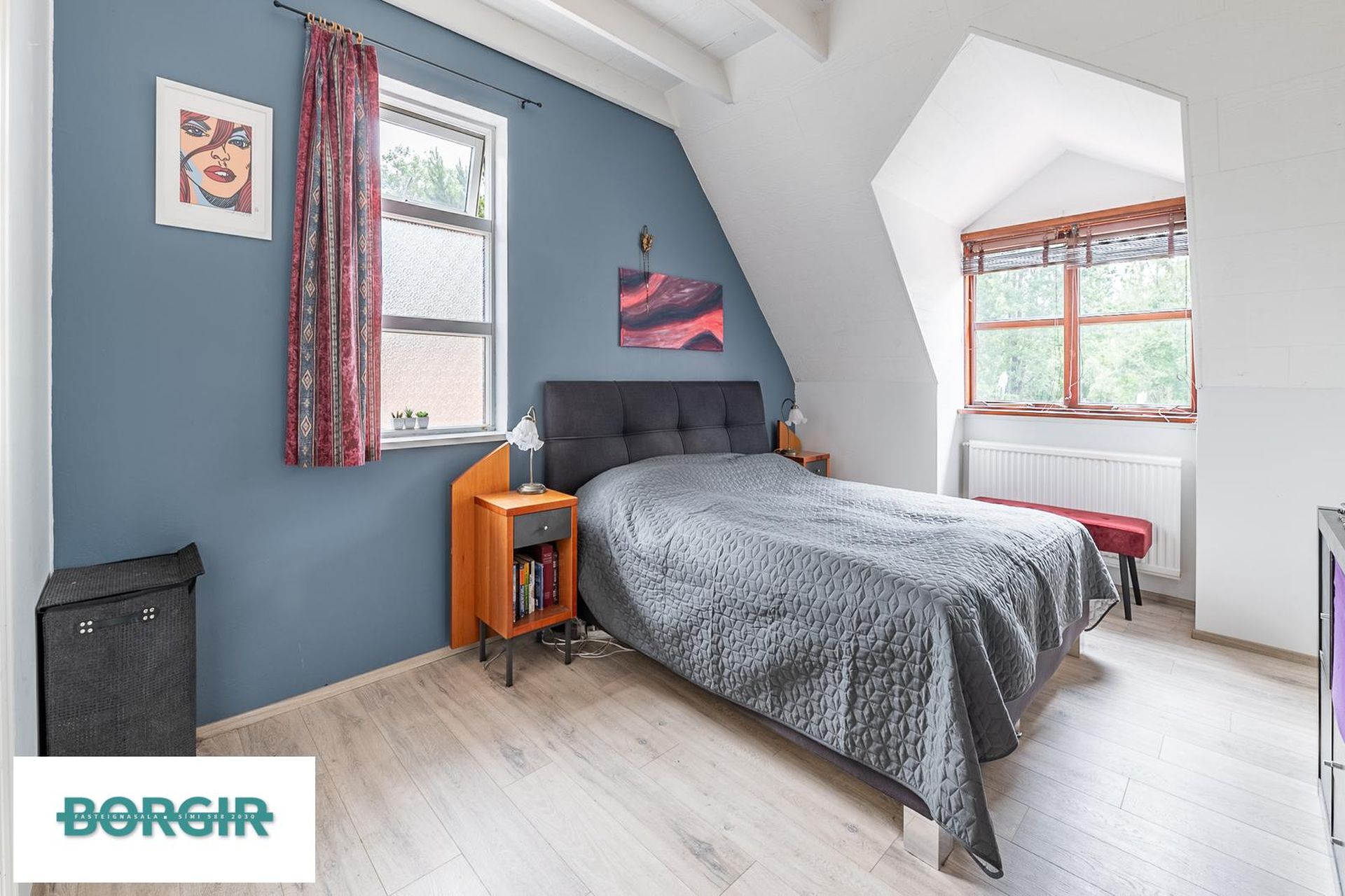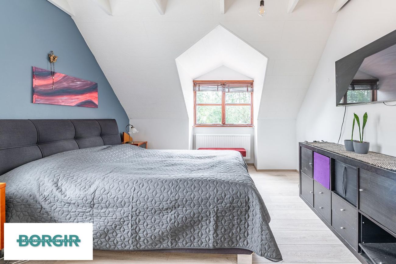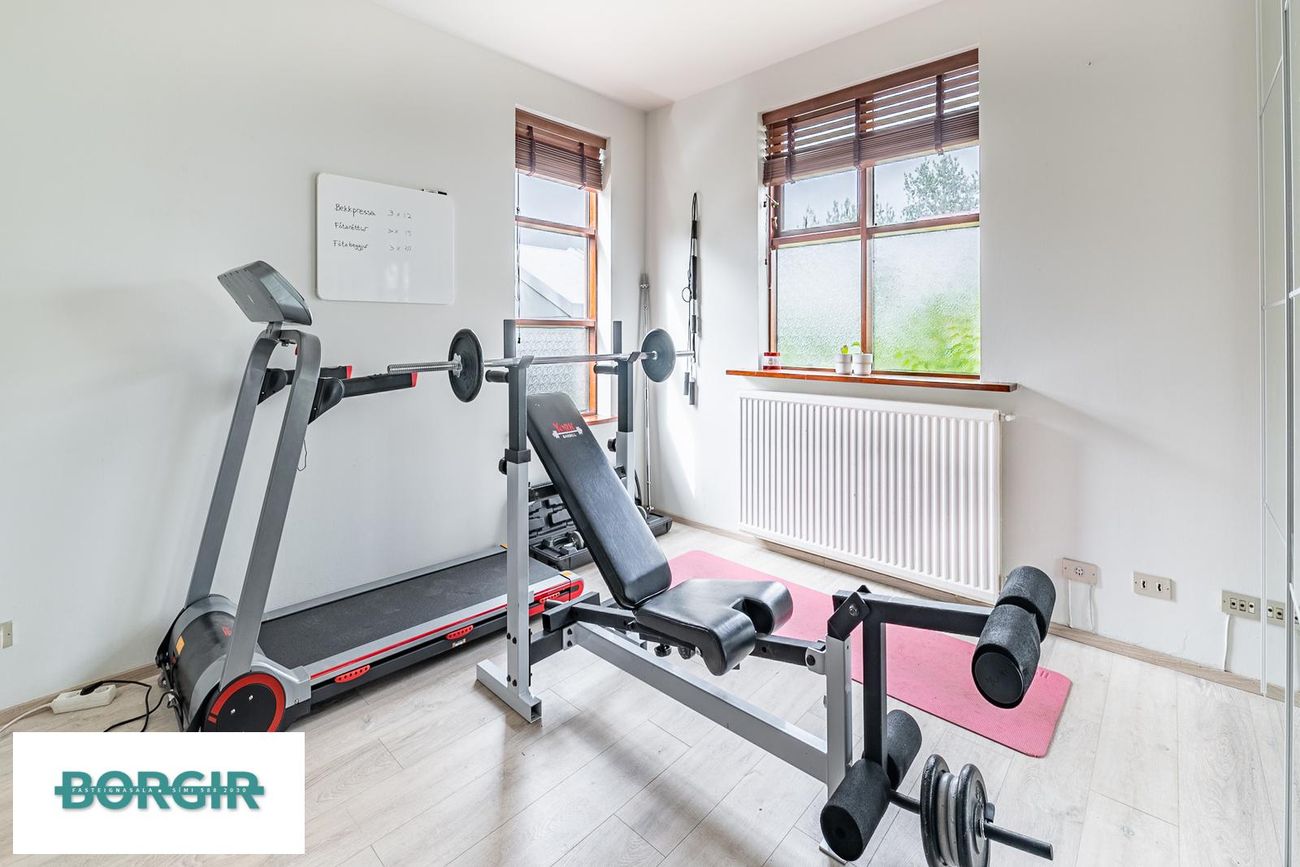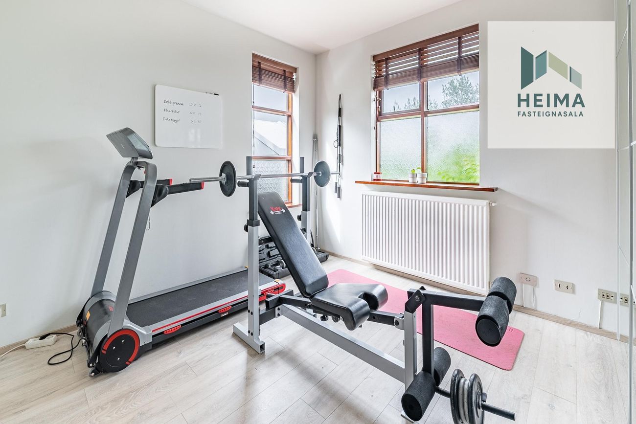 I hæð: Tveggja herbergi, eitt rúmgott (nú ræktarherbergi) með góðu fataskápaplássi, annað herbergi (nú skrifstofa). II hæð: Hjónaherbergi með fataherbergi og litlu barna/skrifstofuherbergi. Tvö önnur rúmgóð herbergi (eitt með útgöngu á vestursvalir, annað notað sem sjónvarpsherbergi). Kjallari/aukaíbúð: Tvö rúmgóð herbergi.