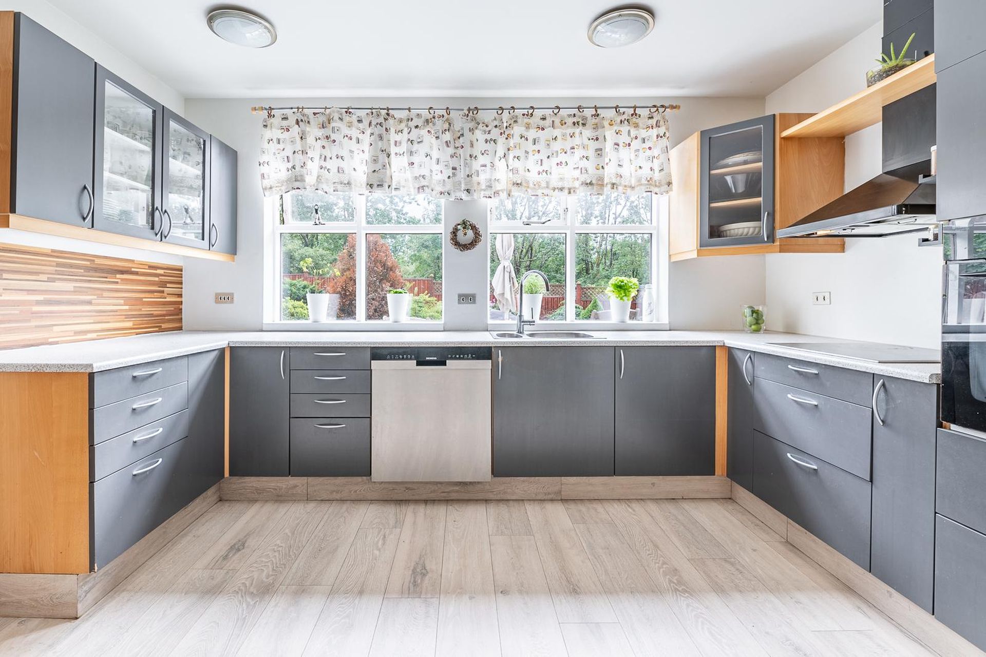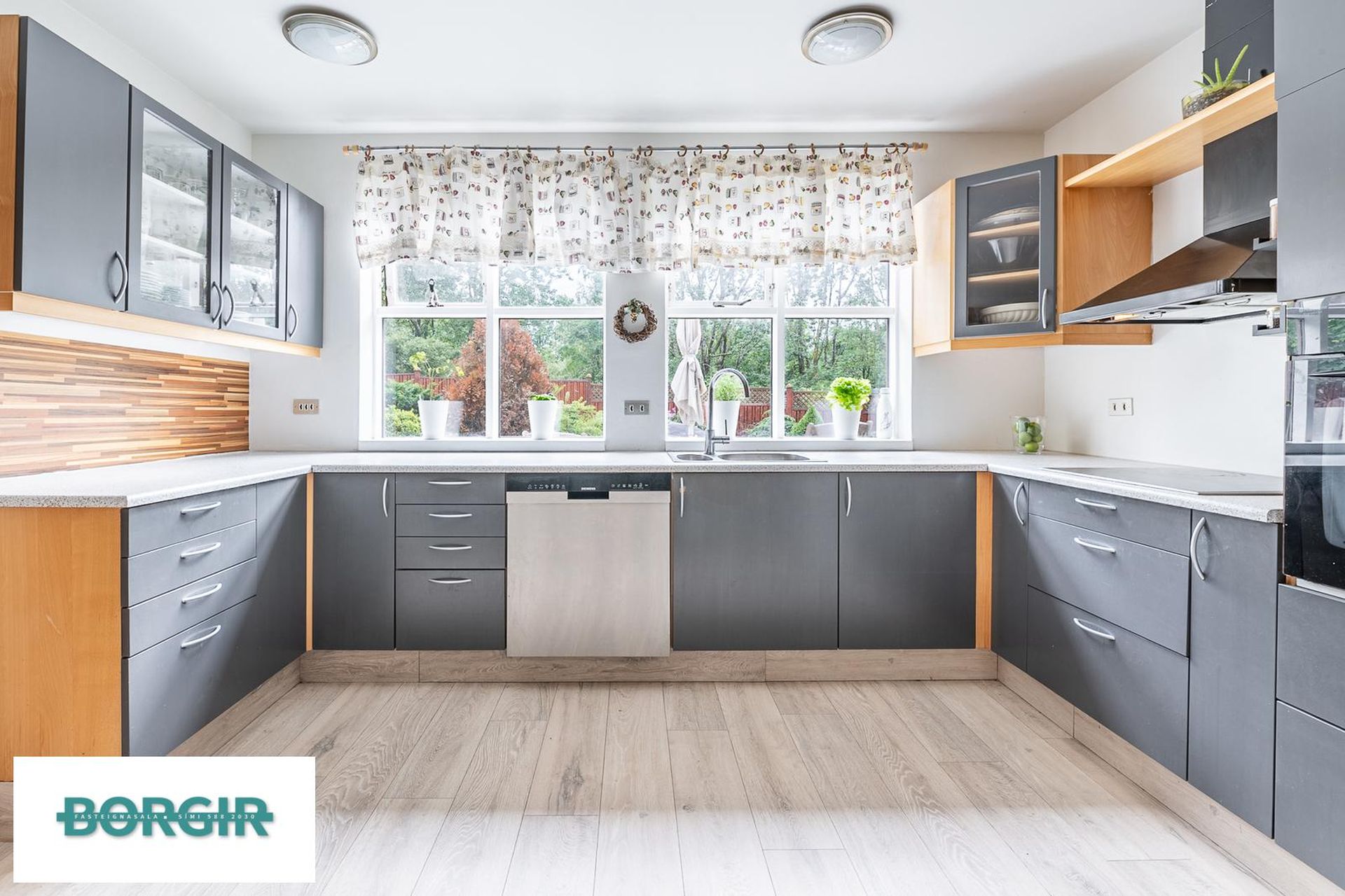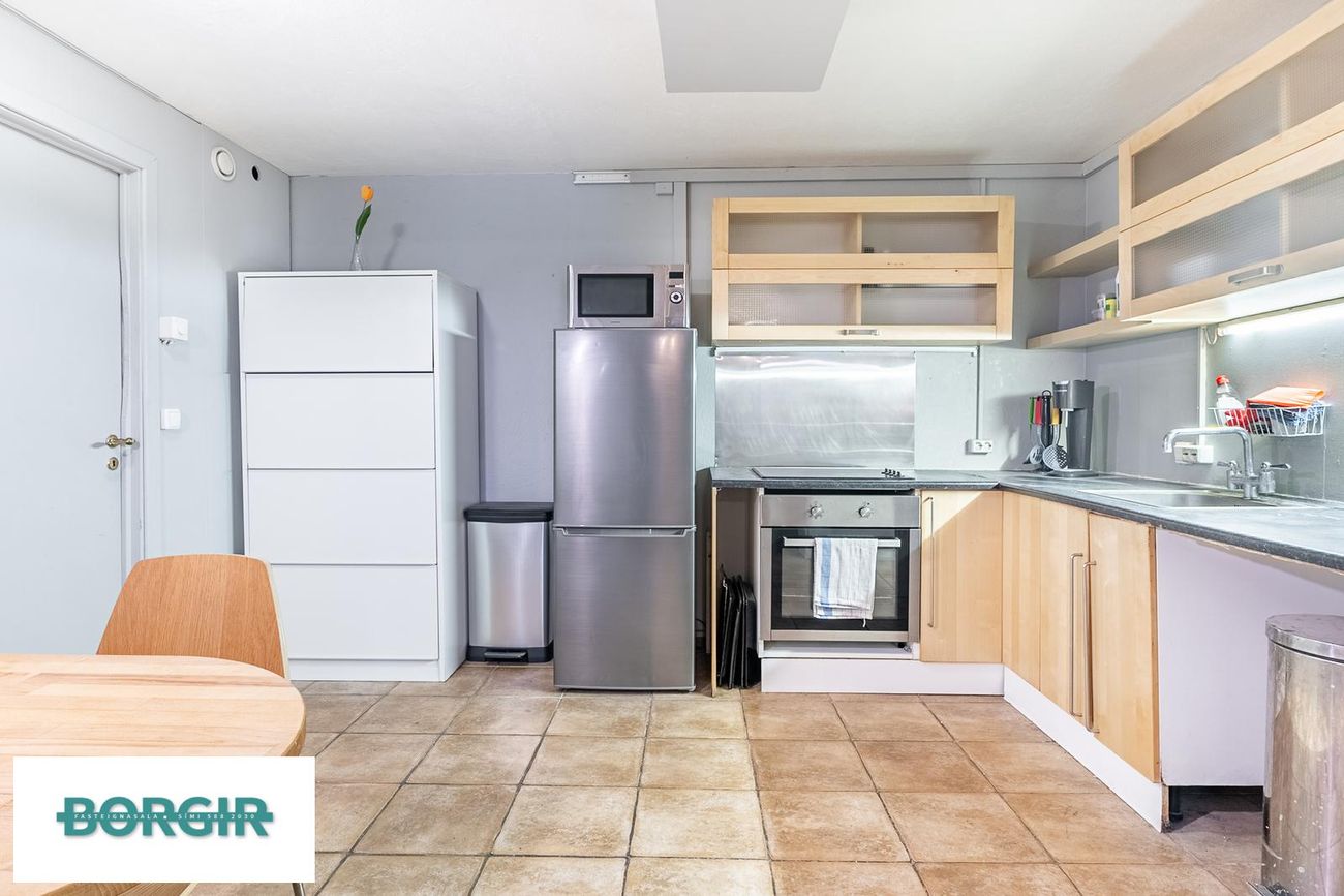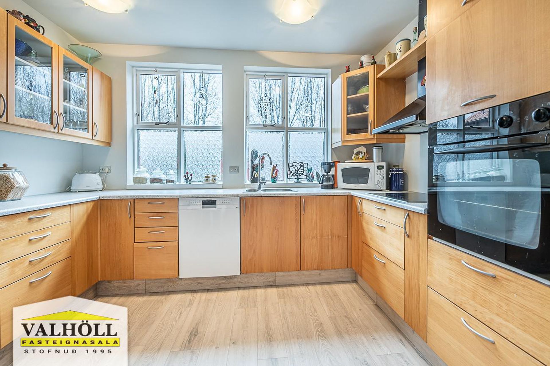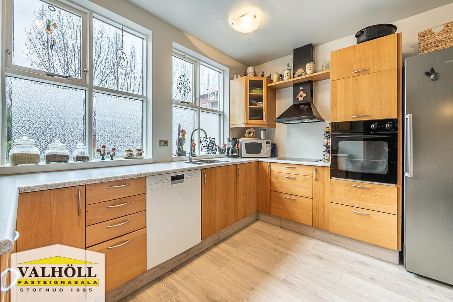 Eldhús í aðalíbúð með ágætum beiki innréttingum. Eldhús í kjallara/aukaíbúð með innréttingu, helluborði, bakaraofni og ískápaplássi. Baðherbergi í kjallara með Mora blöndunartæki og sérlögn í þvottavél. Handklæðaofn í baði á I hæð. Vegghengt salerni í baði á I hæð.