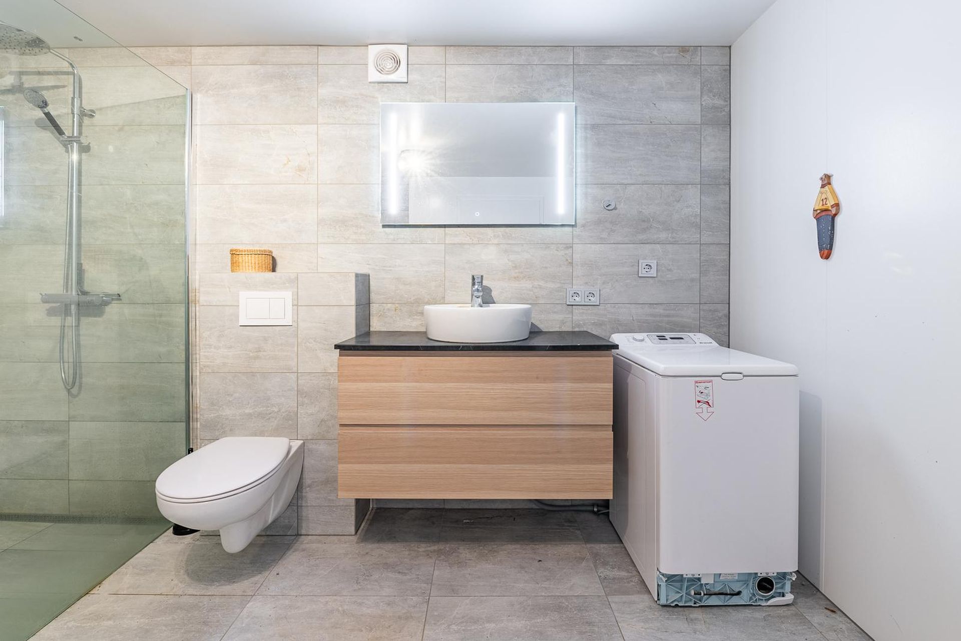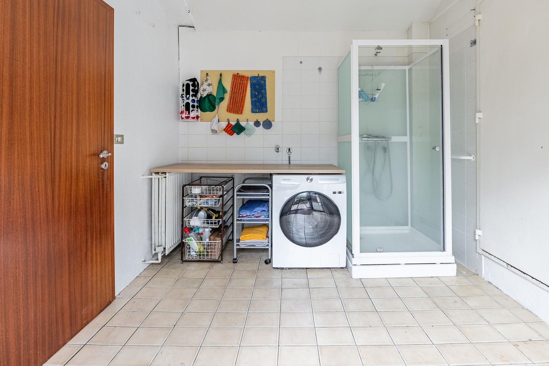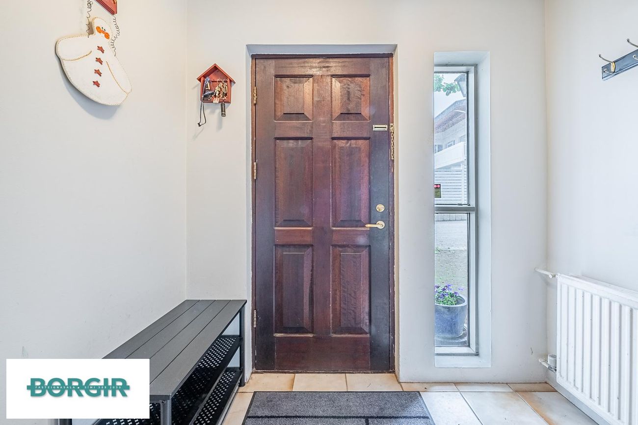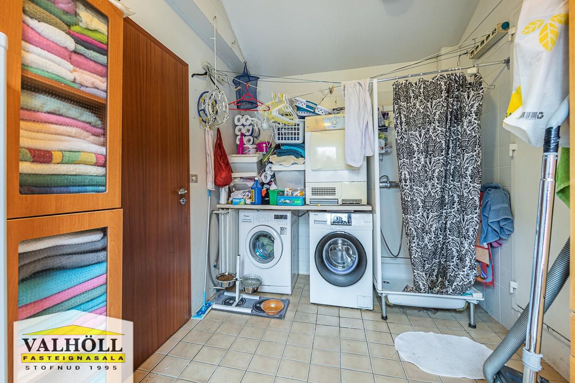 Þvottaherbergi innaf eldhúsi með sturtuklefa. Gengið úr þvottaherbergi út í garðinn á verönd og inn í bílskúrinn.