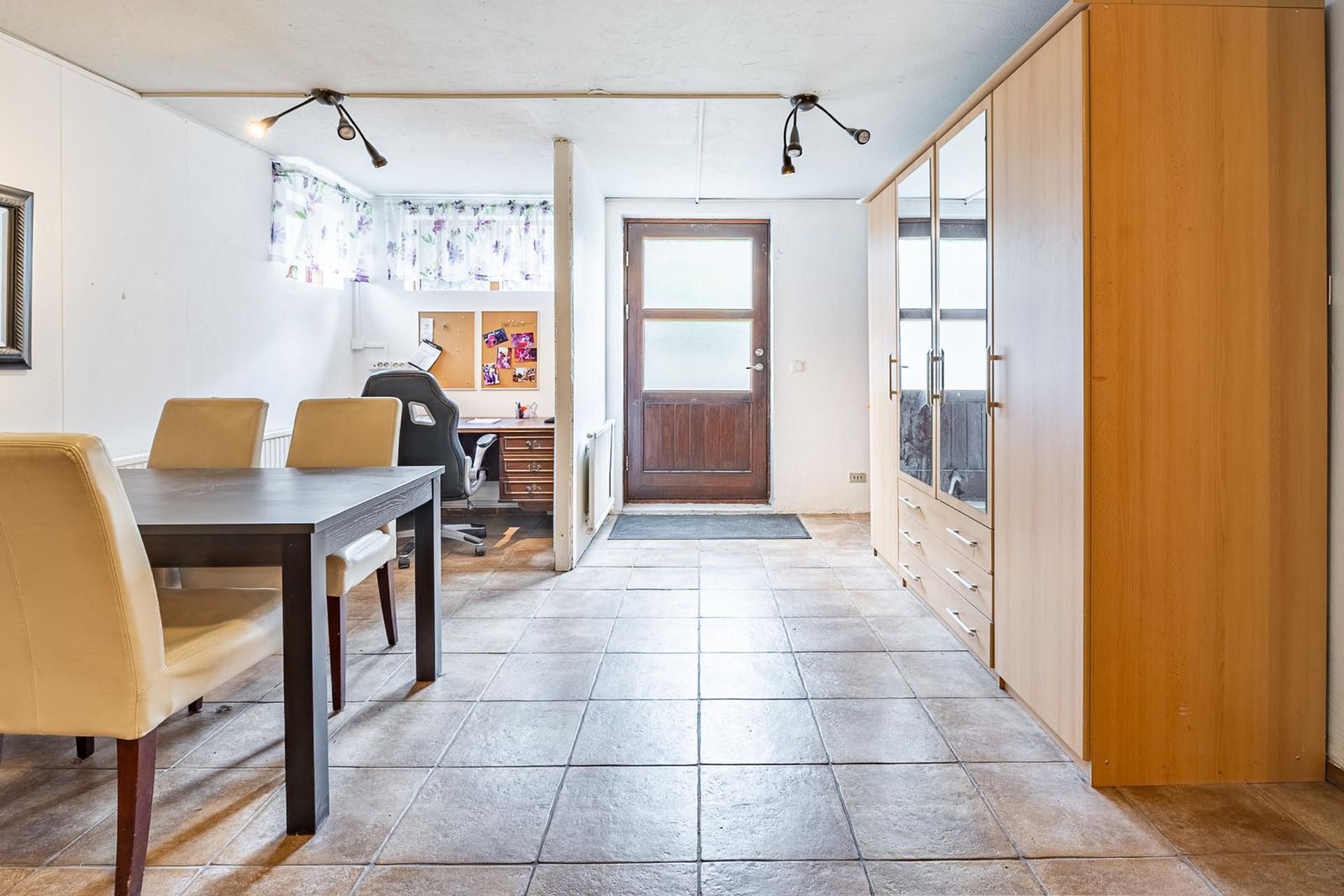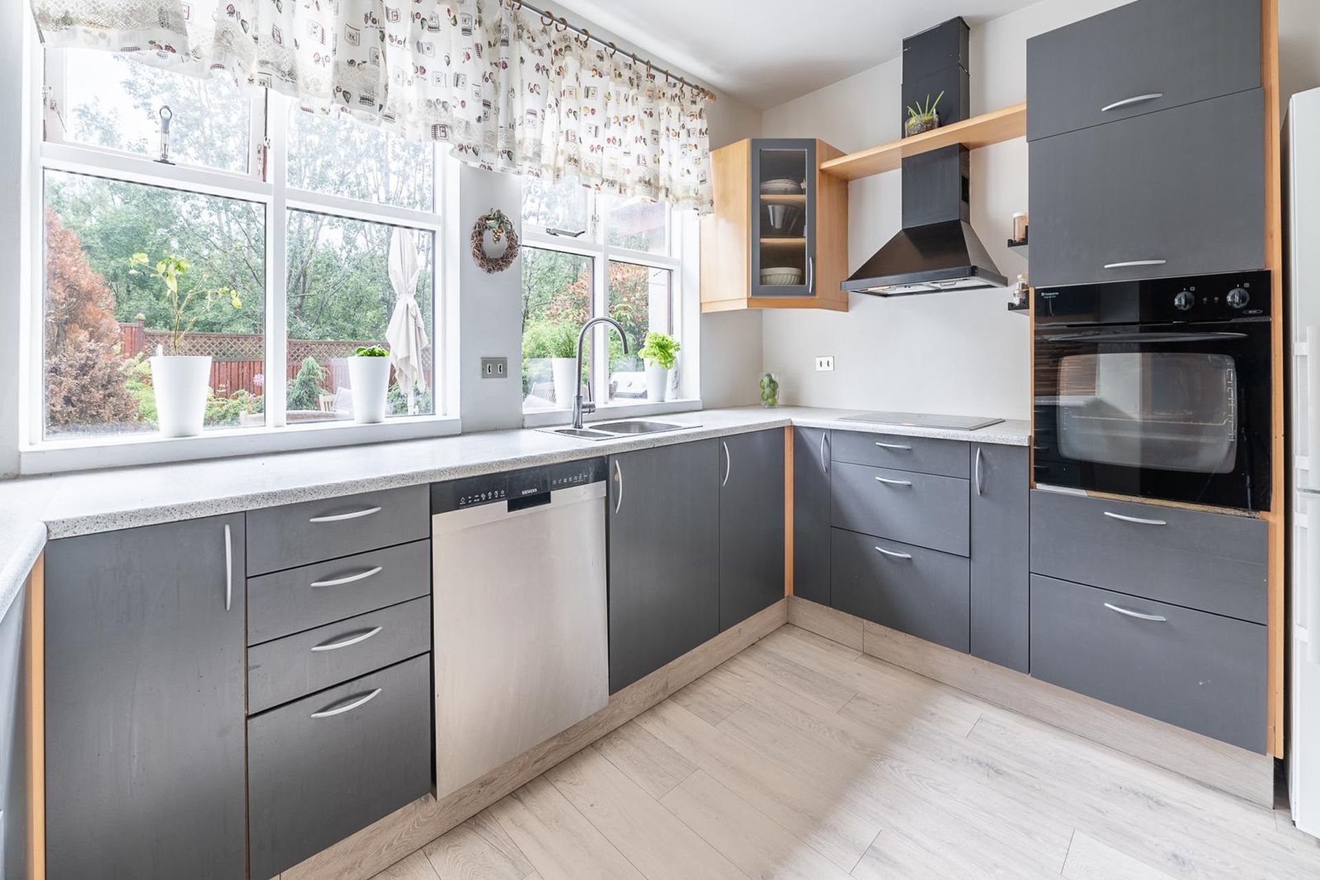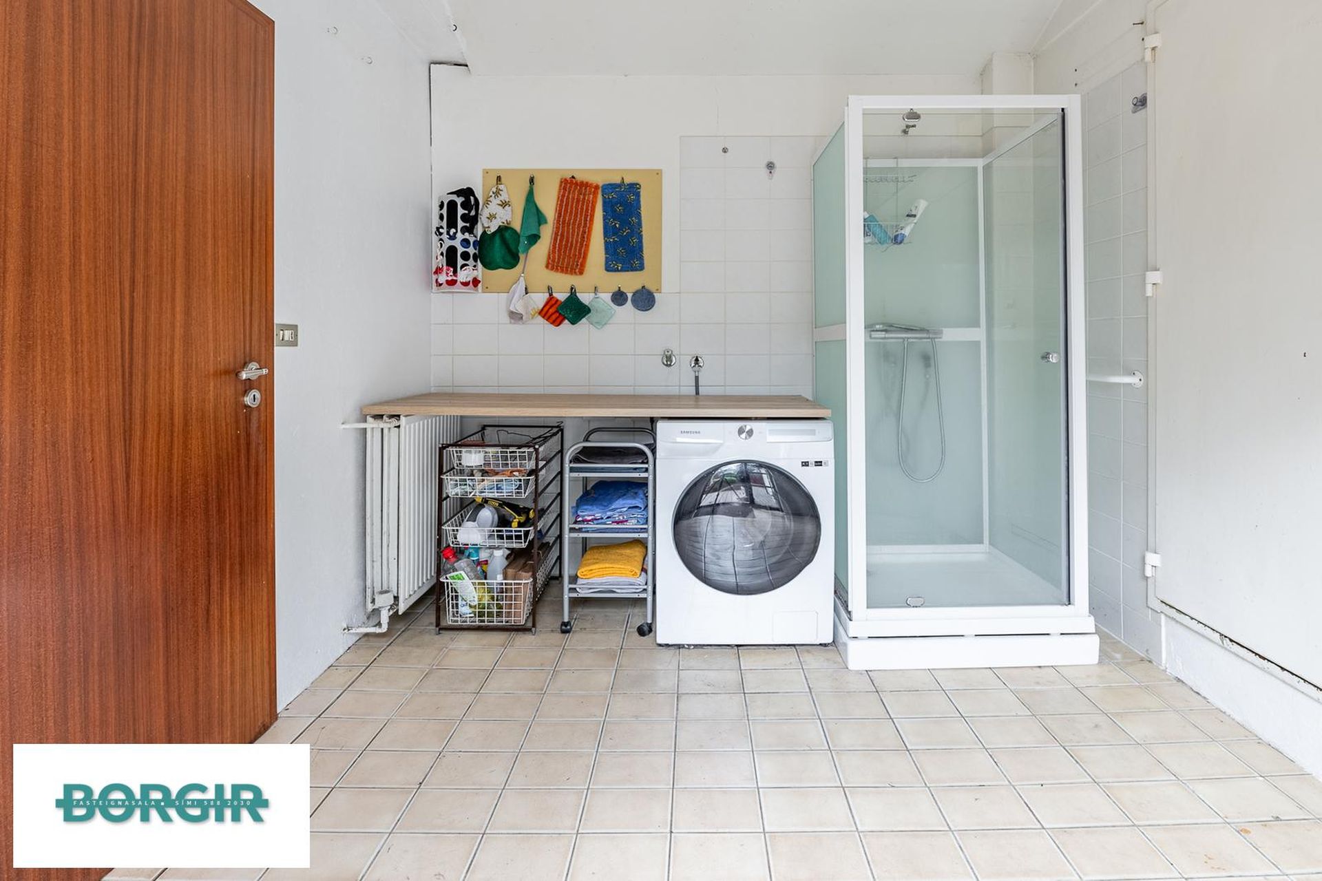 Þvottaherbergi innaf eldhúsi með sturtuklefa. Gengið úr þvottaherbergi út í garðinn á verönd og inn í bílskúrinn.