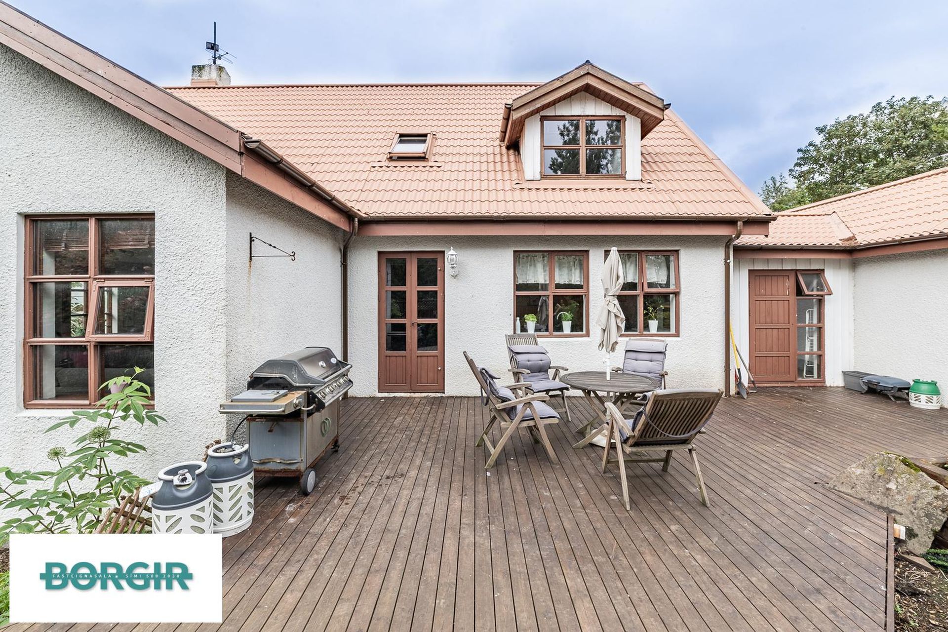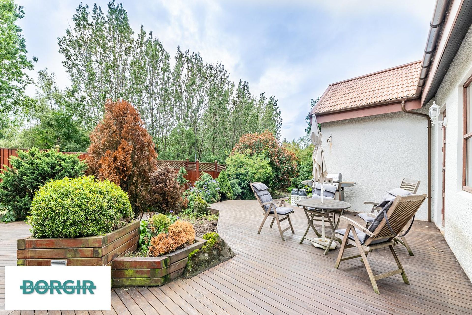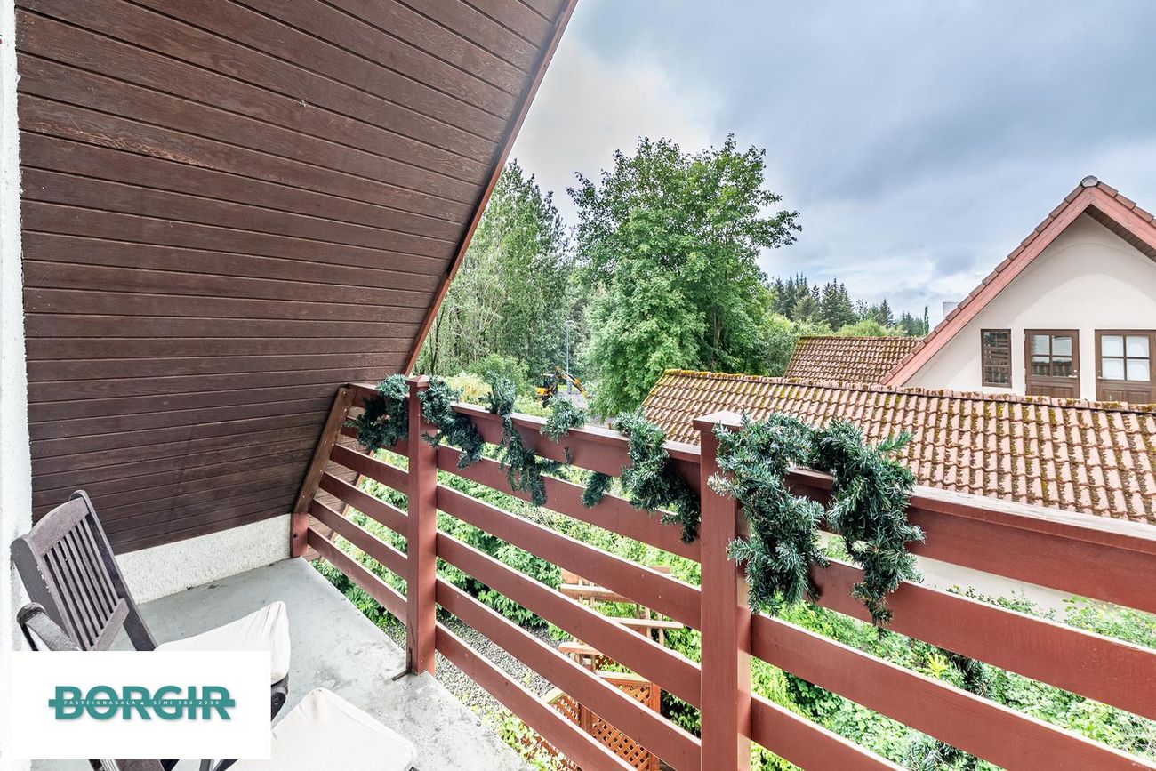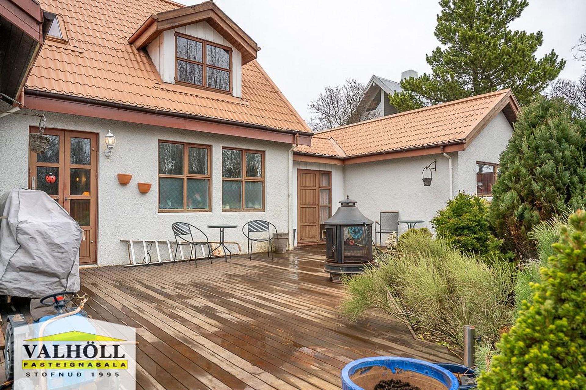 Rúmgóð verönd útgengin úr stofu. Vestursvalir útgengin úr herbergi á II hæð, í skjóli undir þaki með góðu útsýni.