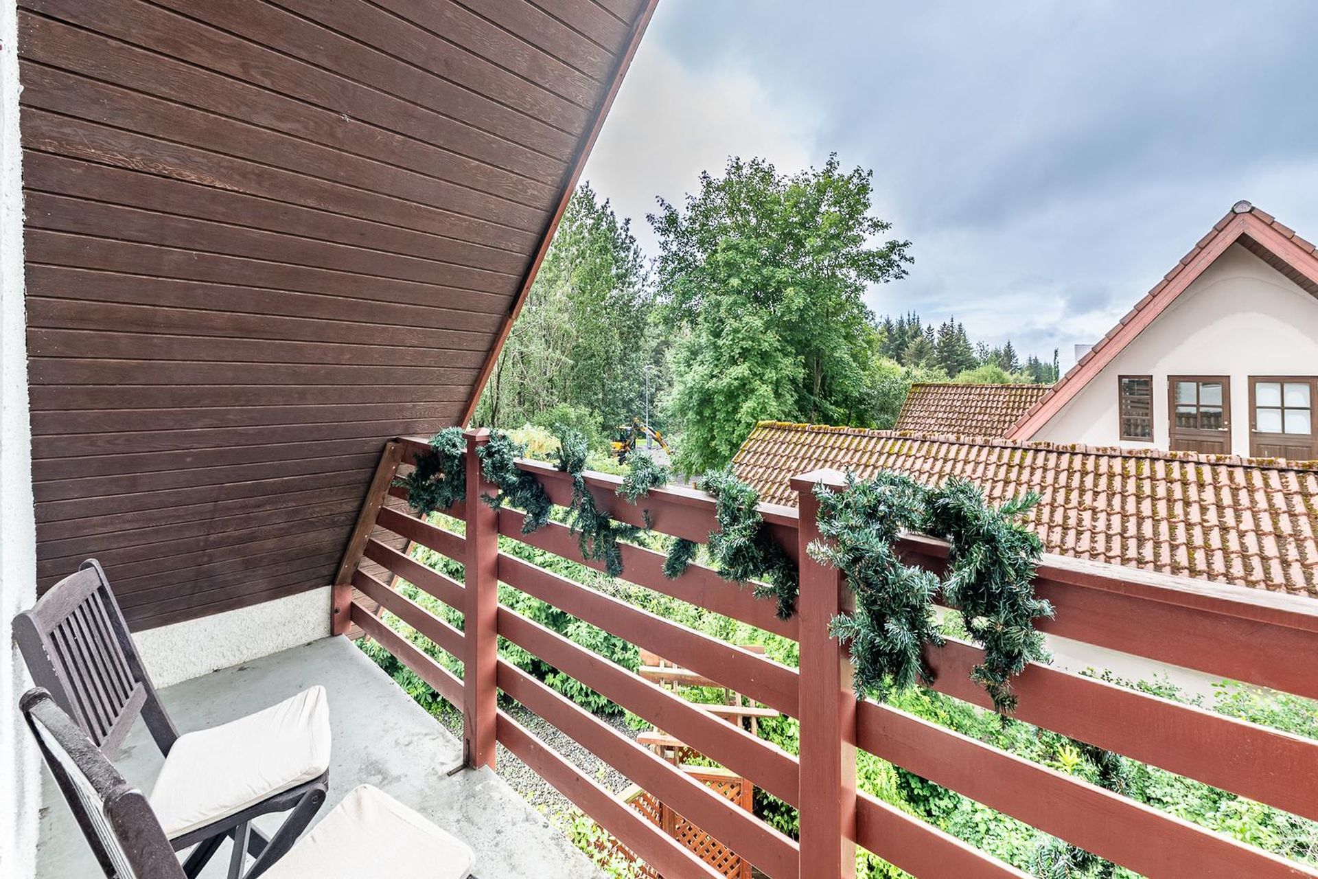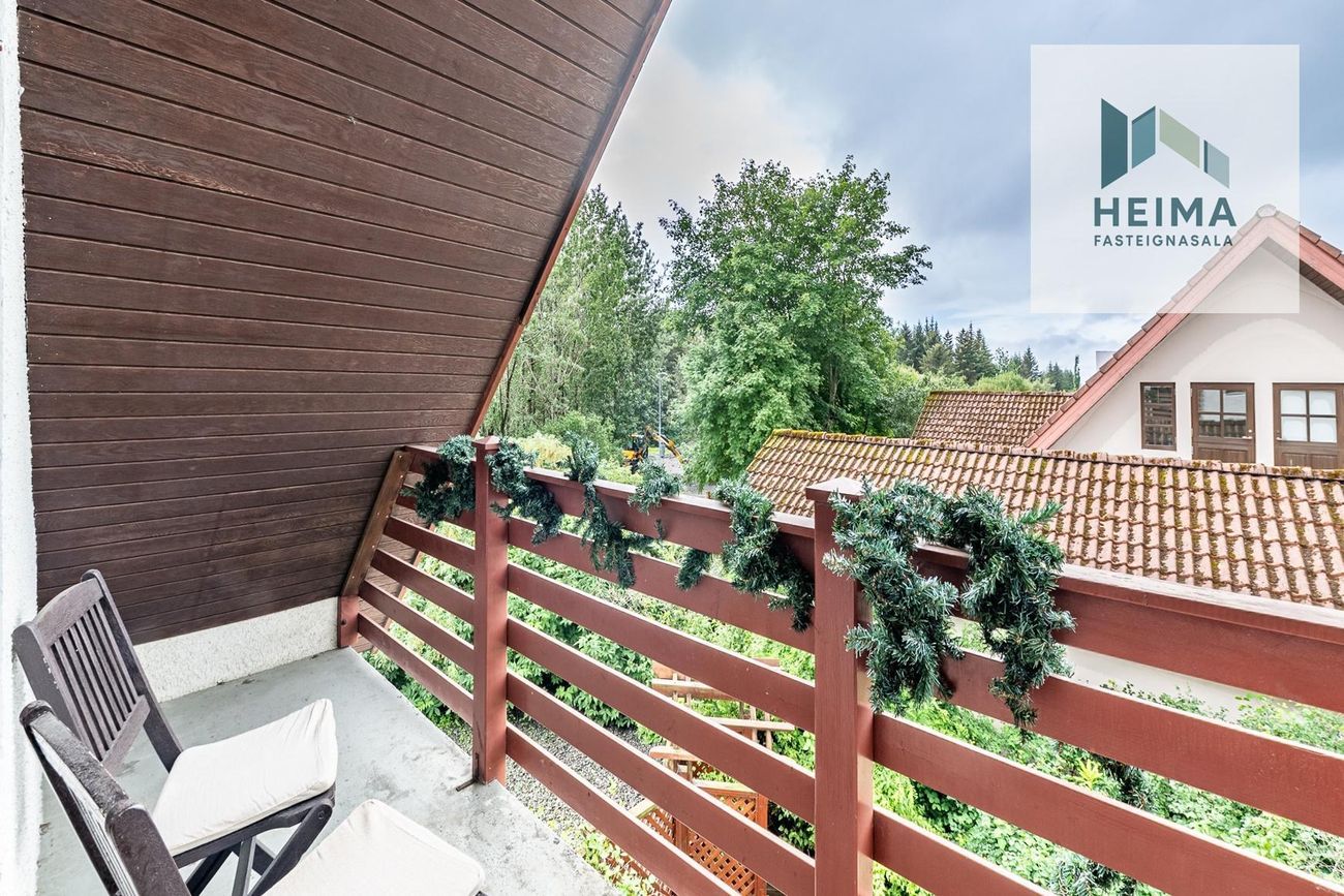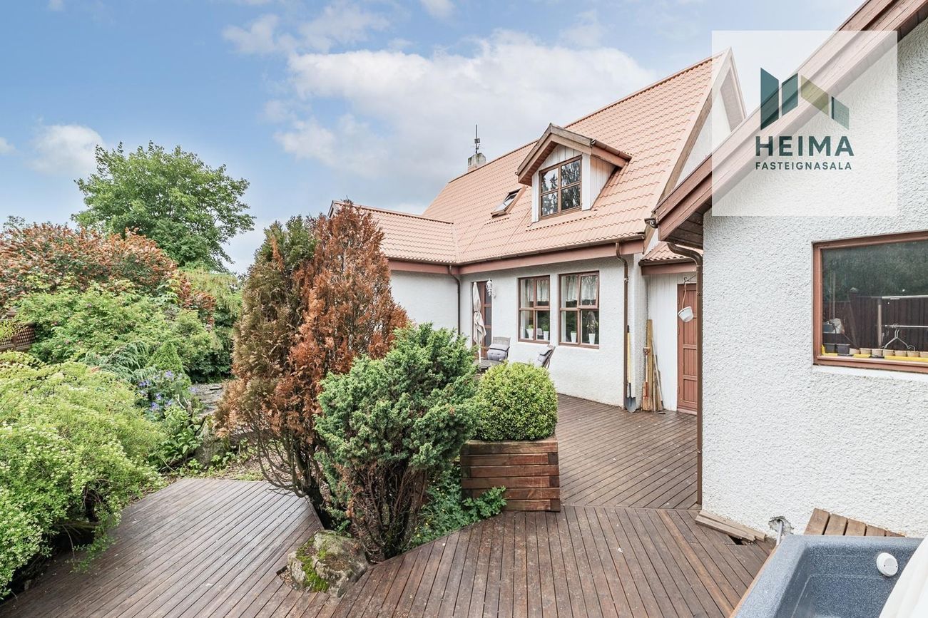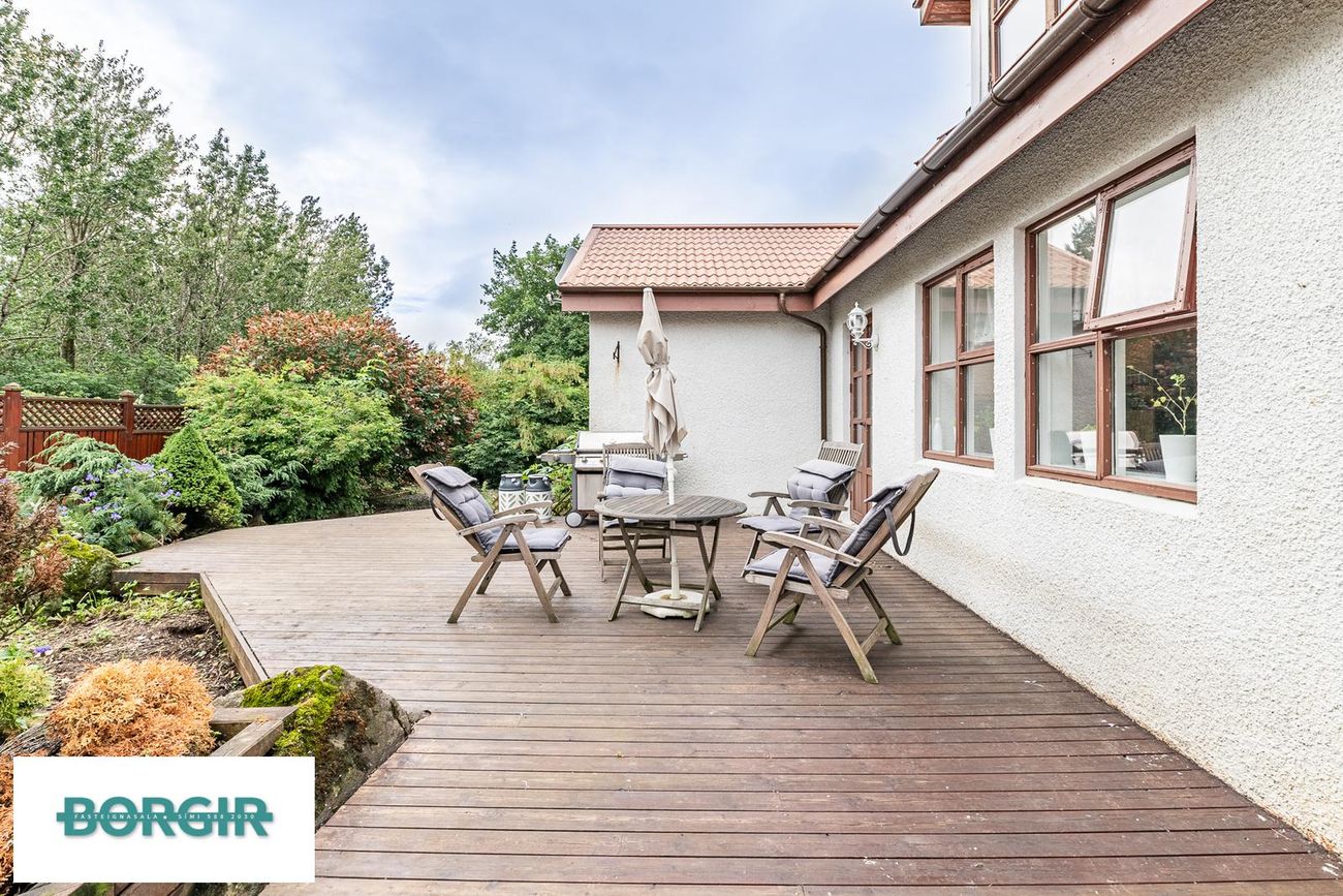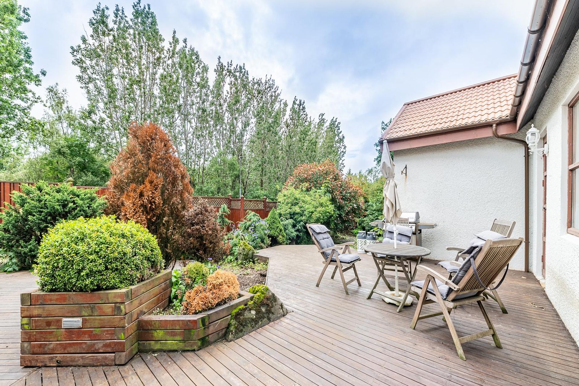 Rúmgóð verönd útgengin úr stofu. Vestursvalir útgengin úr herbergi á II hæð, í skjóli undir þaki með góðu útsýni.