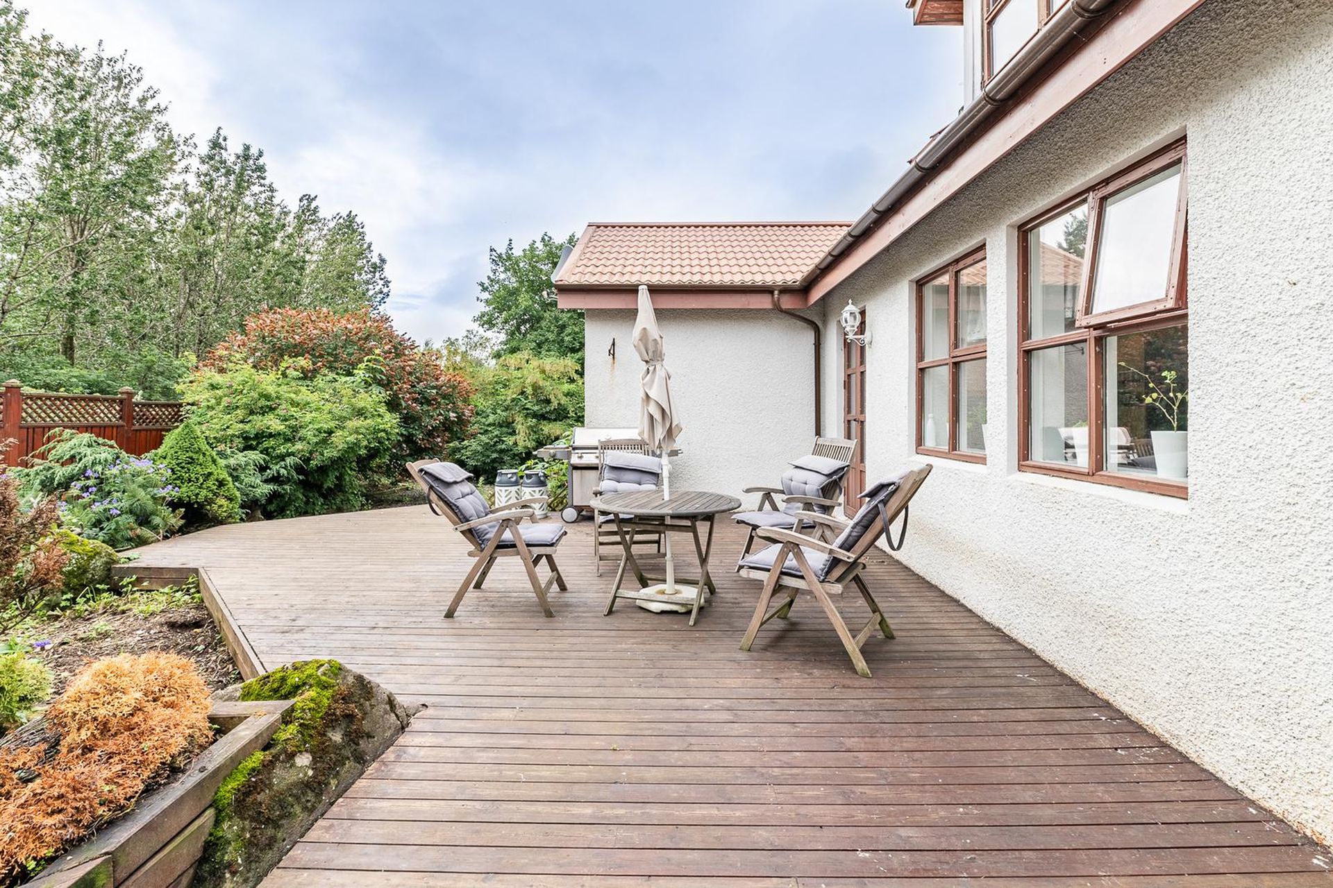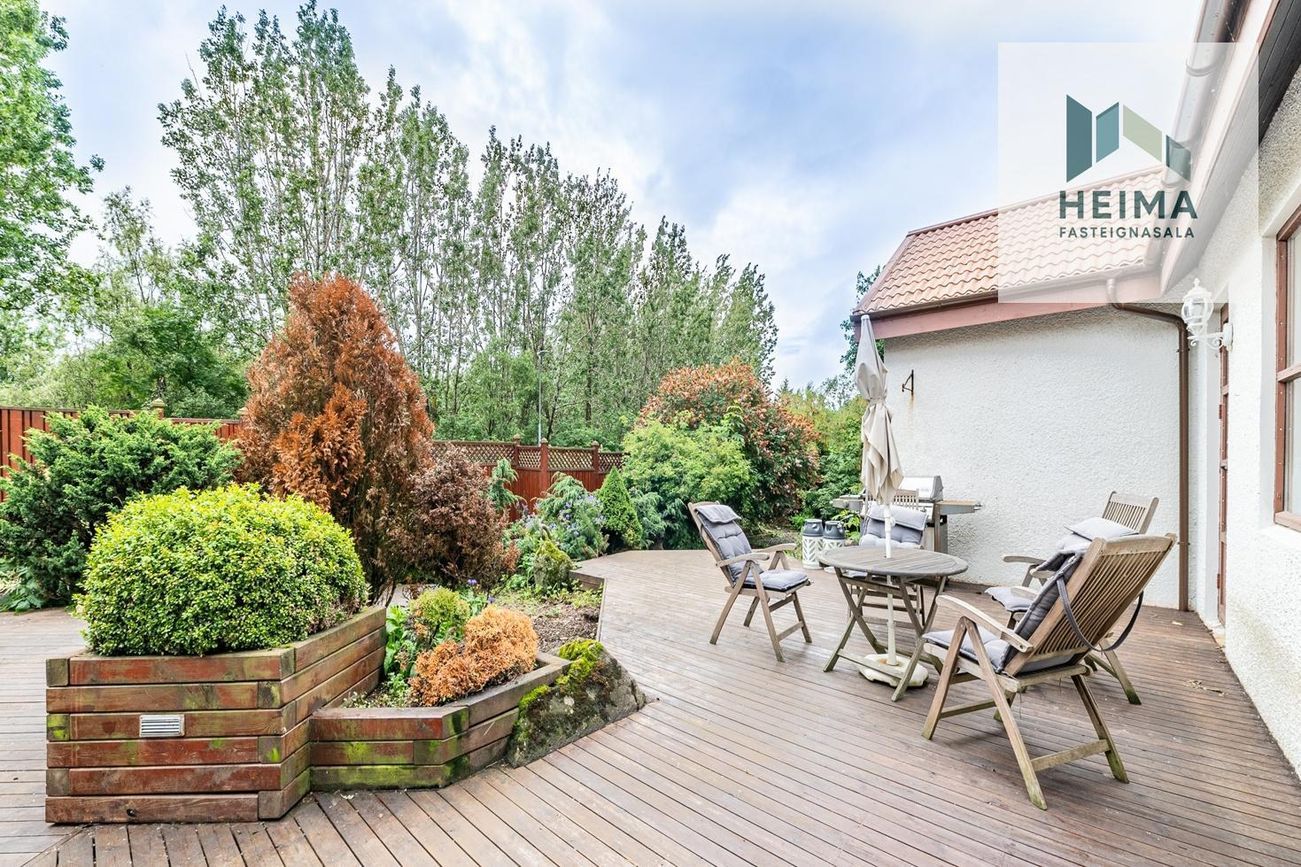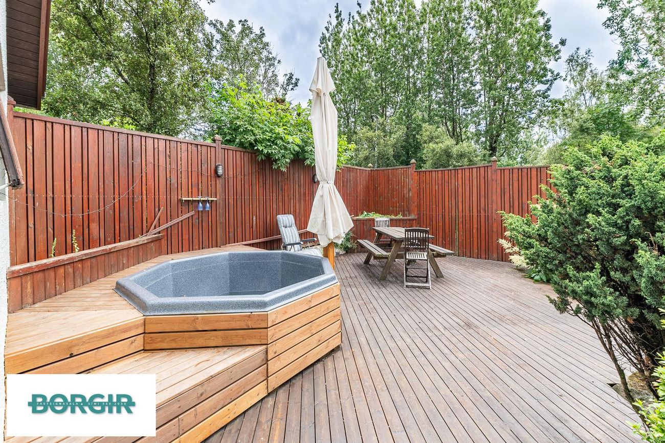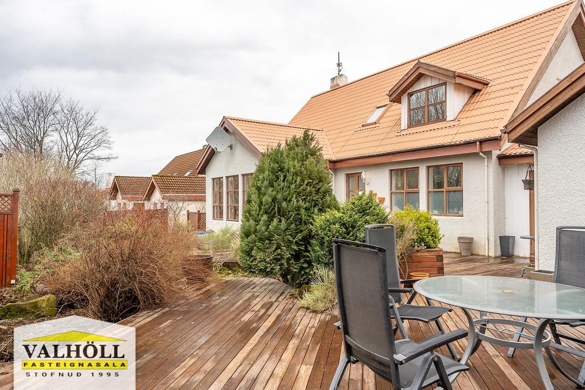 Rúmgóð verönd útgengin úr stofu. Vestursvalir útgengin úr herbergi á II hæð, í skjóli undir þaki með góðu útsýni.