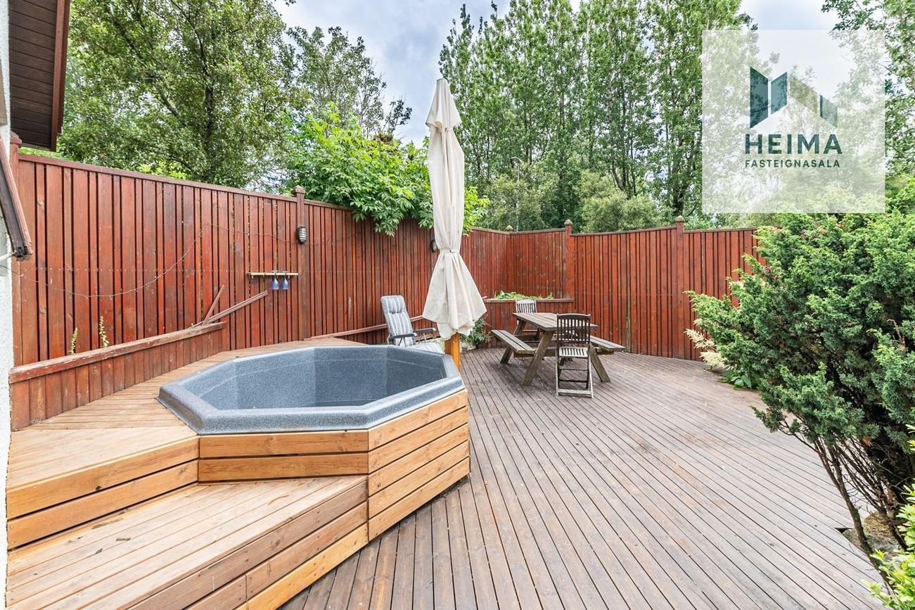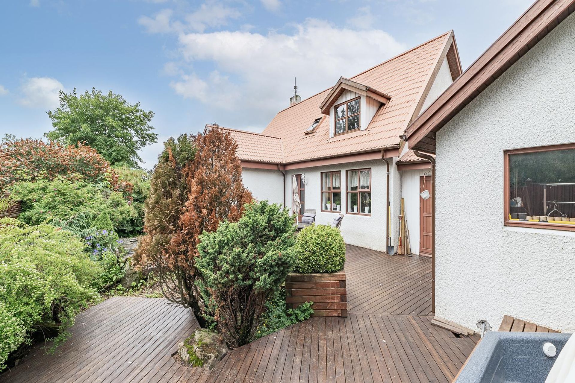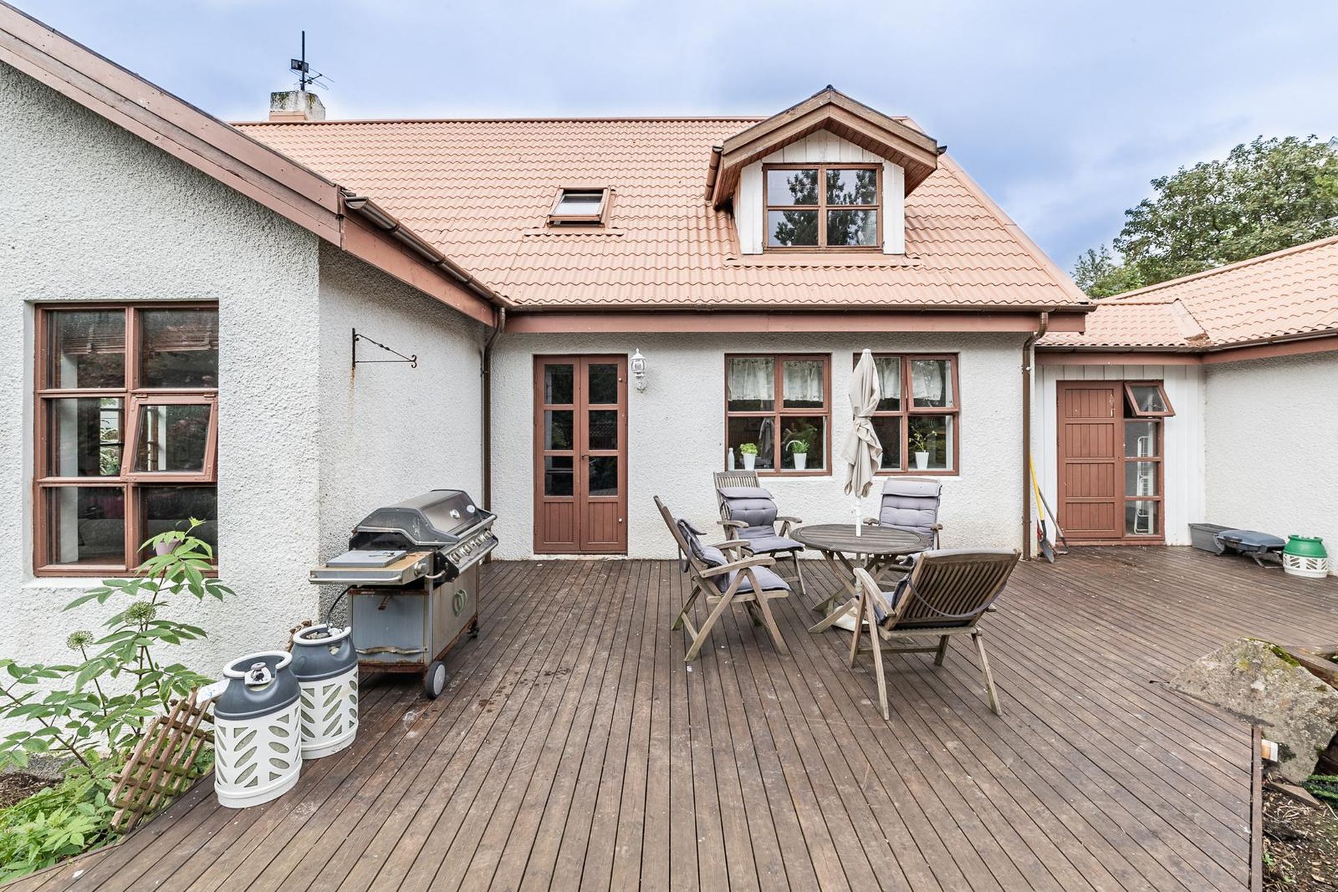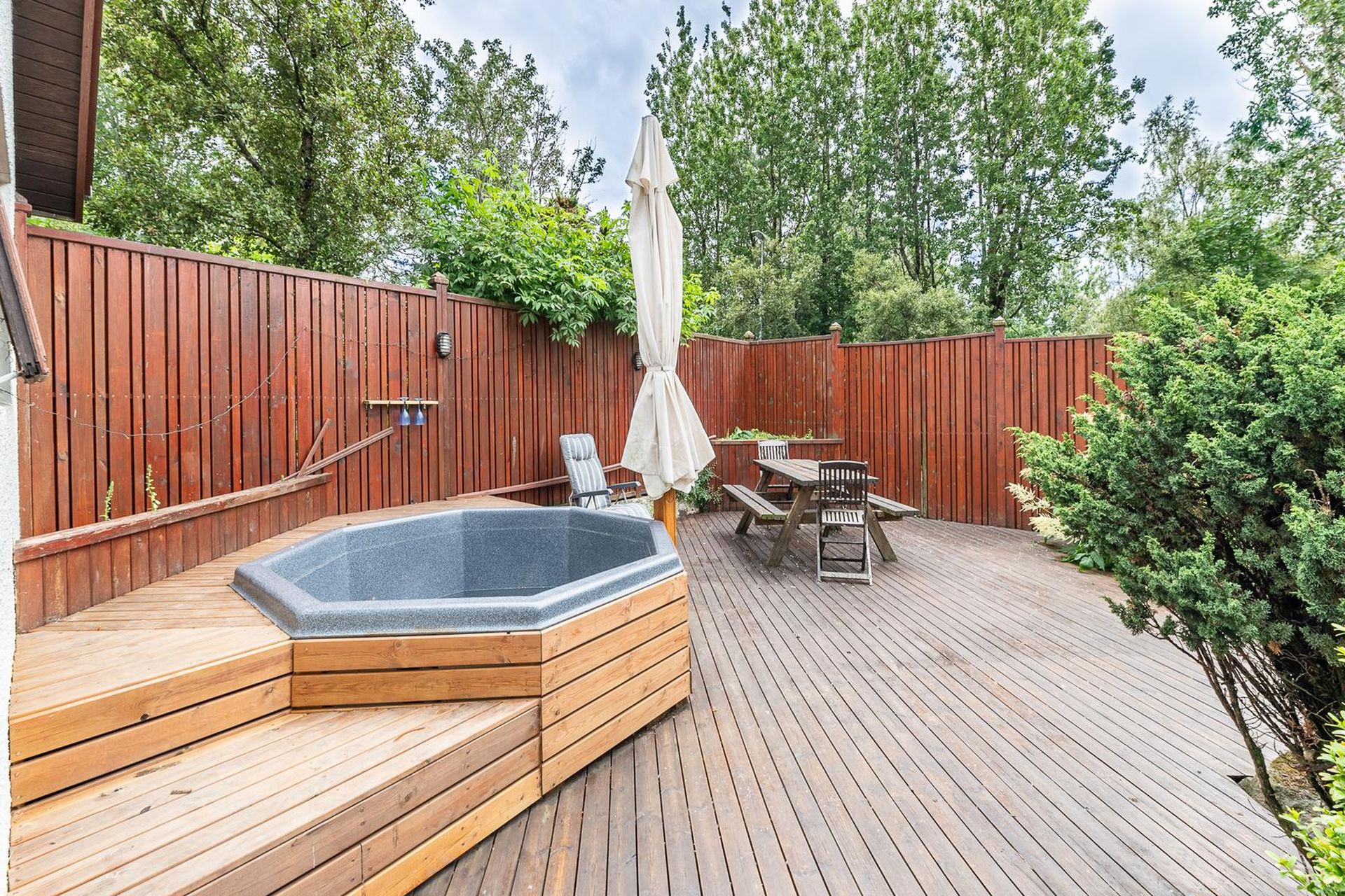 Rúmgóð verönd útgengin úr stofu. Vestursvalir útgengin úr herbergi á II hæð, í skjóli undir þaki með góðu útsýni.