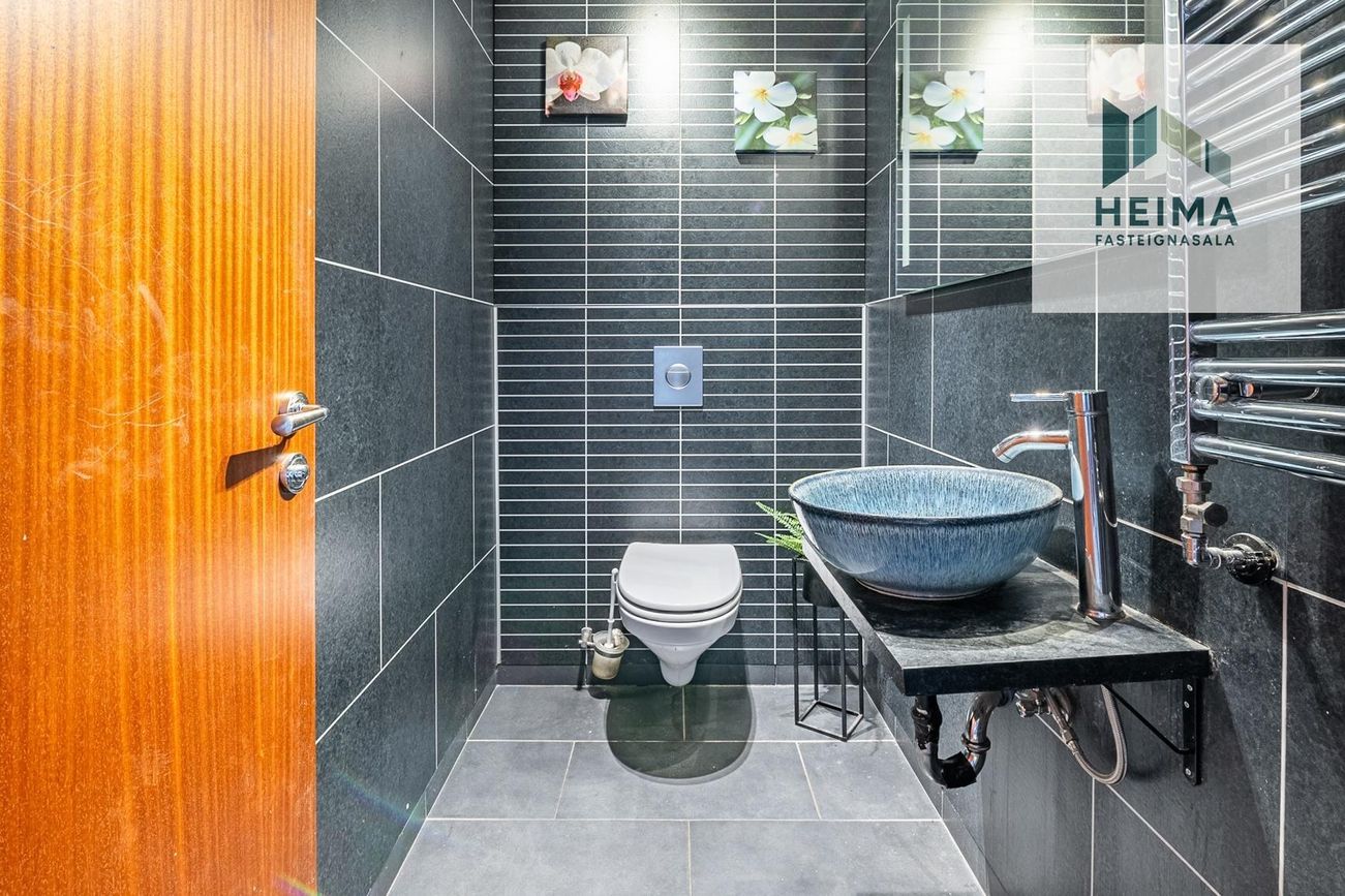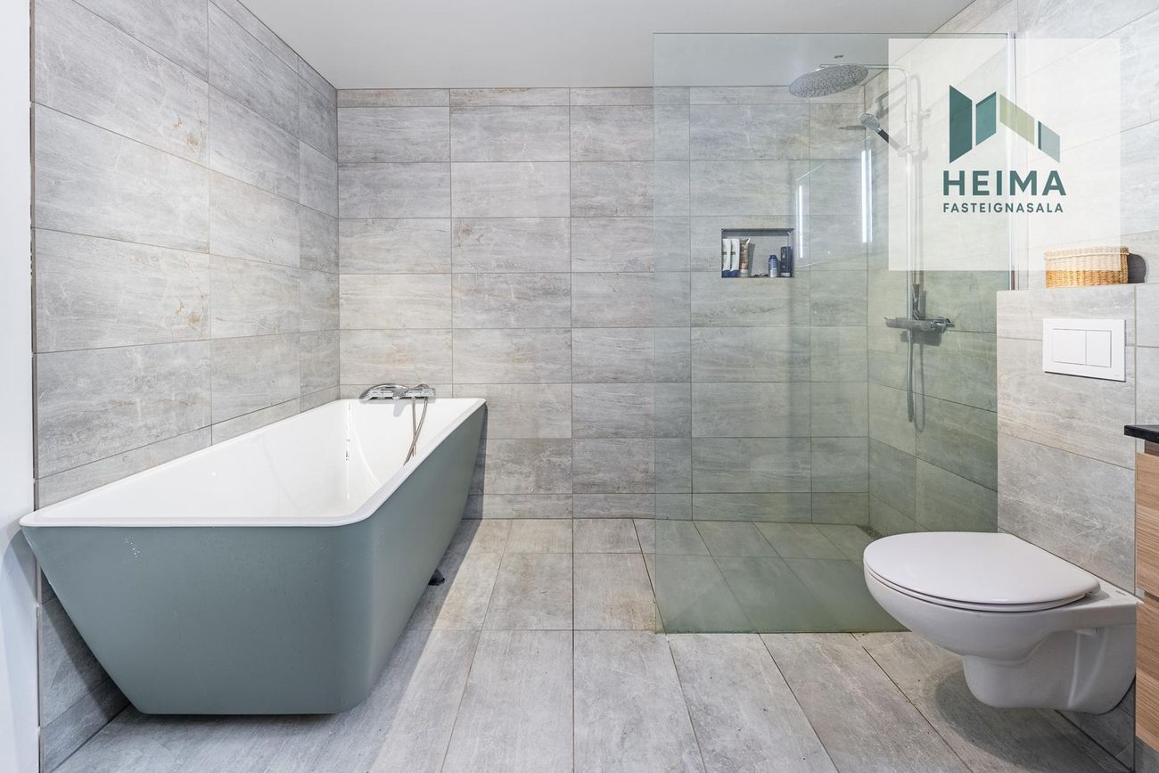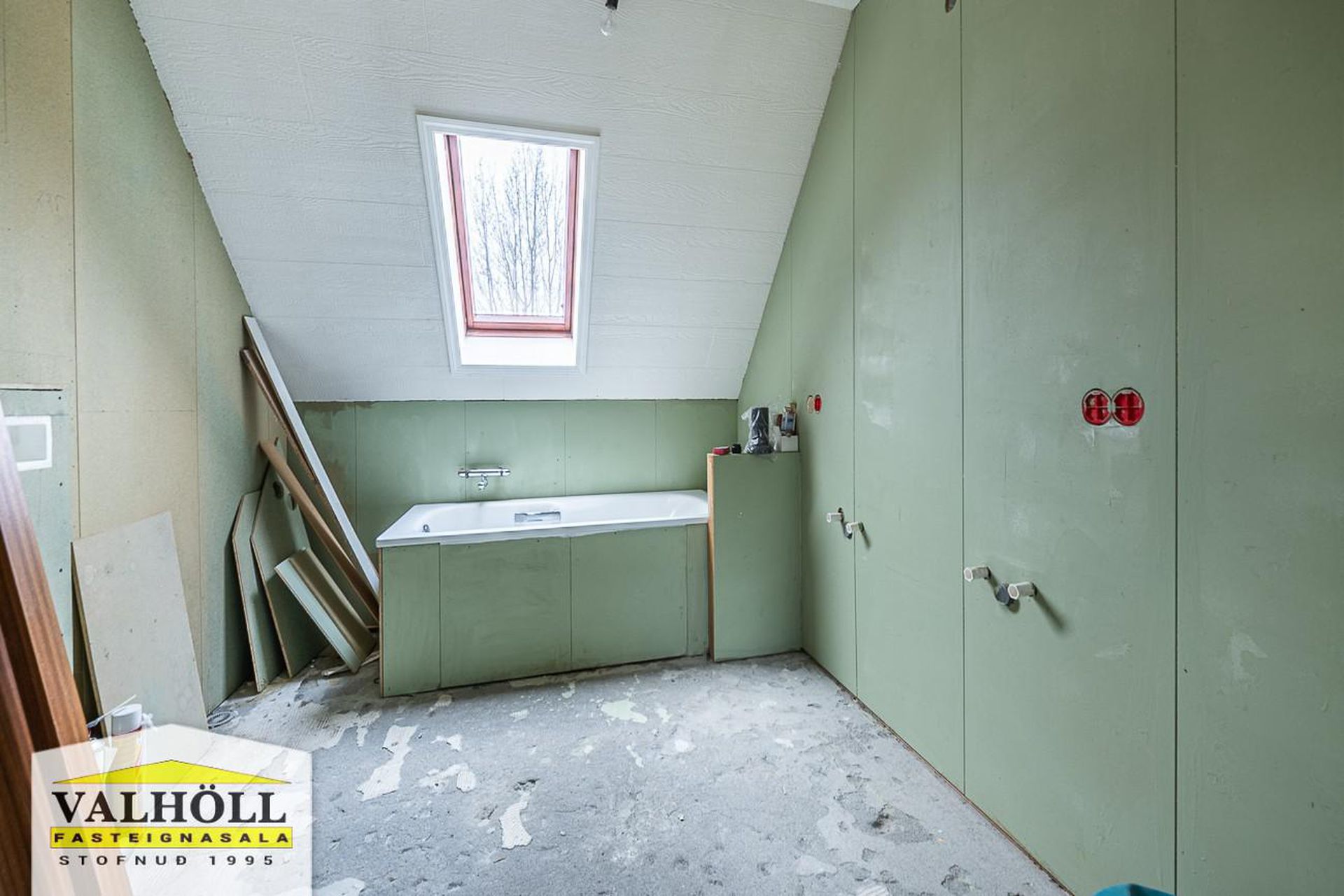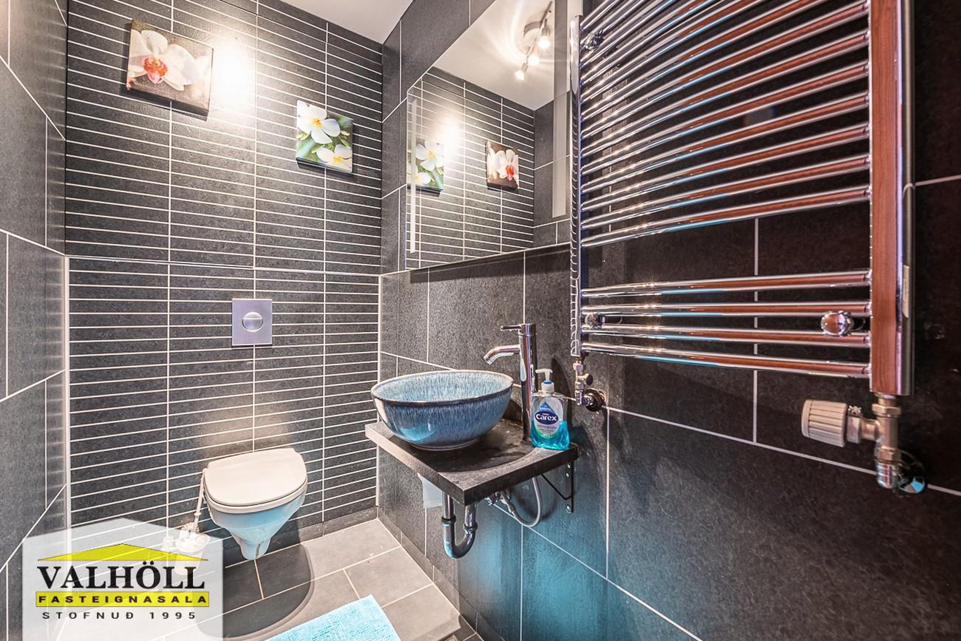 I hæð: Baðherbergi flísalagt með vegghengdu salerni og handklæðaofni. II hæð: Rúmgott baðherbergi í endurnýjun (selt í núverandi ástandi), ný loftklæðning og klósettkassi í vegg. Kjallari/aukaíbúð: Nýuppgert baðherbergi með flísum á veggjum og gólfi, walk-in sturtu með gleri, Mora blöndunartæki, IKEA innréttingum, sérlögn í þvottavél og geymslu.