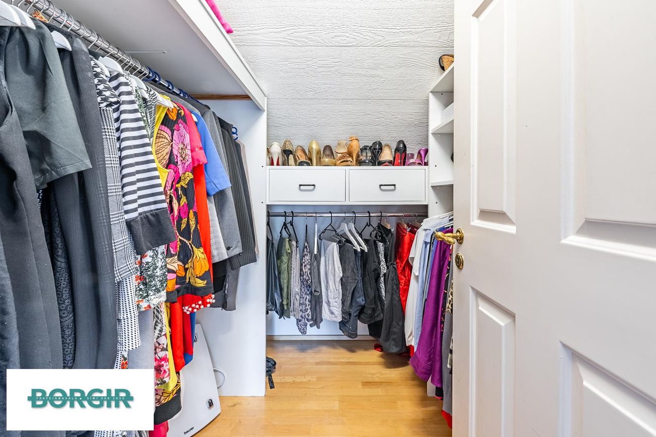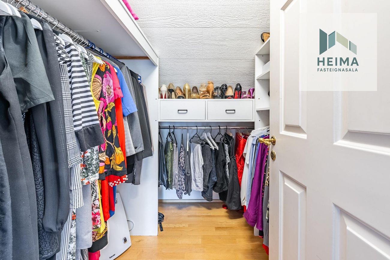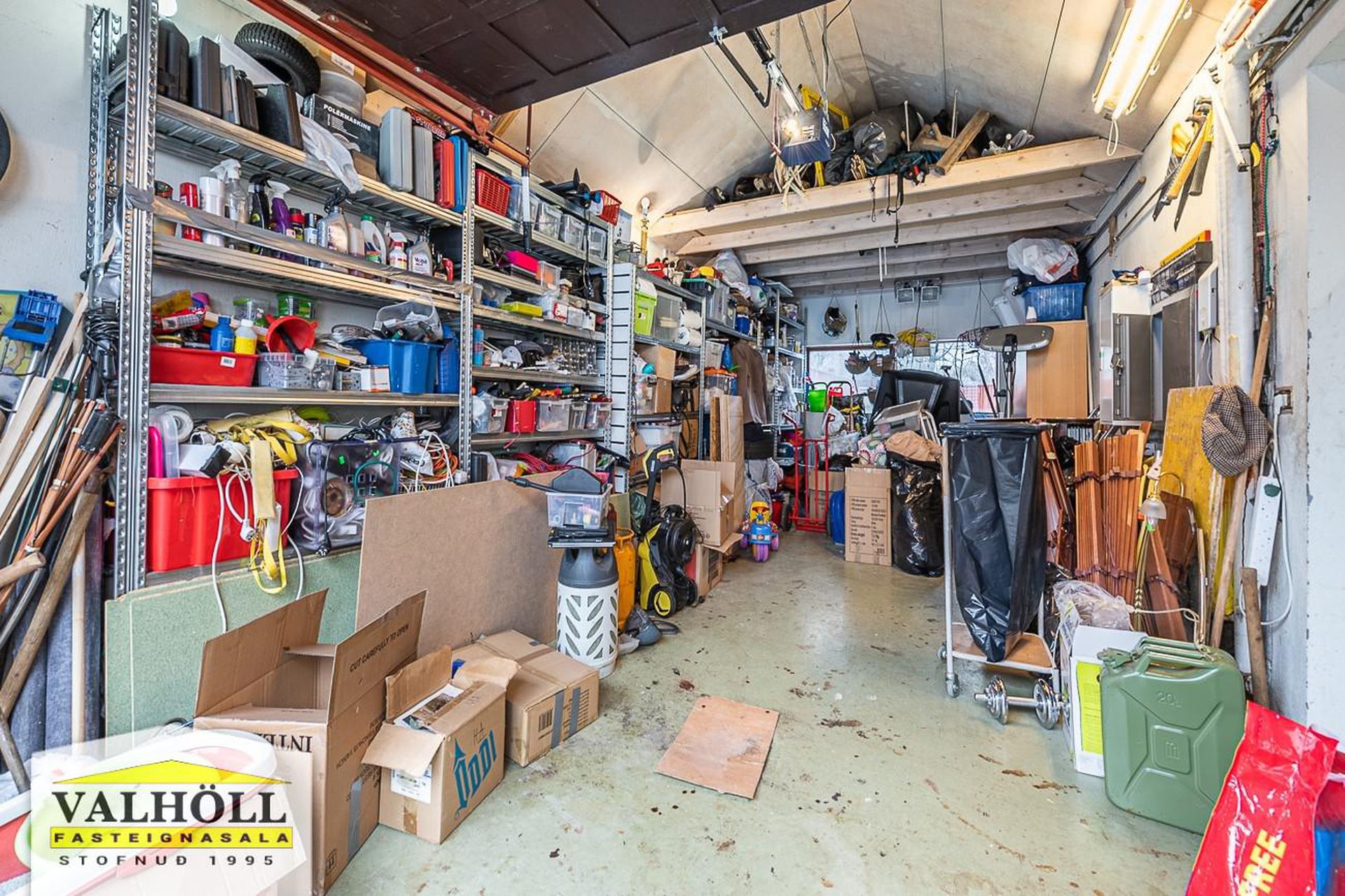 Mikið geymslupláss. Gangur/Hol á I hæð með miklum skápum. Háaloft yfir rishæðinni (geymsluloft) með niðurdraganlegum stiga og mikið geymslupláss. Stór bókahilla og geymslupláss í kjallara. Rúmgóð geymsla innaf eldhúsi í kjallara/aukaíbúð með góðu hilluplássi. Fatahengi í forstofu.
