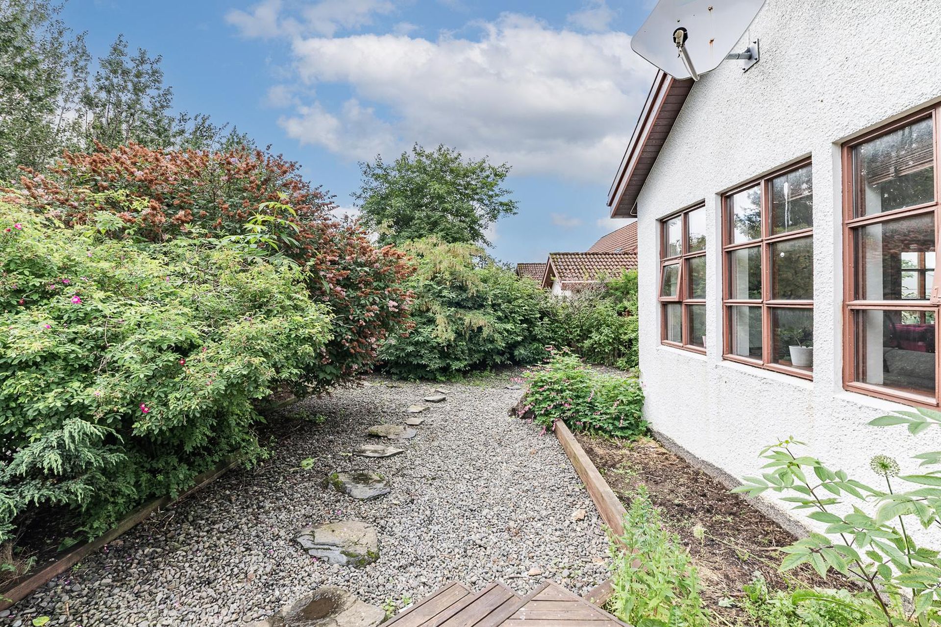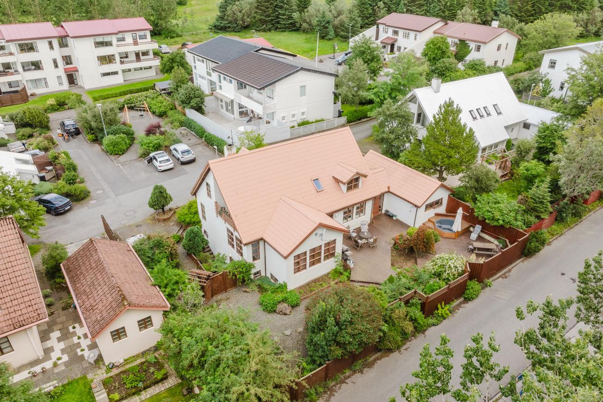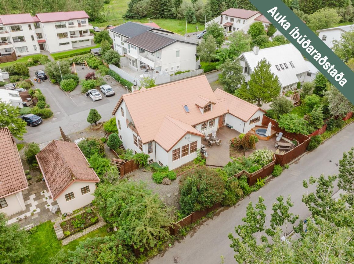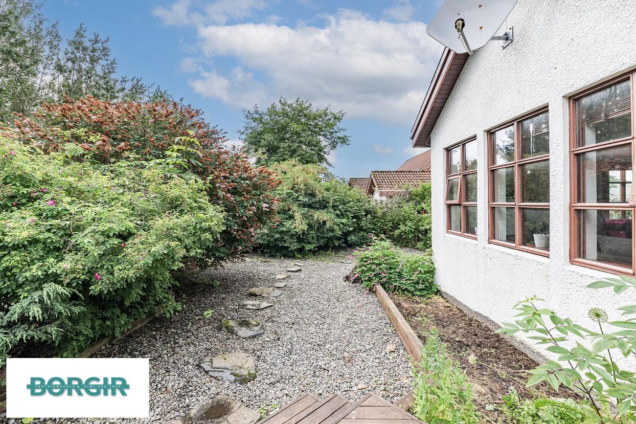 Falleg ræktuð lóð með stórum afgirtum sólpöllum til suðurs og fallegum fjölbreyttum gróði. Garður hannaður af Stanislas Bohic og endurgerður um 2005, með drenlögn meðfram húsinu. Hellulagt bílaplan og stétt við aðalhúsið með hitalögn. Hellulagt bílaplan við aukaíbúðina.