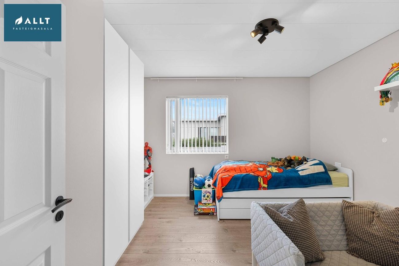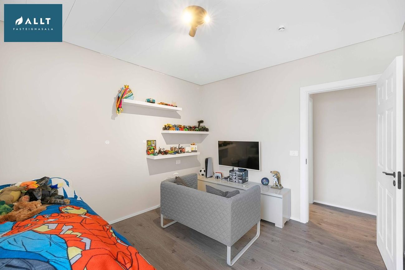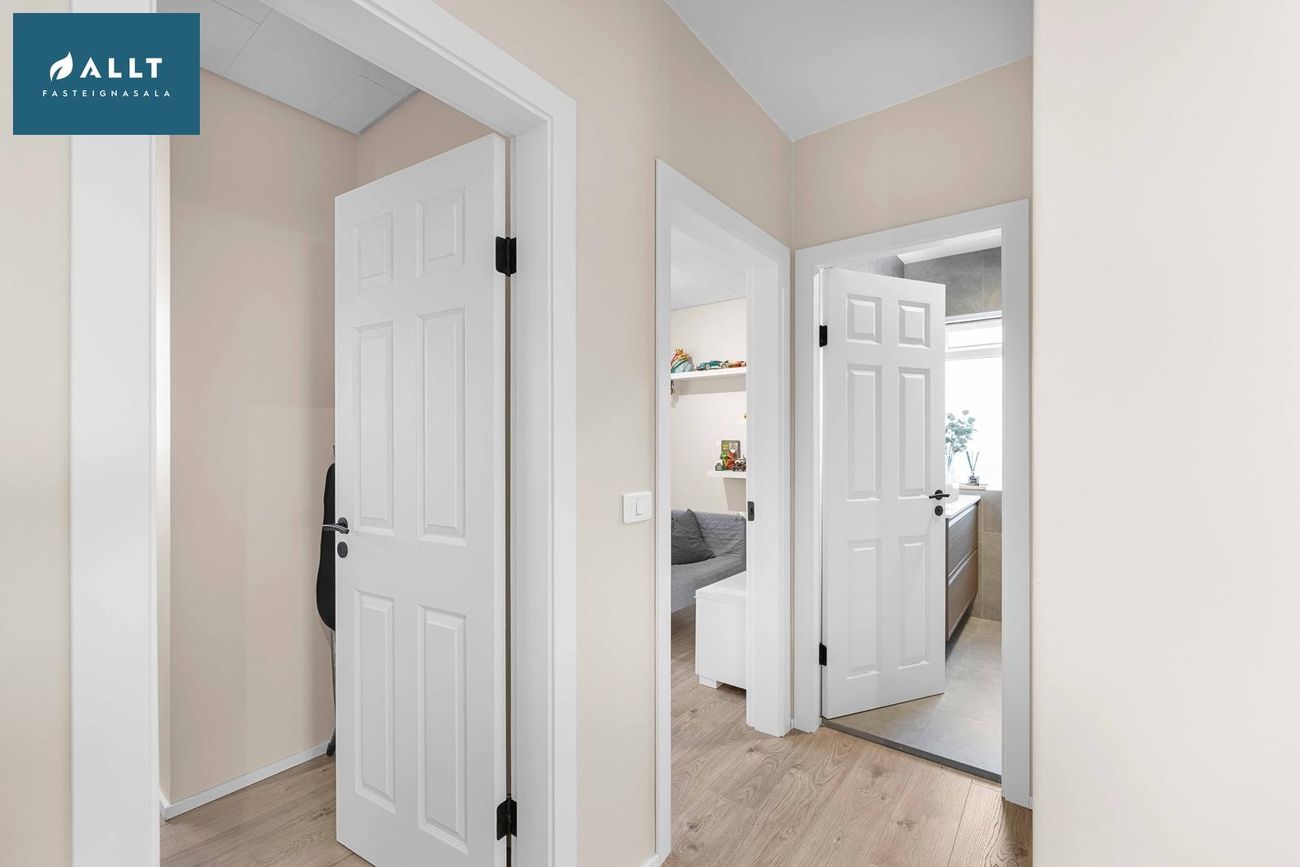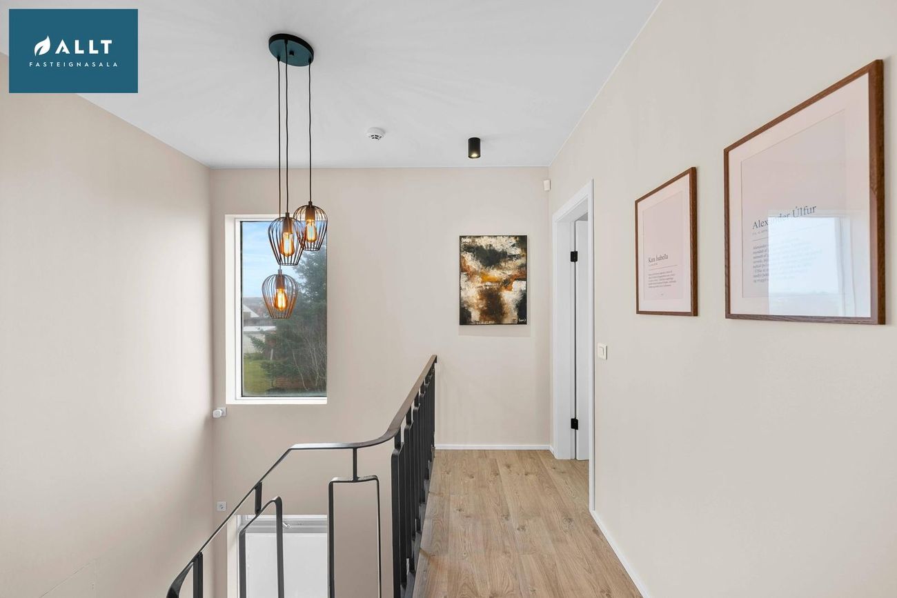 Parket frá Birgisson á öllum gólfum nema á stiga (teppi úr Álfaborg), gæða undirlag fyrir hljóðeinangrun, flísar í baðherbergi.