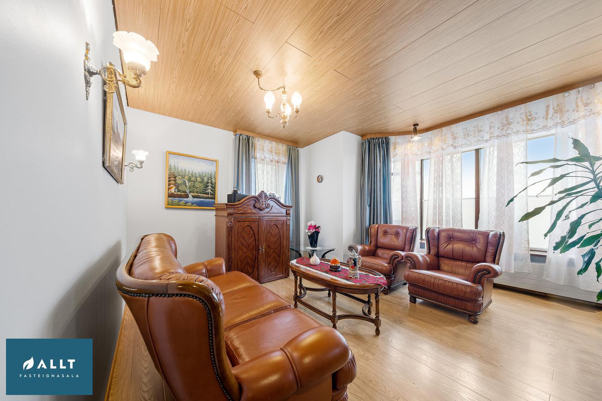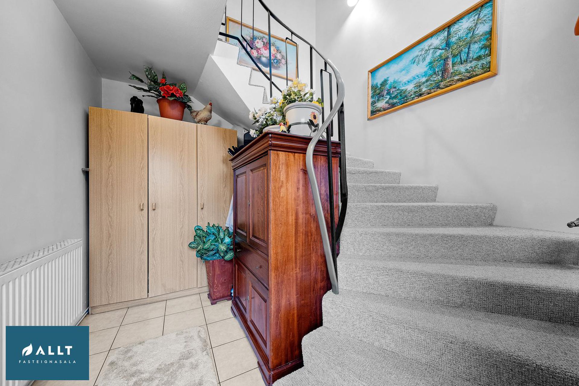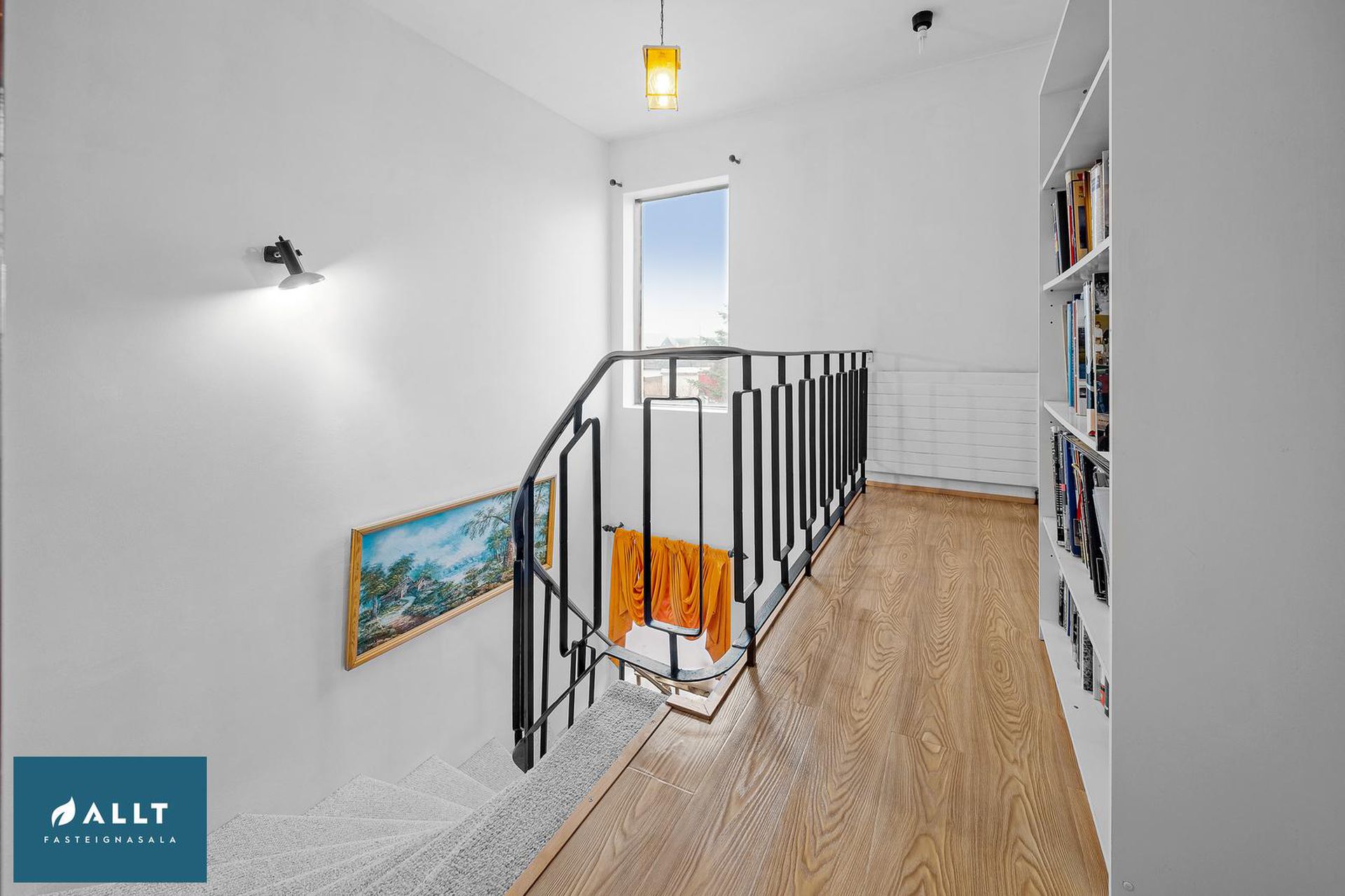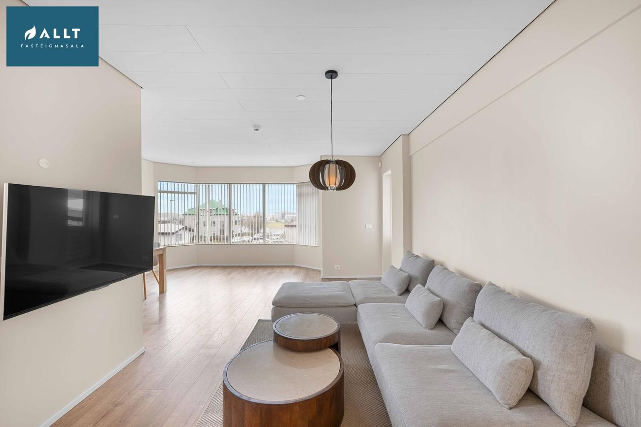 Parket frá Birgisson á öllum gólfum nema á stiga (teppi úr Álfaborg), gæða undirlag fyrir hljóðeinangrun, flísar í baðherbergi.