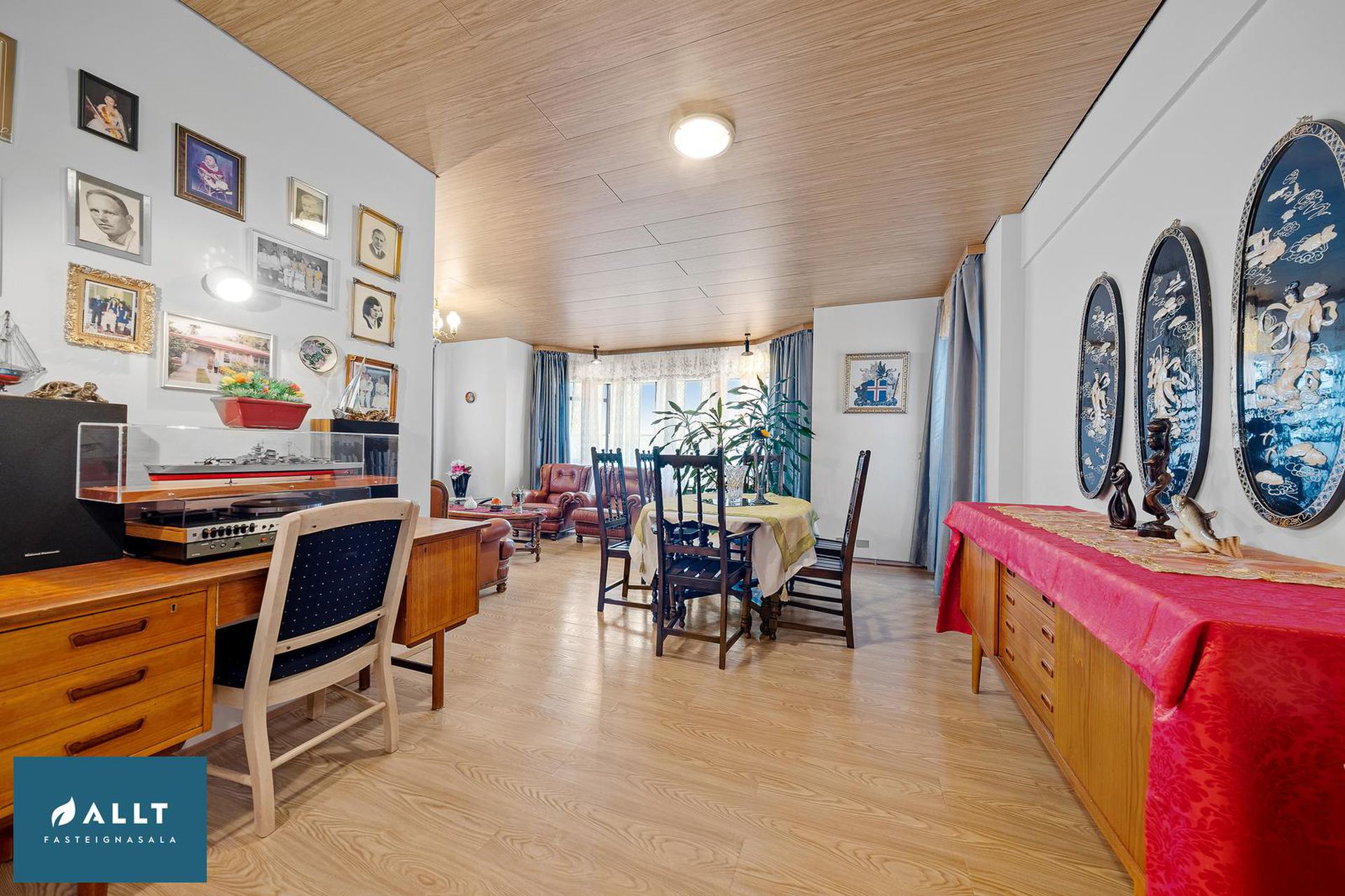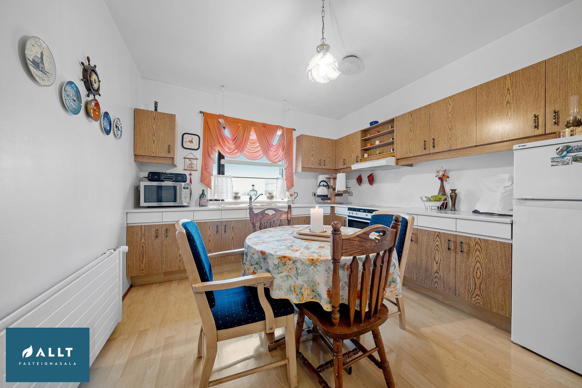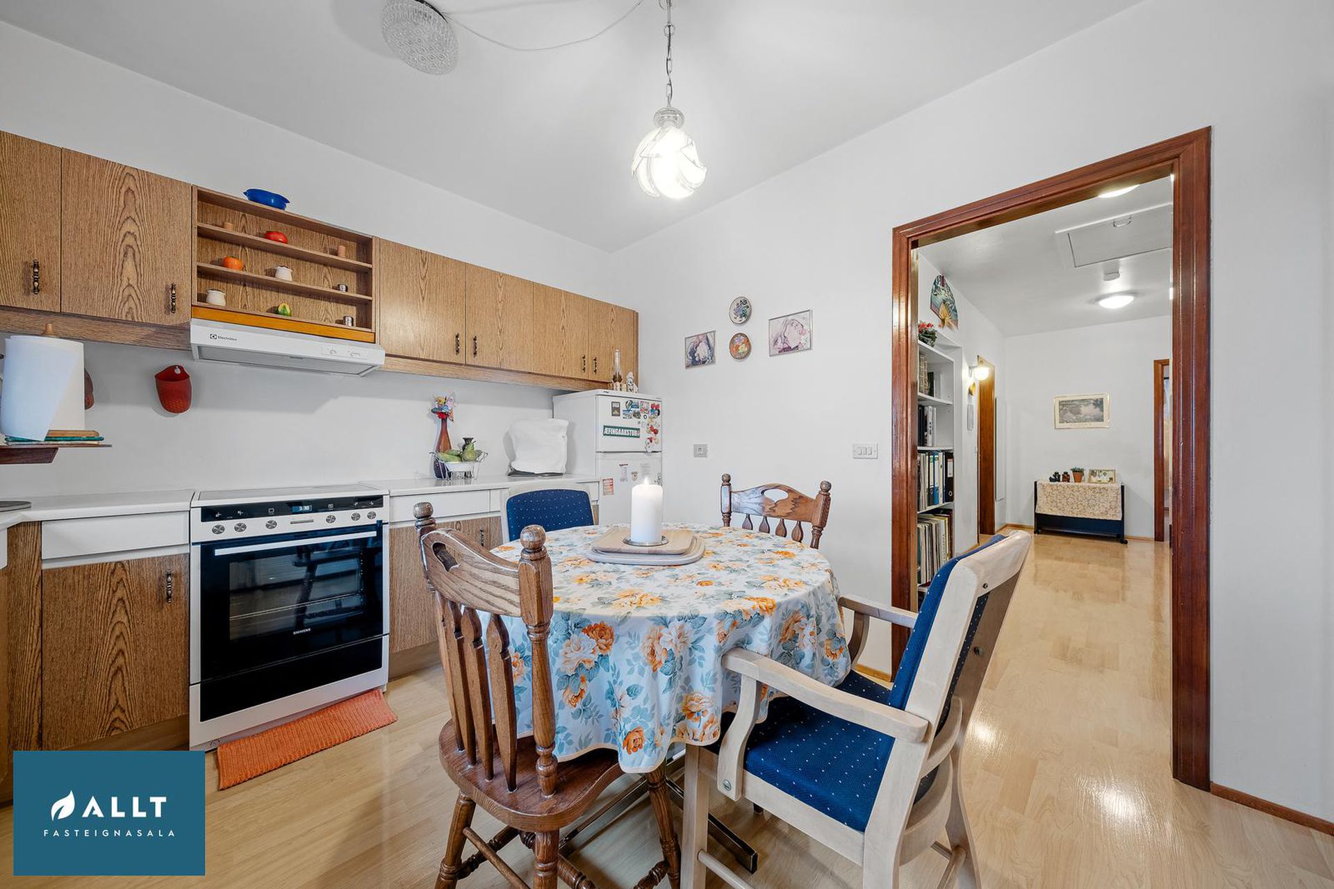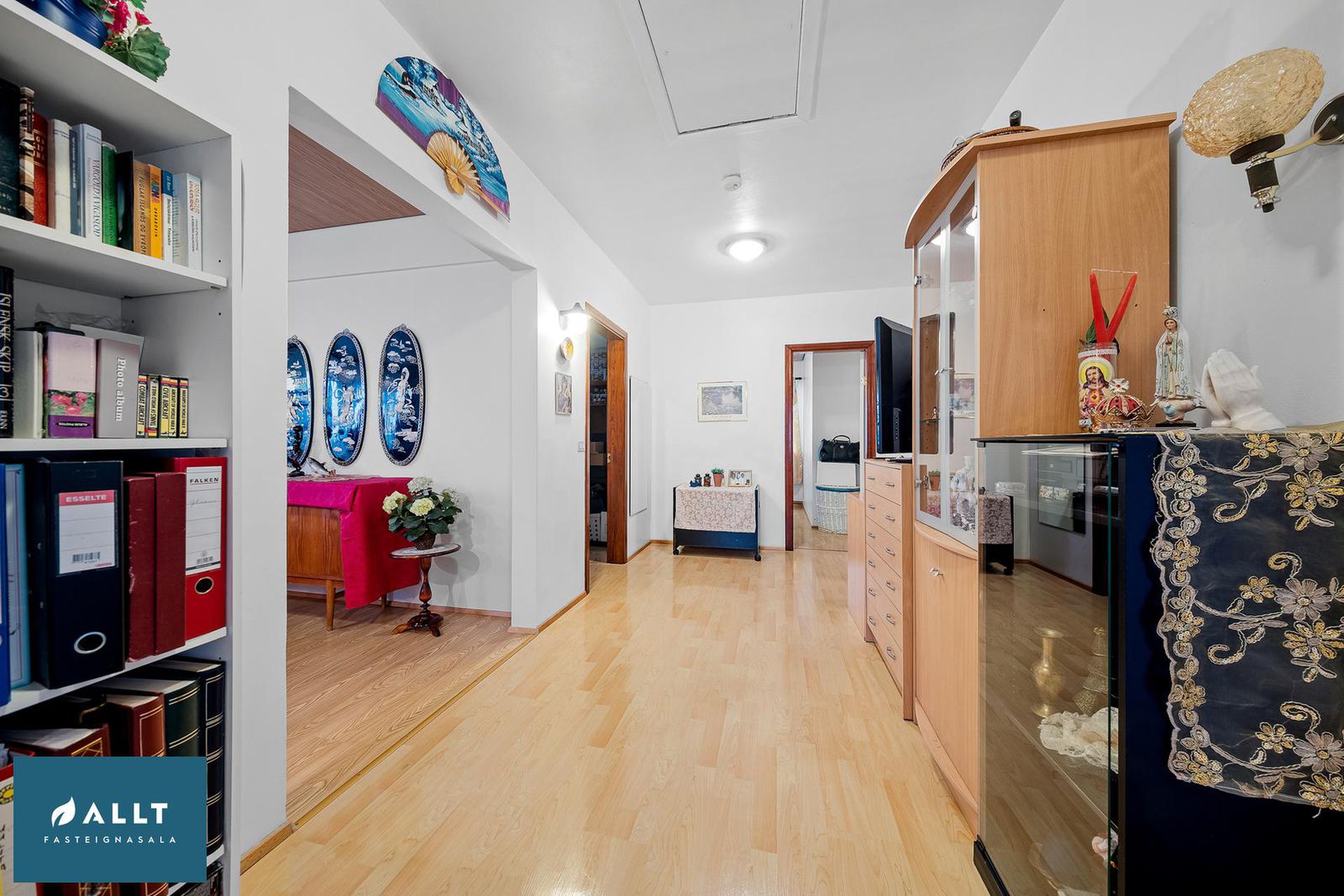 Parket frá Birgisson á öllum gólfum nema á stiga (teppi úr Álfaborg), gæða undirlag fyrir hljóðeinangrun, flísar í baðherbergi.