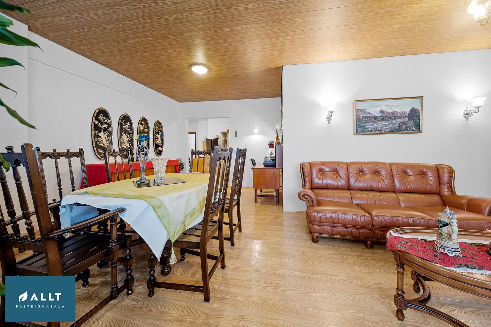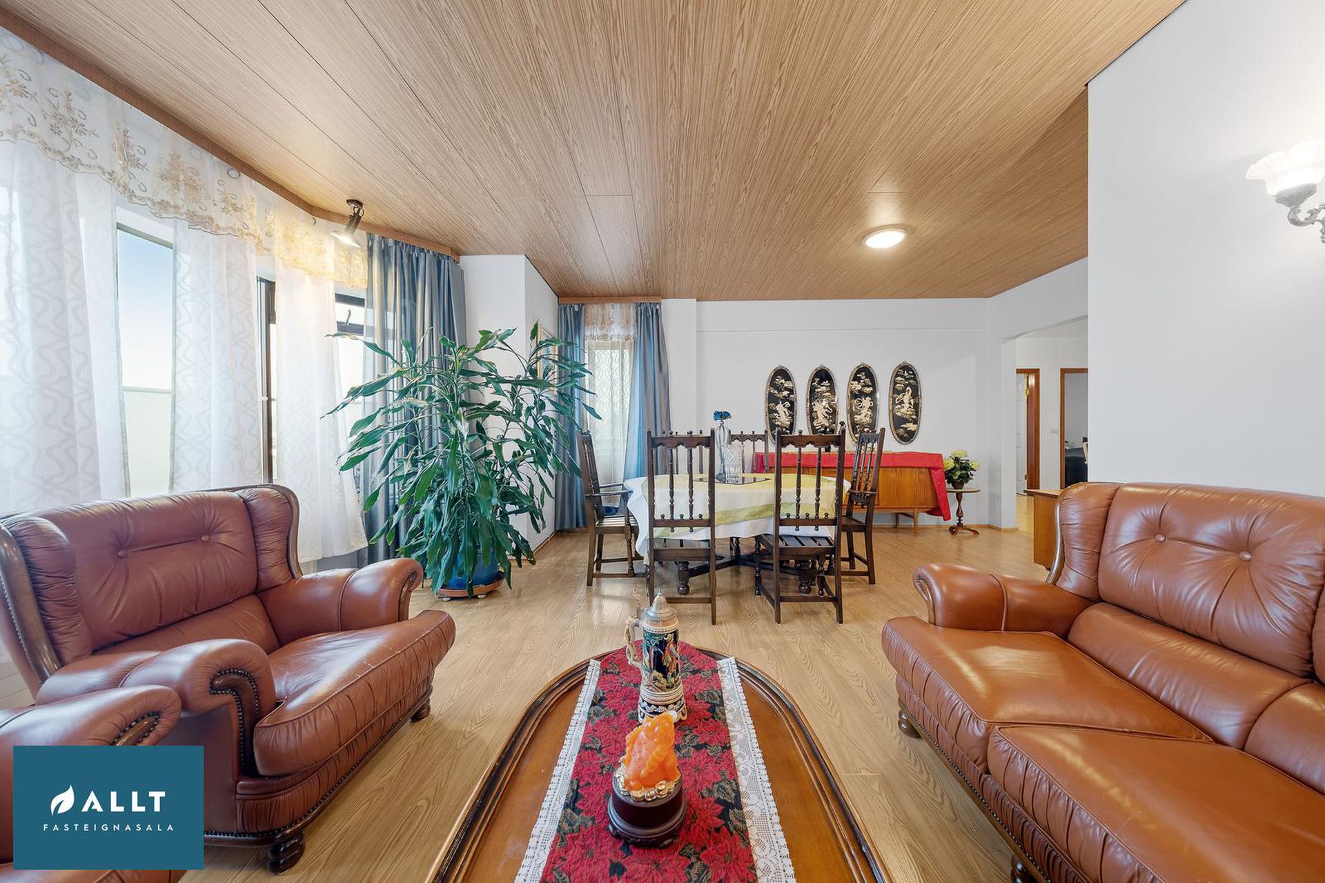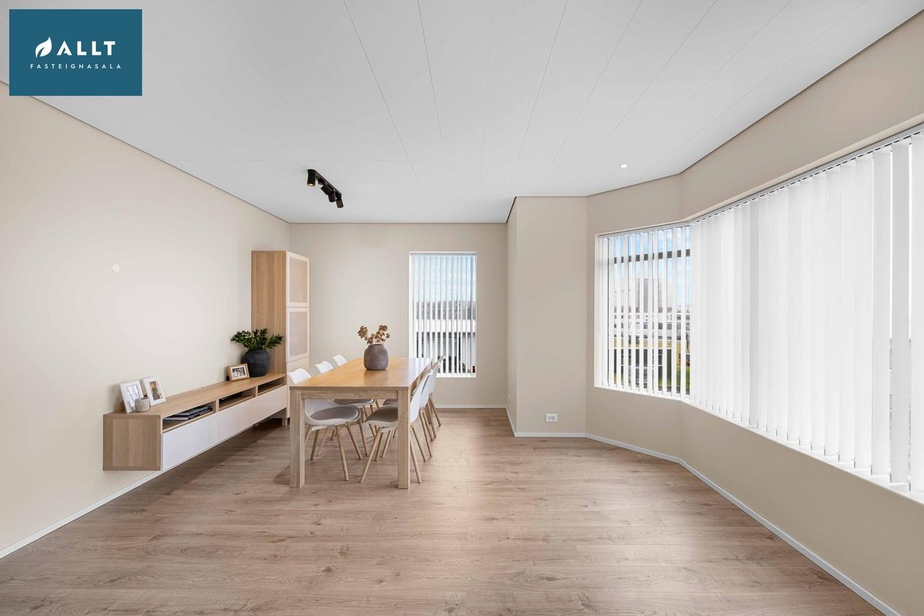 Rúmgóð stofa og borðstofa í samliggjandi rými með útgöngu á svalir.