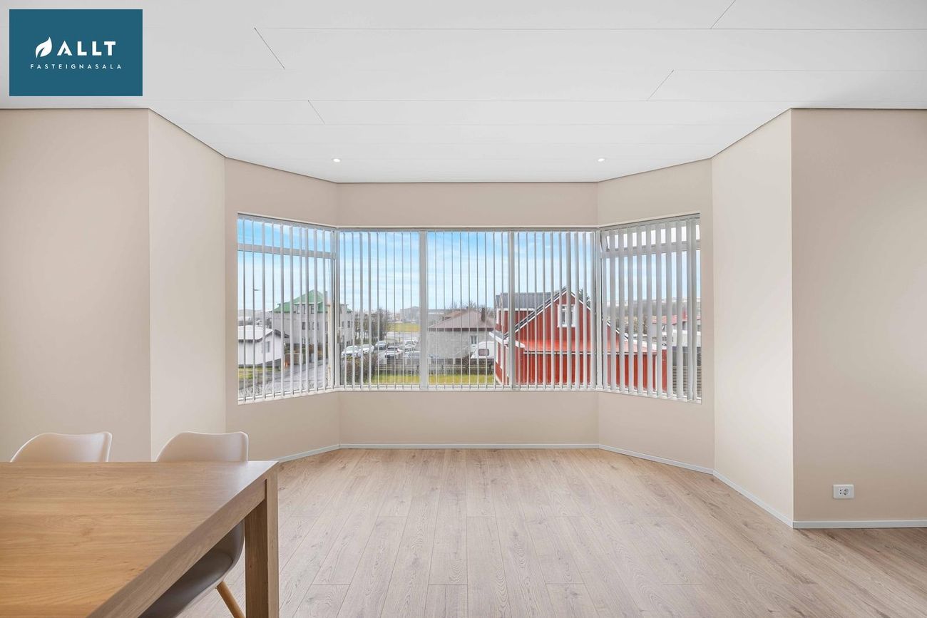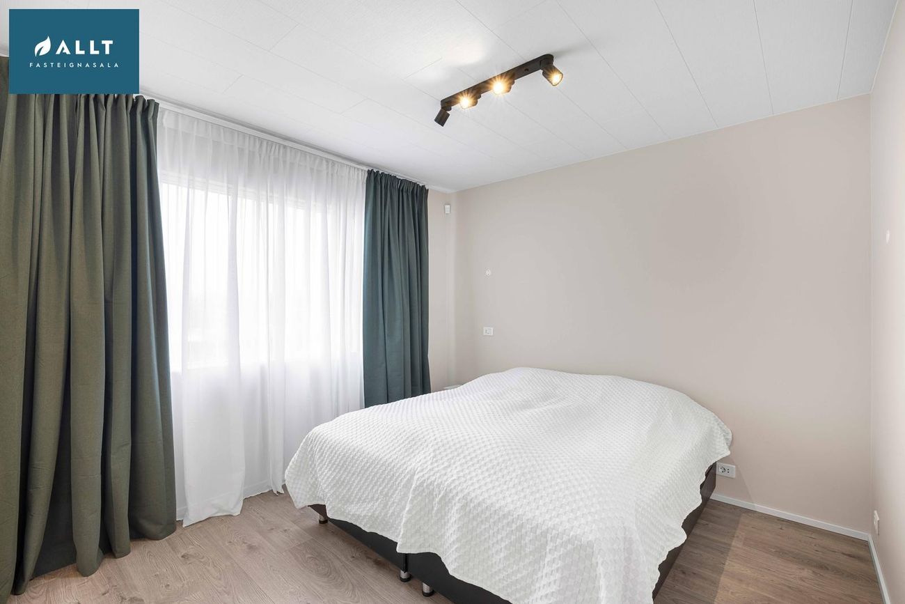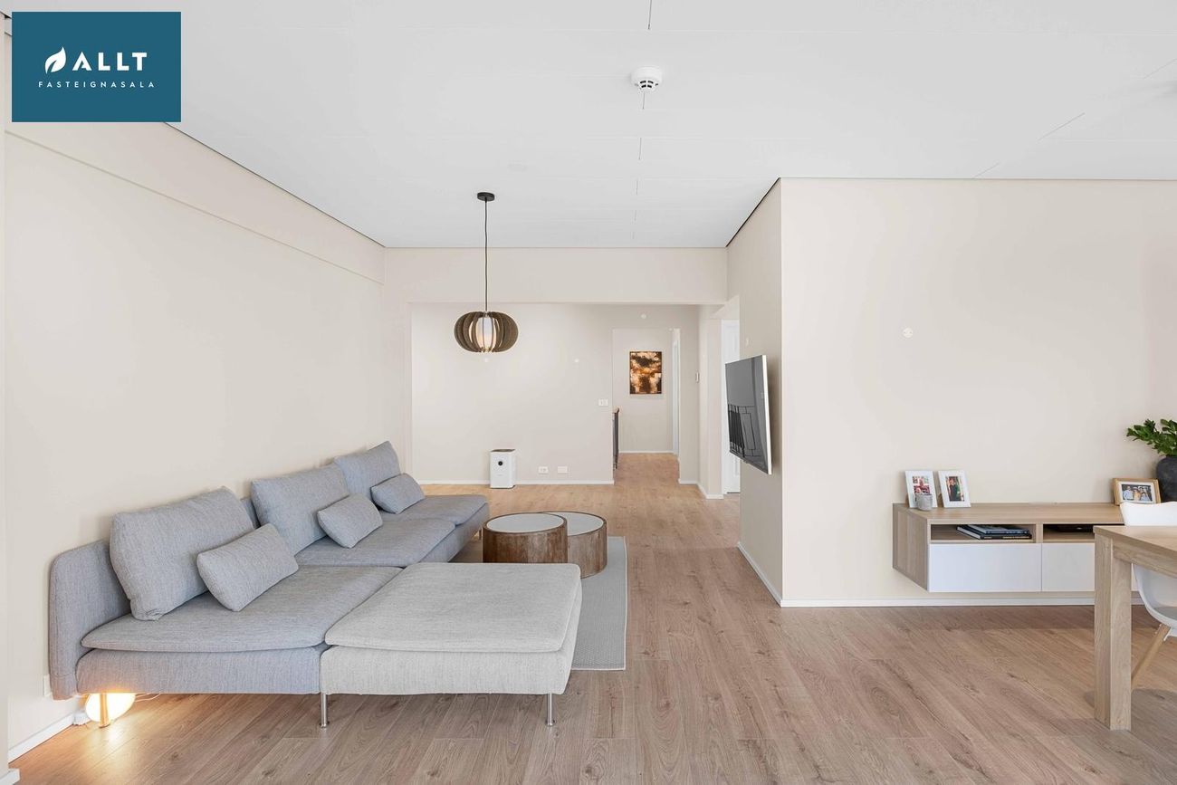144,5 m² íbúð á eignarlóð með 4 svefnherbergjum, rúmgóðri stofu og borðstofu, eldhúsi, þvottahúsi, baðherbergi og forstofu. Nýlega endurnýjað með gólfhita, parketgólfum og nútímalegum innréttingum.