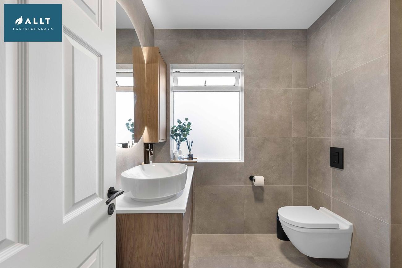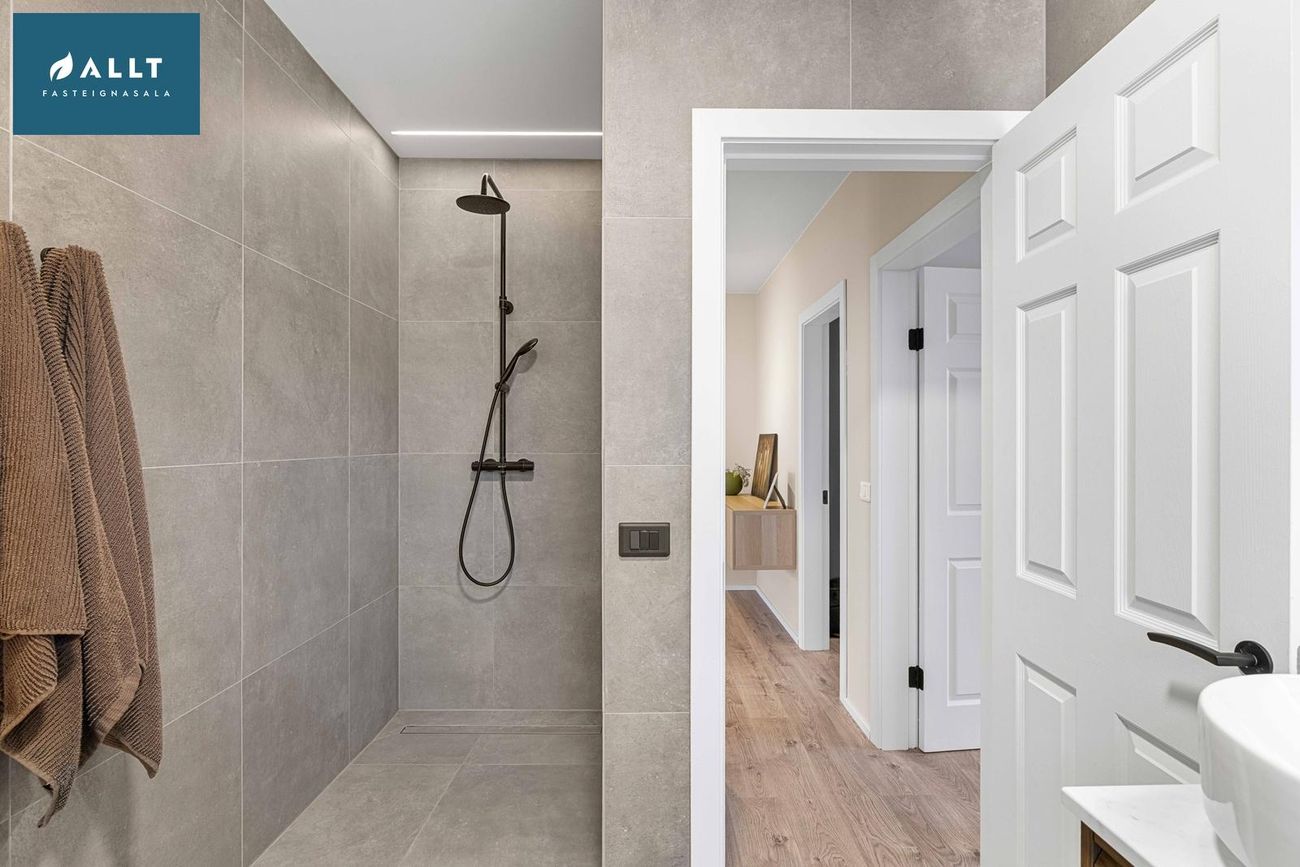 Endurnýjað baðherbergi með stórri innbyggðri sturtu, nýjum tækjum, flísum frá Birgisson og spegli með lýsingu og hita.