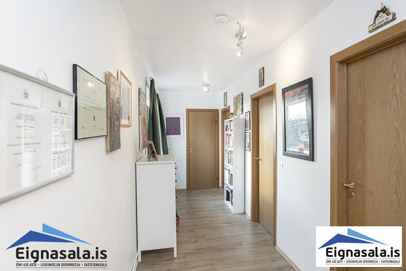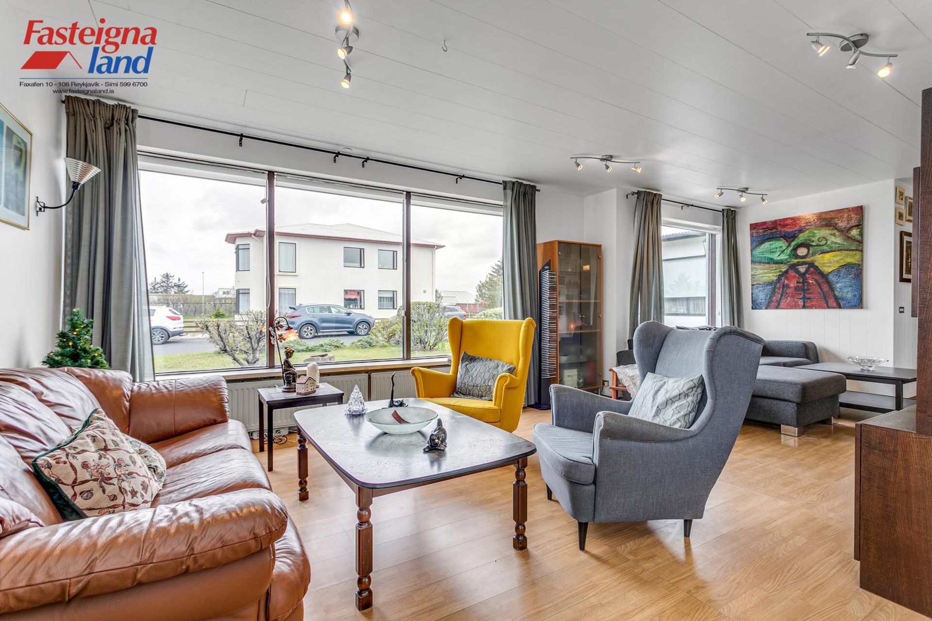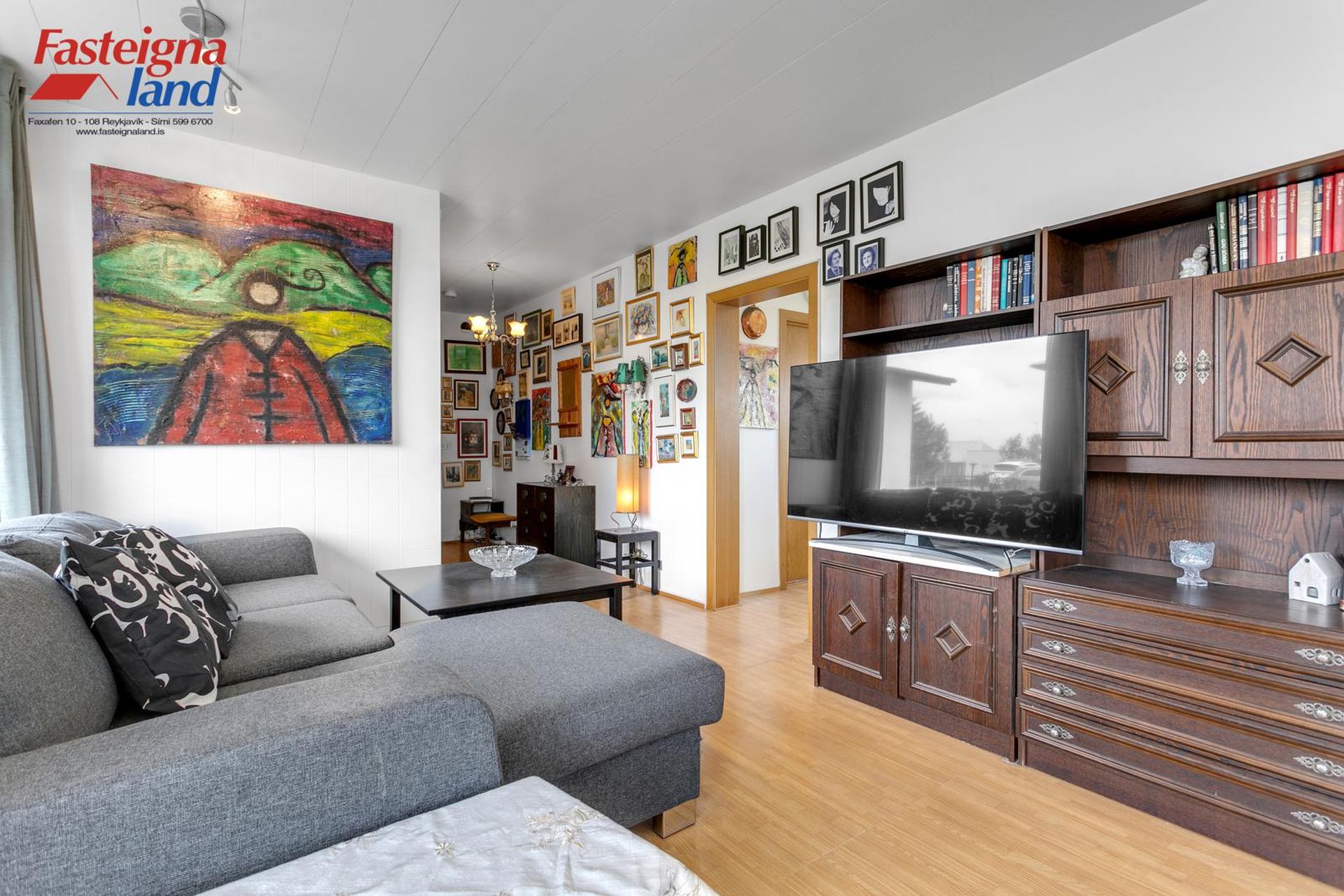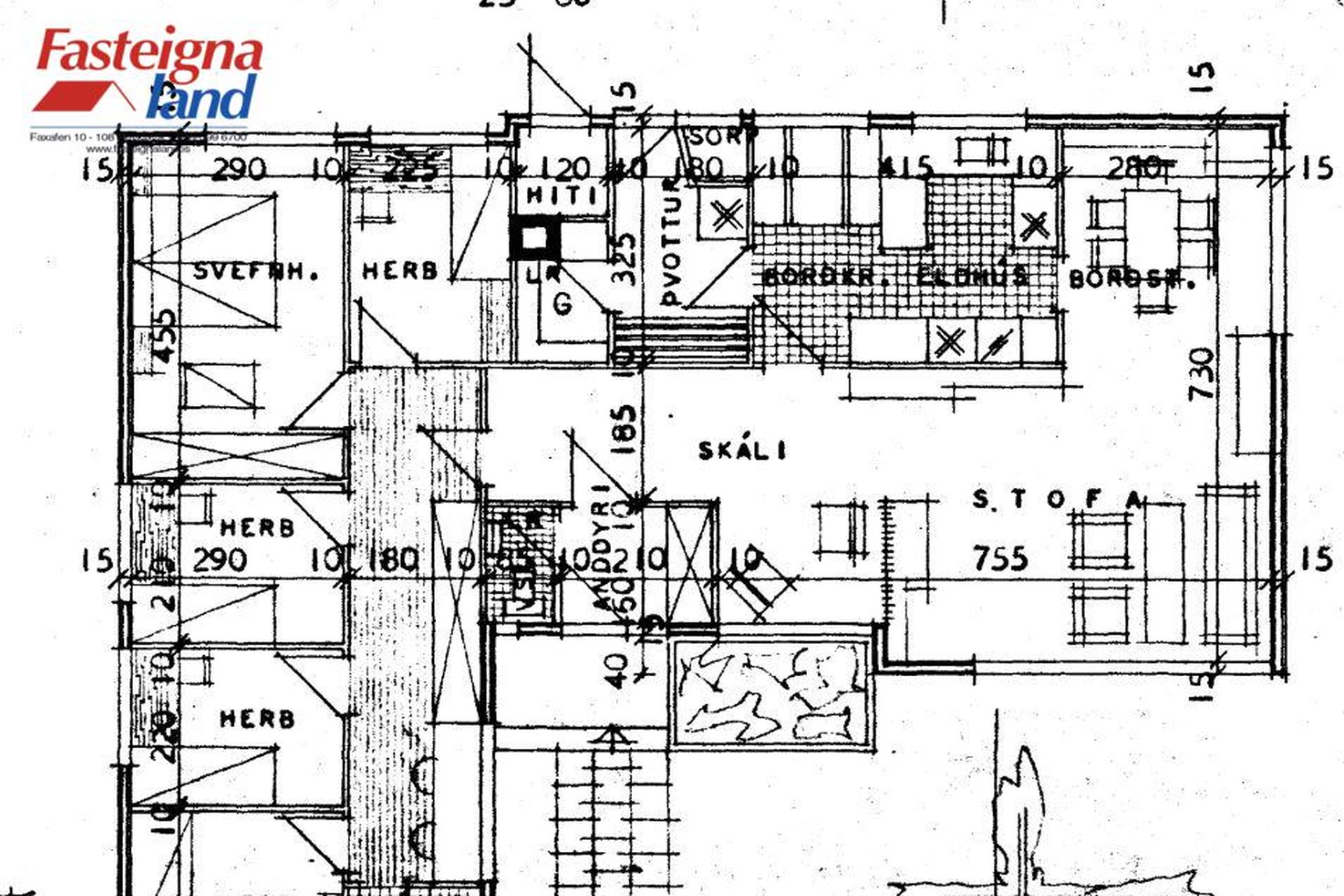 Flísar í anddyri og baðherbergi, harðparket í stofu, borðstofu og herbergjum, léttir innveggir.
