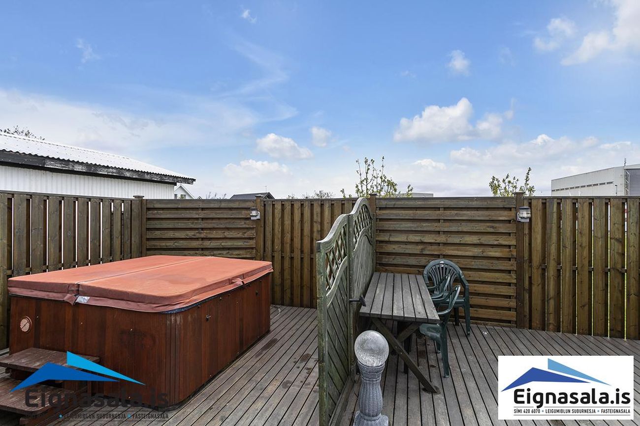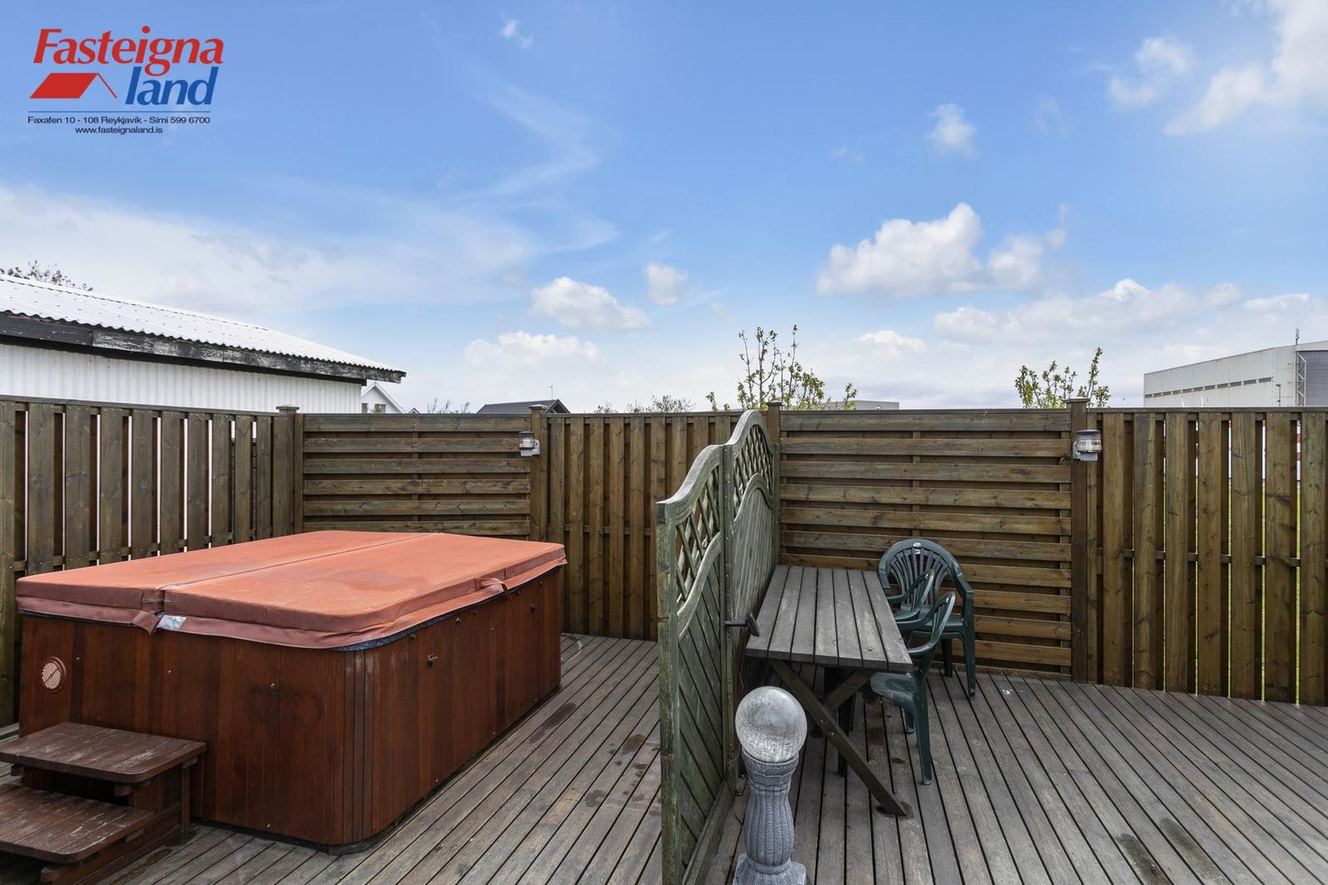 Stór lokaður sólpallur á baklóð með heitum potti.