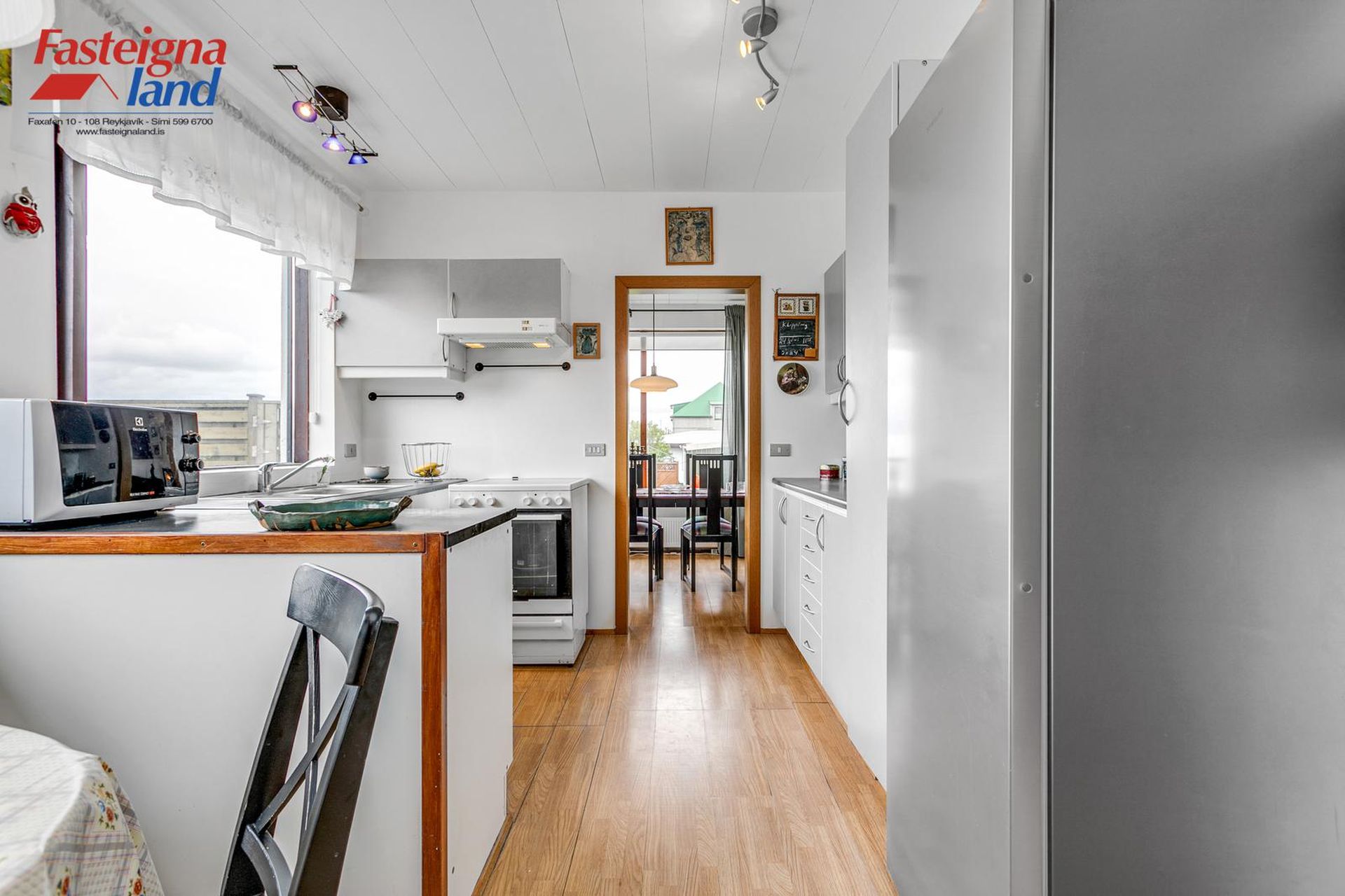 Eldhús með eldri innréttingu og nýlegu harðparketi. Þvottahús innan eldhúss með útgöngu á sólpall.