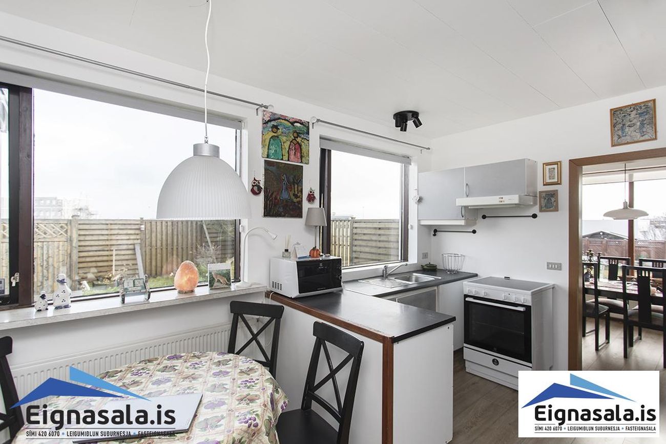 Þvottahús innan eldhúss með útgöngu á sólpall.