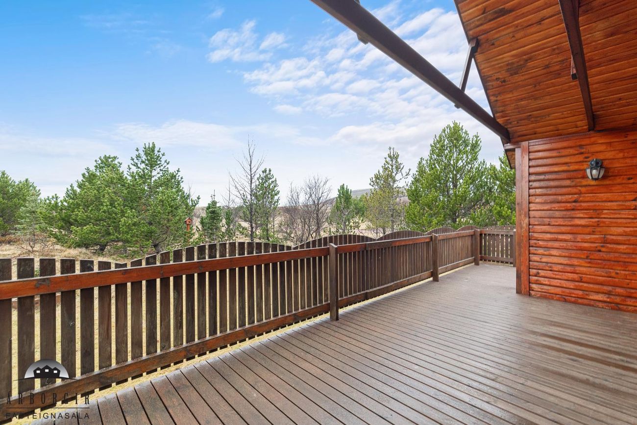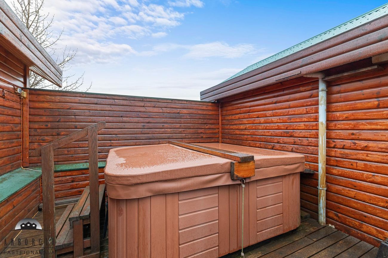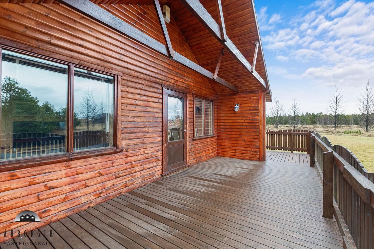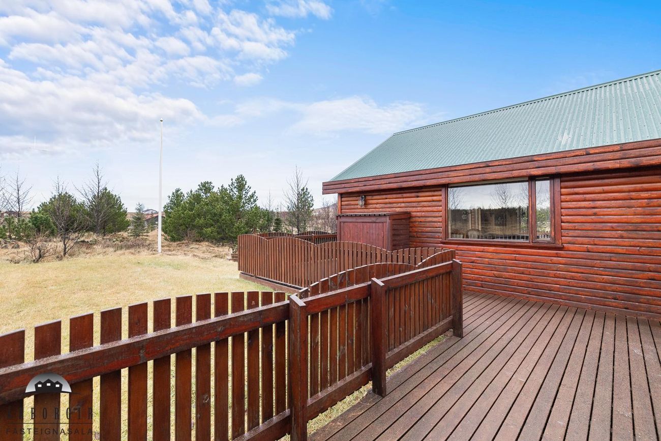 Stór sólpallur með heitum potti er við húsið, lóðin er stór 10.300m2 og er hún öll gróin og falleg.