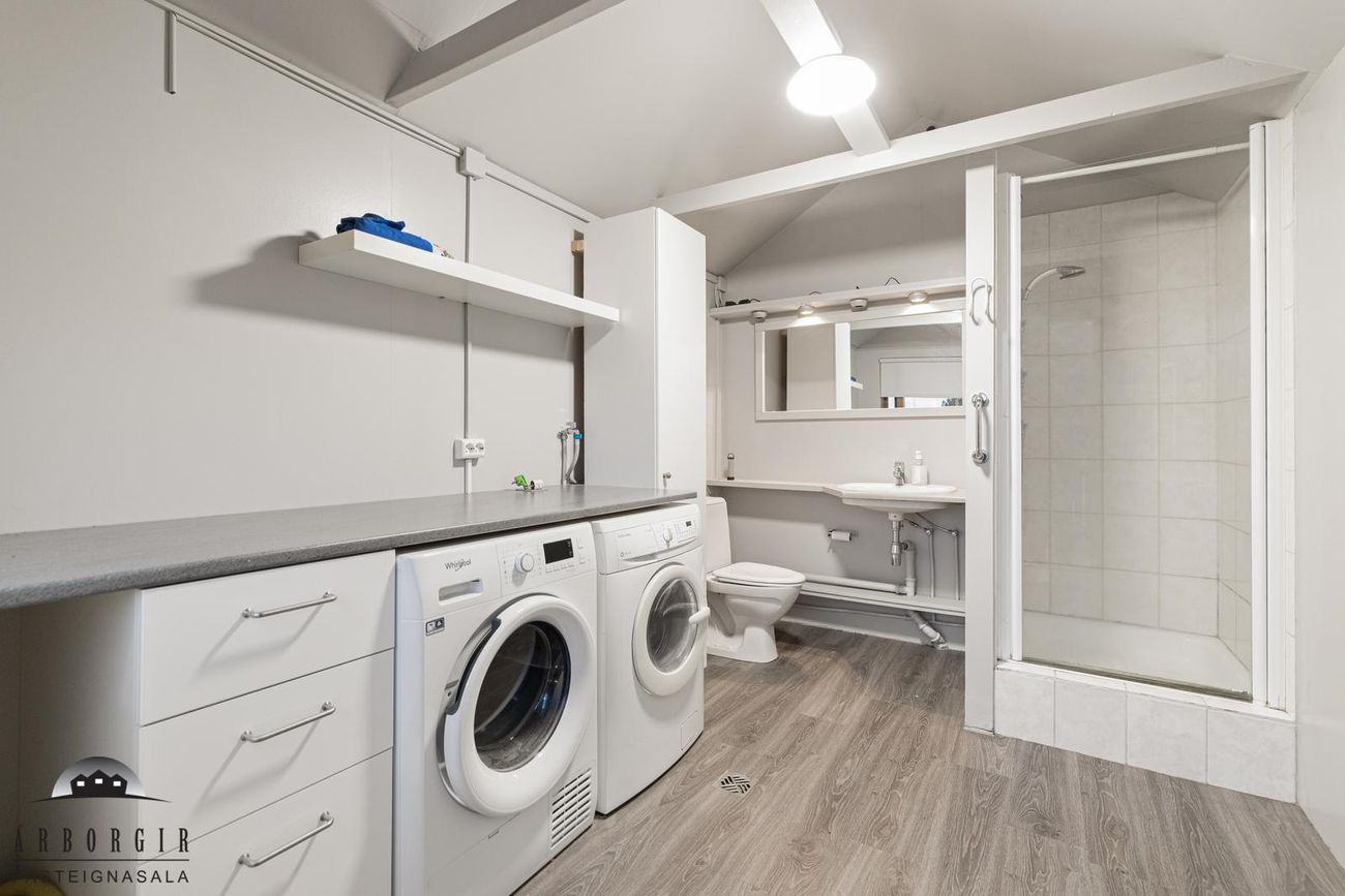 Þvottahúsið/baðhebergið er með innrétingu fyrir tæki og þar er salerni og sturta