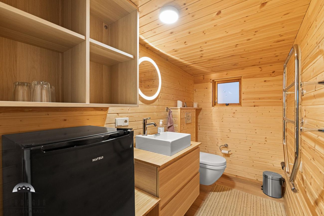 Gestahúsið skiptist í setustofu, salerni og herbergi, parket er á gólfi.